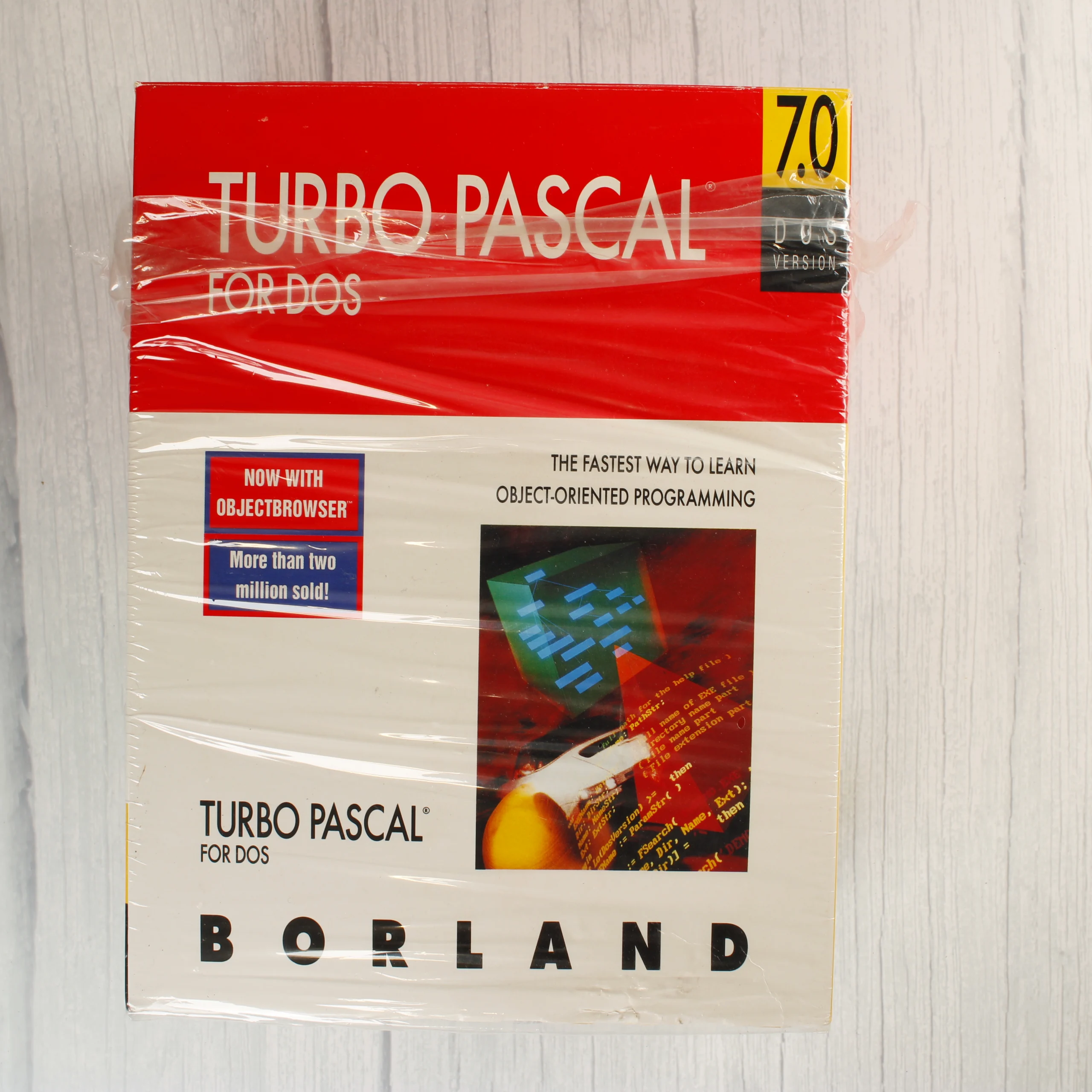A Borland Turbo Pascal 7.0 for DOS szoftvercsomagja eredeti dobozban. A készlet tartalmazza a Turbo Pascal 7.0 felhasználói kézikönyvét, a Turbo Vision programozási útmutatót, valamint egy 3,5 colos floppy lemezt, amely átlátszó védőtasakban található. A külső papírdoboz piros és fehér alapszínű, rajta a Borland logóval és a szoftver verziószámával. A csomagolás részben fóliázott, a belső dokumentációk és az adathordozó tiszta, megkímélt állapotban vannak. A doboz hátoldalán részletes angol nyelvű termékleírás és funkciólista látható. A kiadvány az objektumorientált programozás elsajátítását segítő eszközöket és teljes dokumentációt kínál.