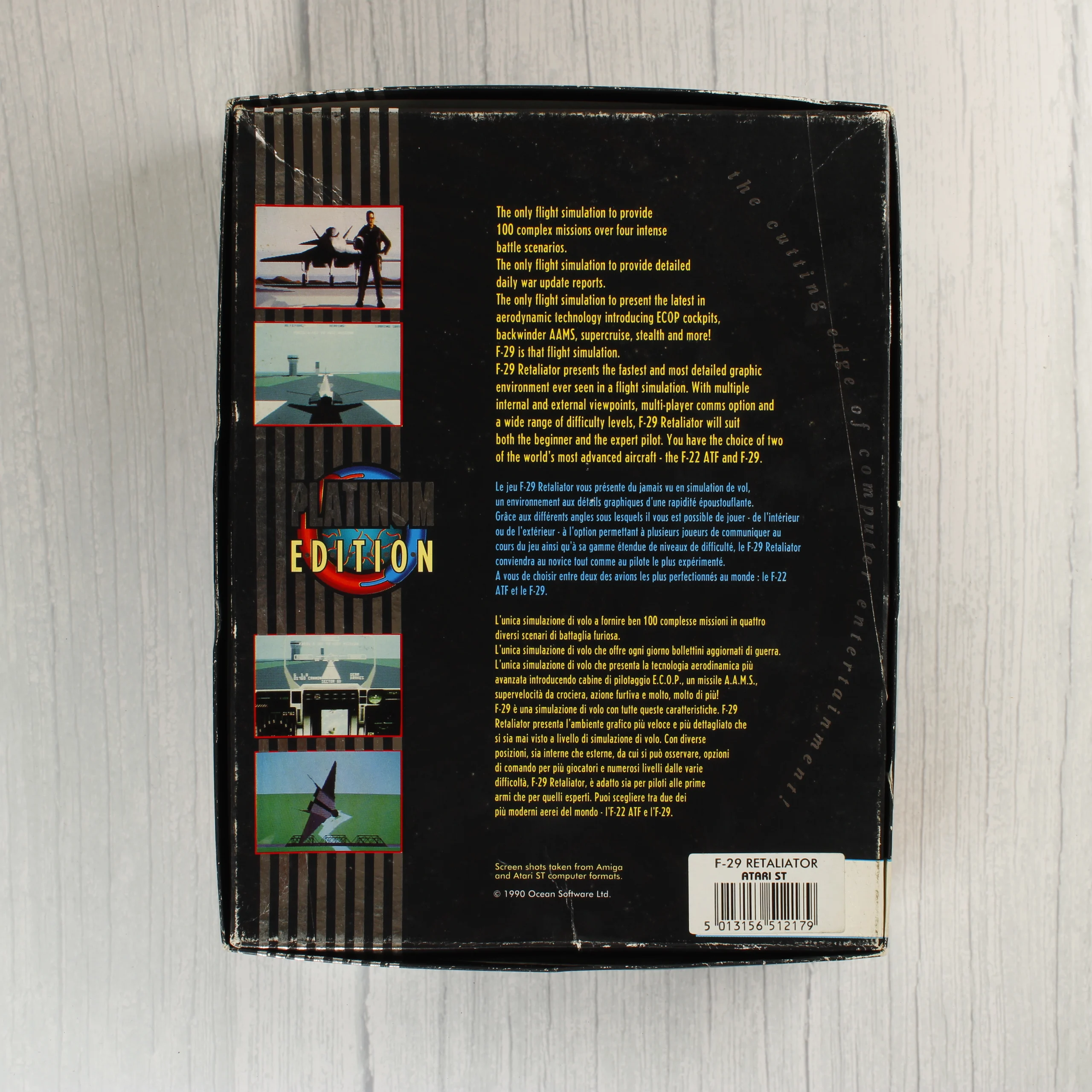 Az F-29 Retaliator egy repülőgép-szimulátor videójáték Atari ST platformra, a Hit Squad Platinum Edition kiadásában. A csomag tartalmazza az eredeti kartondobozt, egy fekete-fehér használati útmutatót és egy kék színű, 3,5 colos floppy lemezt. A doboz elején egy vadászgép látható vörös és narancssárga háttér előtt, valamint a Hit Squad és a Platinum Edition logói. A hátoldalon angol, francia és olasz nyelvű leírás olvasható a játékról, négy képernyőmentéssel illusztrálva. A floppy lemezen fehér felirat jelzi a játék címét és a platformot. A kiadvány az Ocean Software gondozásában jelent meg 1990-ben.