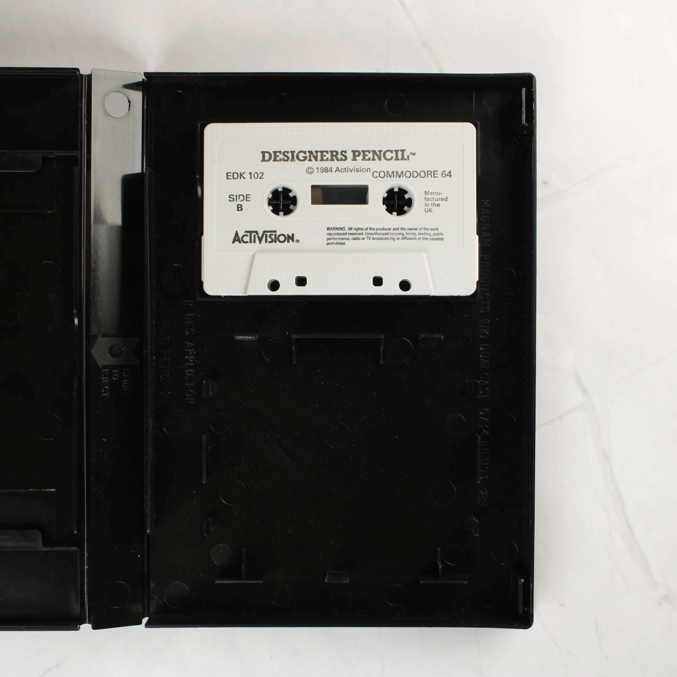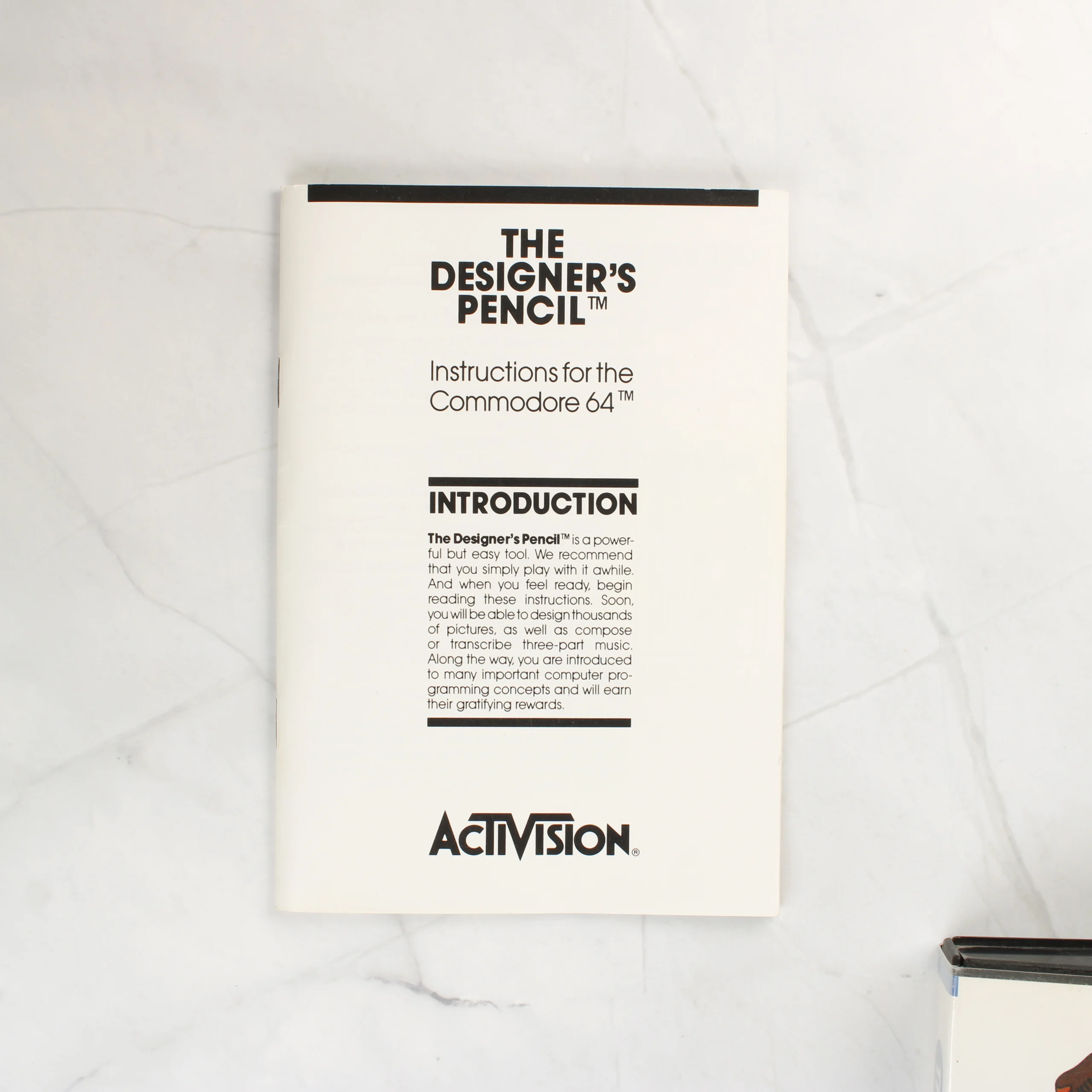 Az Activision által kiadott The Designer's Pencil egy kreatív szoftver Commodore 64 platformra. A csomag tartalmazza az eredeti fekete műanyag tokot, a színes illusztrációval ellátott papírborítót, egy fehér színű mágnesszalagos kazettát és egy nyomtatott használati útmutatót. A borítón egy nagyméretű ceruza látható, amely körül különféle rajzolt motívumok, épületek és figurák helyezkednek el. A kazetta címkéje fehér, fekete feliratokkal, amelyen szerepel a termék neve, a kiadó logója és a gyártási év. A használati útmutató letisztult, fekete-fehér dizájnnal rendelkezik, és részletes instrukciókat tartalmaz a program használatához. A hátoldalon képernyőmentések és rövid leírások mutatják be a szoftver funkcióit.