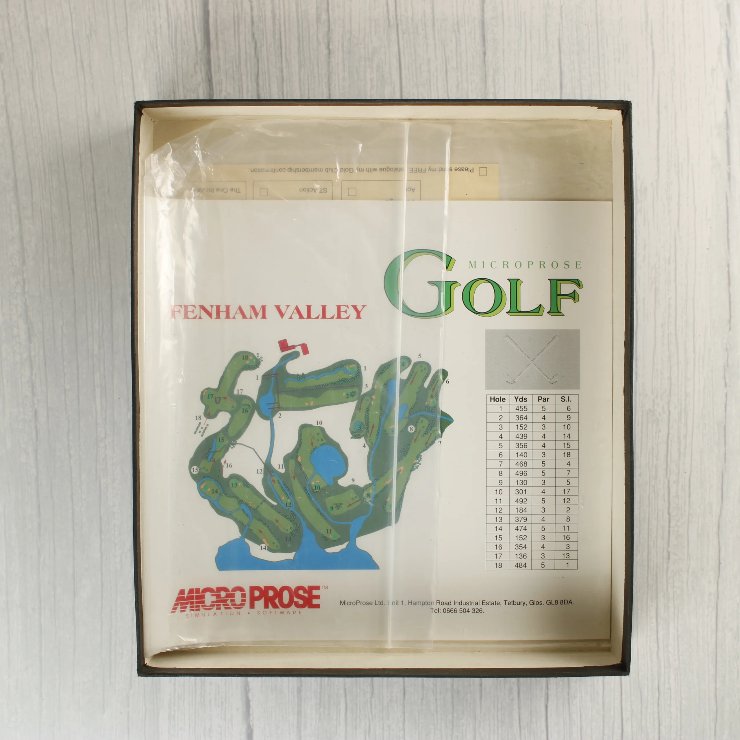 A MicroProse Golf egy klasszikus sport szimulációs videójáték Amiga platformra. A csomag tartalmazza az eredeti, színes illusztrációval ellátott kartondobozt, amelyen egy golfozó lába és egy golfütő látható a zöld gyepen. A doboz belsejében három darab kék színű, 3,5 colos floppy lemez található, amelyek a programot és a pályákat tartalmazzák. A készlet részét képezi továbbá egy fekete borítós használati útmutató és egy Fenham Valley pályatérképet ábrázoló nyomtatott melléklet. A doboz élei mentén enyhe kopás látható, de a tartalom hiánytalannak és megkíméltnek tűnik. A lemezek címkéi épek, a nyomtatott anyagok tiszták, gyűrődésmentesek.