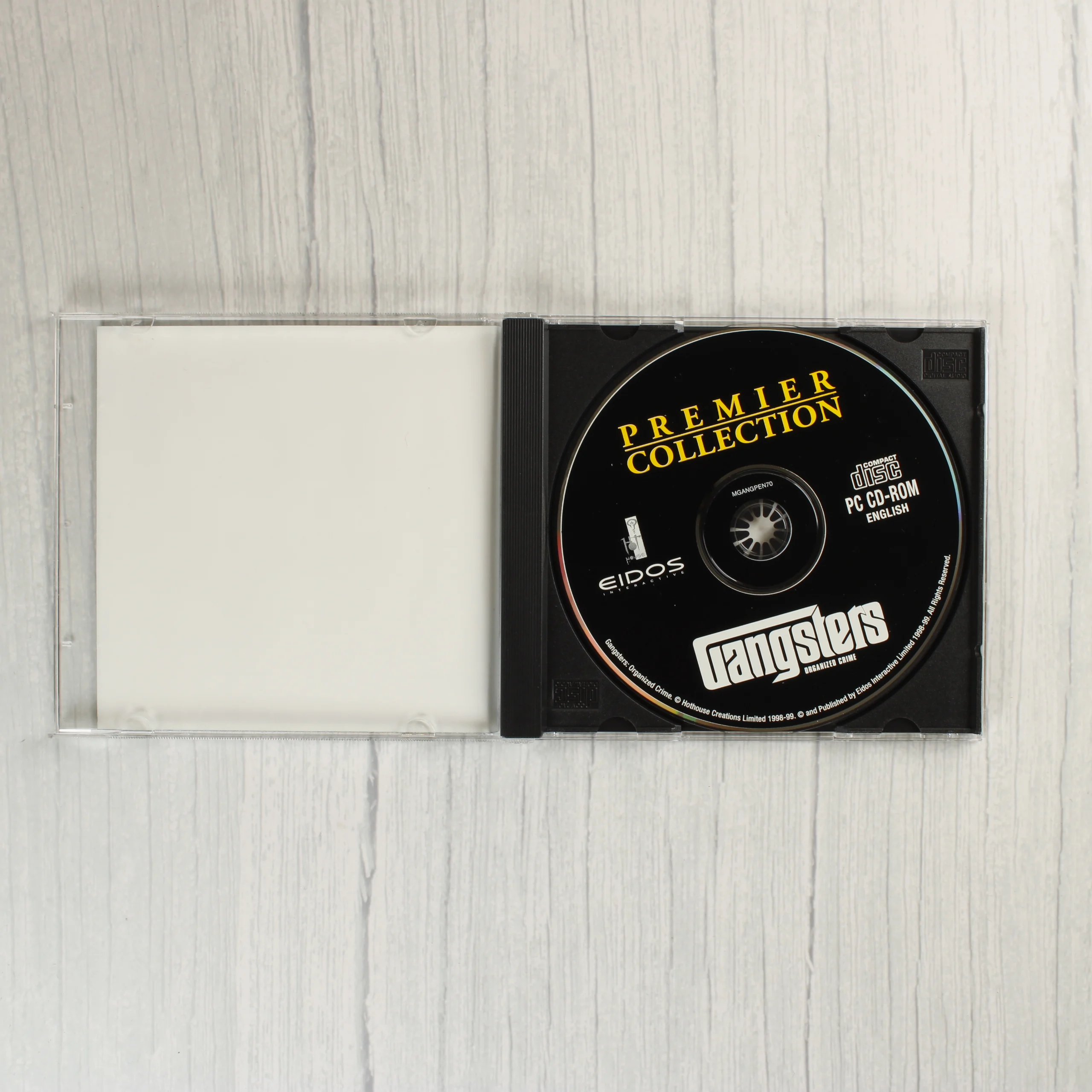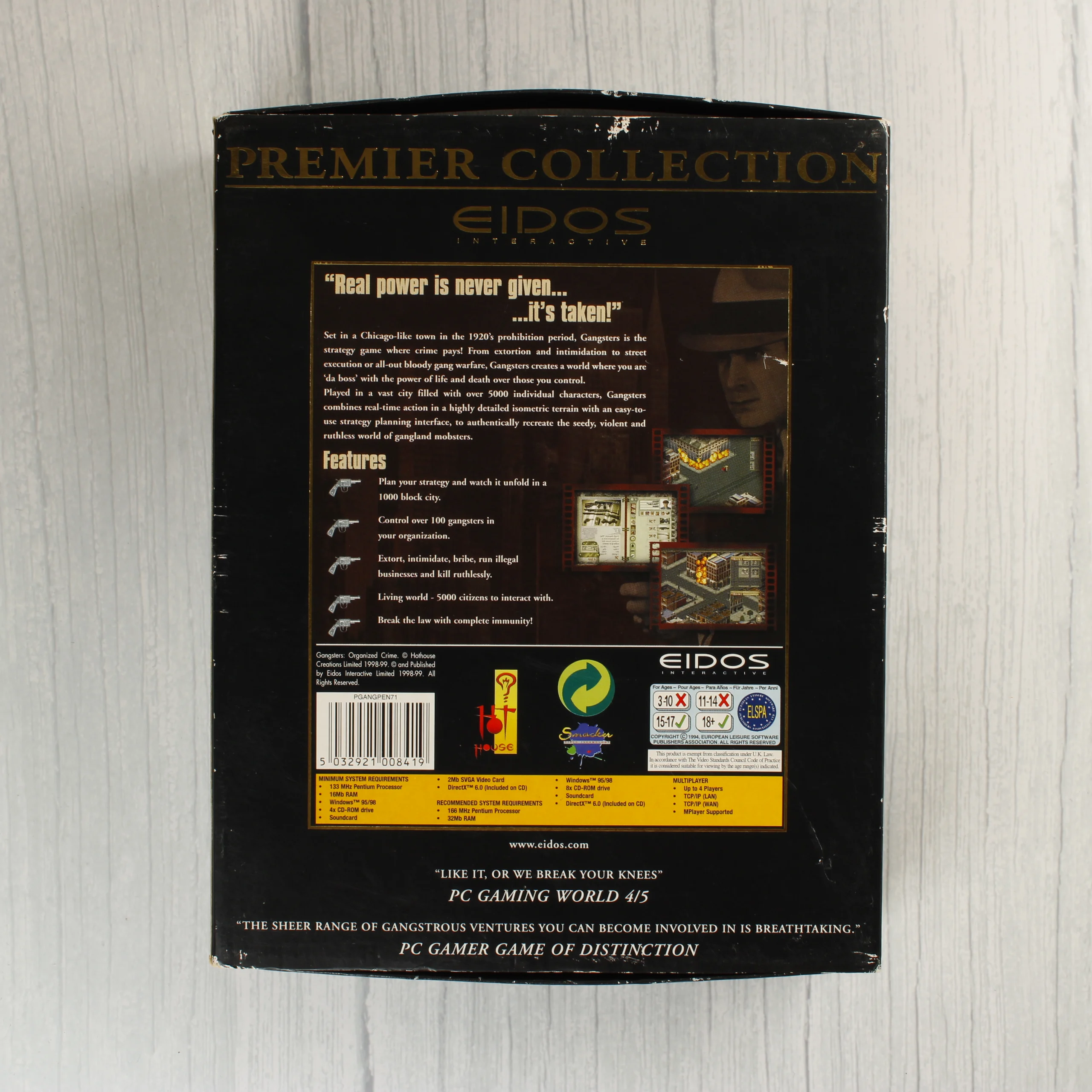 A Gangsters: Organized Crime egy PC-re megjelent stratégiai videójáték, amely a Premier Collection sorozat részeként került kiadásra. A termék egy nagyméretű, fekete alapszínű kartondobozban található, amelynek elején a játék címe és egy maffia témájú illusztráció látható. A csomag tartalmaz egy normál CD-tokot, amelyben a játékot tartalmazó CD-ROM lemez foglal helyet. A doboz hátoldalán a játék jellemzői, képernyőképek és a rendszerkövetelmények olvashatók. A csomagolás maffiózókat ábrázoló grafikával és aranyozott feliratokkal van díszítve. A kiadvány angol nyelvű, és az Eidos Interactive gondozásában jelent meg. A belső fekete kartonbetét stabilan tartja a CD-tokot a dobozon belül.