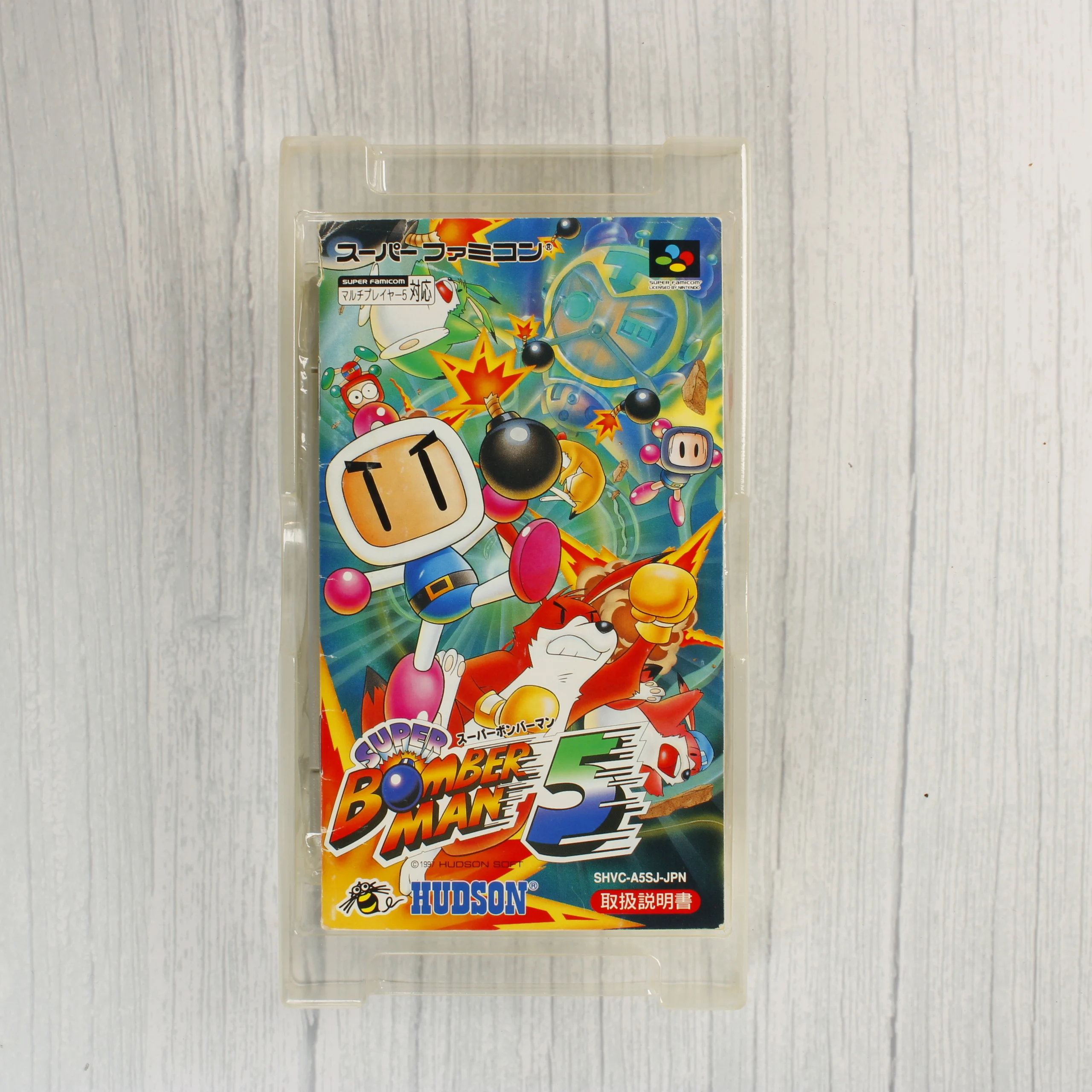 A Super Famicom konzolra megjelent Super Bomber Man 5 videójáték japán kiadása. A csomag tartalmazza az eredeti színes kartondobozt, a használati útmutatót és a szürke műanyag házas cartridge-et, amely egy átlátszó műanyag tálcában helyezkedik el. A doboz elején a sorozat jellegzetes karakterei és robbanások láthatók élénk színekkel. A hátoldalon japán nyelvű leírás és játékmenet-képek találhatók. A cartridge címkéje ép, a rajta lévő grafika megegyezik a dobozéval. A kiadvány a Hudson Soft gondozásában jelent meg 1997-ben.