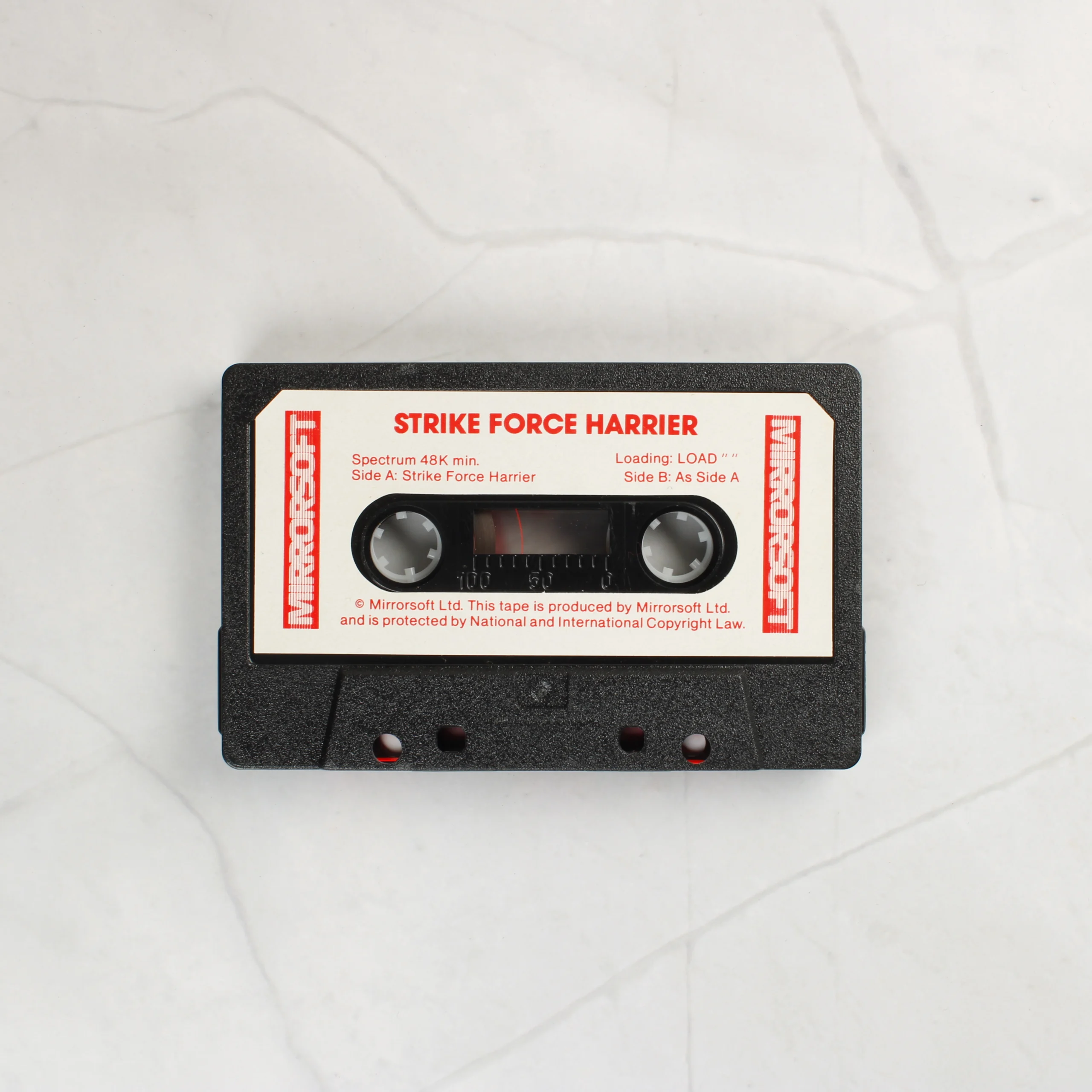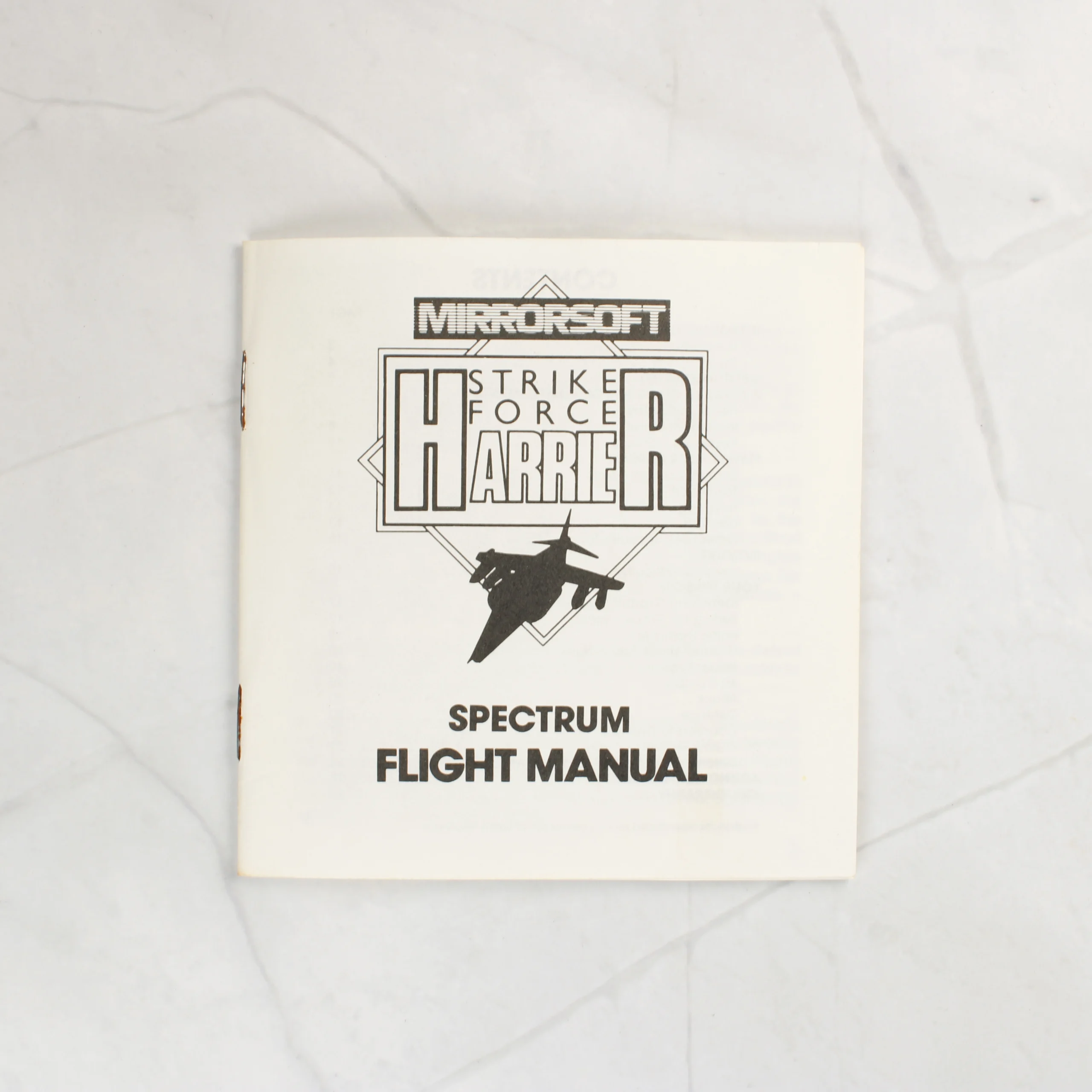 A Strike Force Harrier egy ZX Spectrum platformra megjelent repülőgép-szimulátor videójáték, amelyet a Mirrorsoft adott ki. A csomag tartalmazza az eredeti műanyag tokot a színes borítóval, egy fekete színű magnókazettát fehér címkével, valamint a többlapos, angol nyelvű használati útmutatót. A borítón egy Harrier vadászgép látható bevetés közben, alatta egy harckocsival. A kazetta címkéjén piros feliratok jelzik a játék címét és a betöltési utasításokat. A kézikönyv részletes ábrákat tartalmaz a pilótafülke műszereiről és a játék irányításáról. A termék korának megfelelő, megkímélt állapotban van, a papír alapú mellékletek épek, a műanyag tokon minimális felületi karcok láthatók.