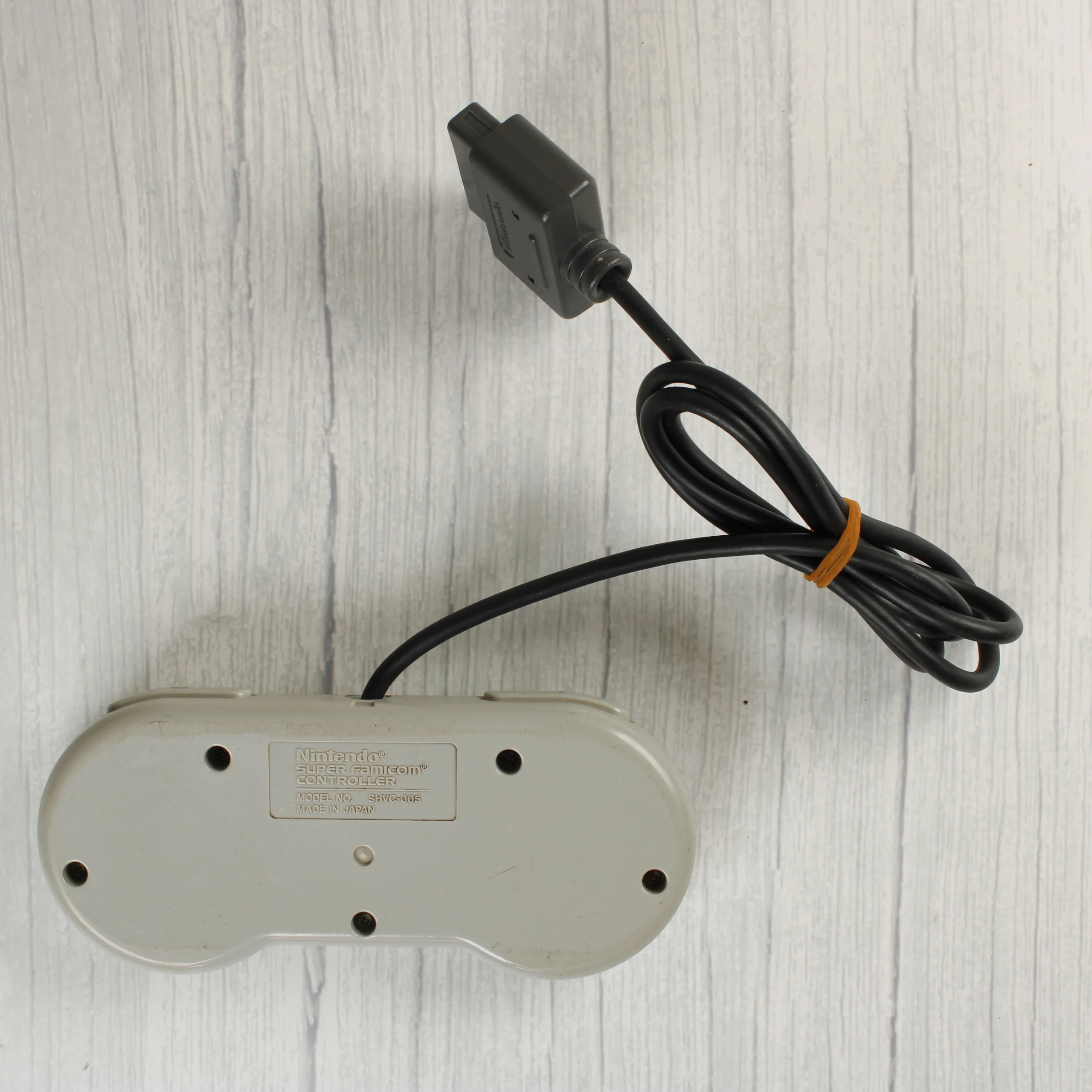 Eredeti Nintendo Super Famicom kontroller, amely a klasszikus szürke színben pompázik. Az eszköz elején a Nintendo Super Famicom logó látható. A vezérlő négy színes akciógombbal (kék, piros, sárga, zöld), egy sötétszürke irányválasztóval, valamint Select és Start gombokkal rendelkezik. A tetején két vállgomb található. A fekete kábel végén egyedi Nintendo csatlakozó van, a kábel egy gumiszalaggal van összefogva. A hátoldalon a gyártói adatok és az SHVC-005 modellszám olvasható. A műanyag burkolaton enyhe használati nyomok és apróbb karcolások láthatók, de az eszköz szerkezetileg ép.