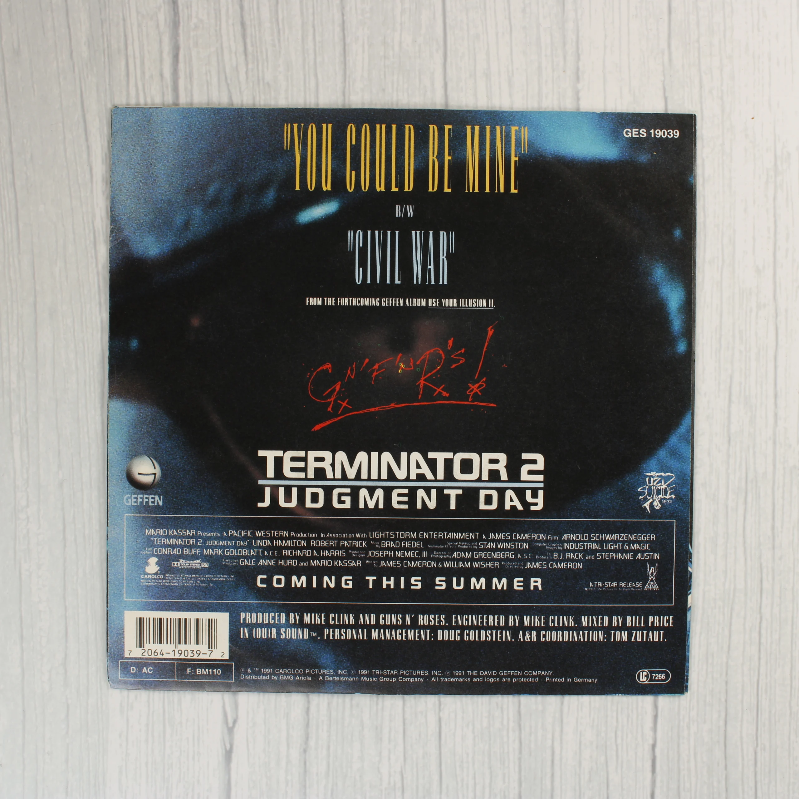 A Guns N' Roses együttes You Could Be Mine című kislemeze, amely a Terminator 2: Az ítélet napja című film betétdala. A borító előlapján Arnold Schwarzenegger látható a filmből ismert bőrdzsekis, napszemüveges karakterében, egy motorkerékpáron ülve, kezében puskával. A hátsó borítón a dalcímek mellett a film stáblistája, a Geffen Records logója és egy vonalkód szerepel. A papírtok élei mentén enyhe kopás és benyomódás látható, de a grafika ép és a színek megőrizték élénkségüket. A kiadvány a Civil War című dalt is tartalmazza a B-oldalon. A termék egy klasszikus 7 colos bakelit lemez borítója.