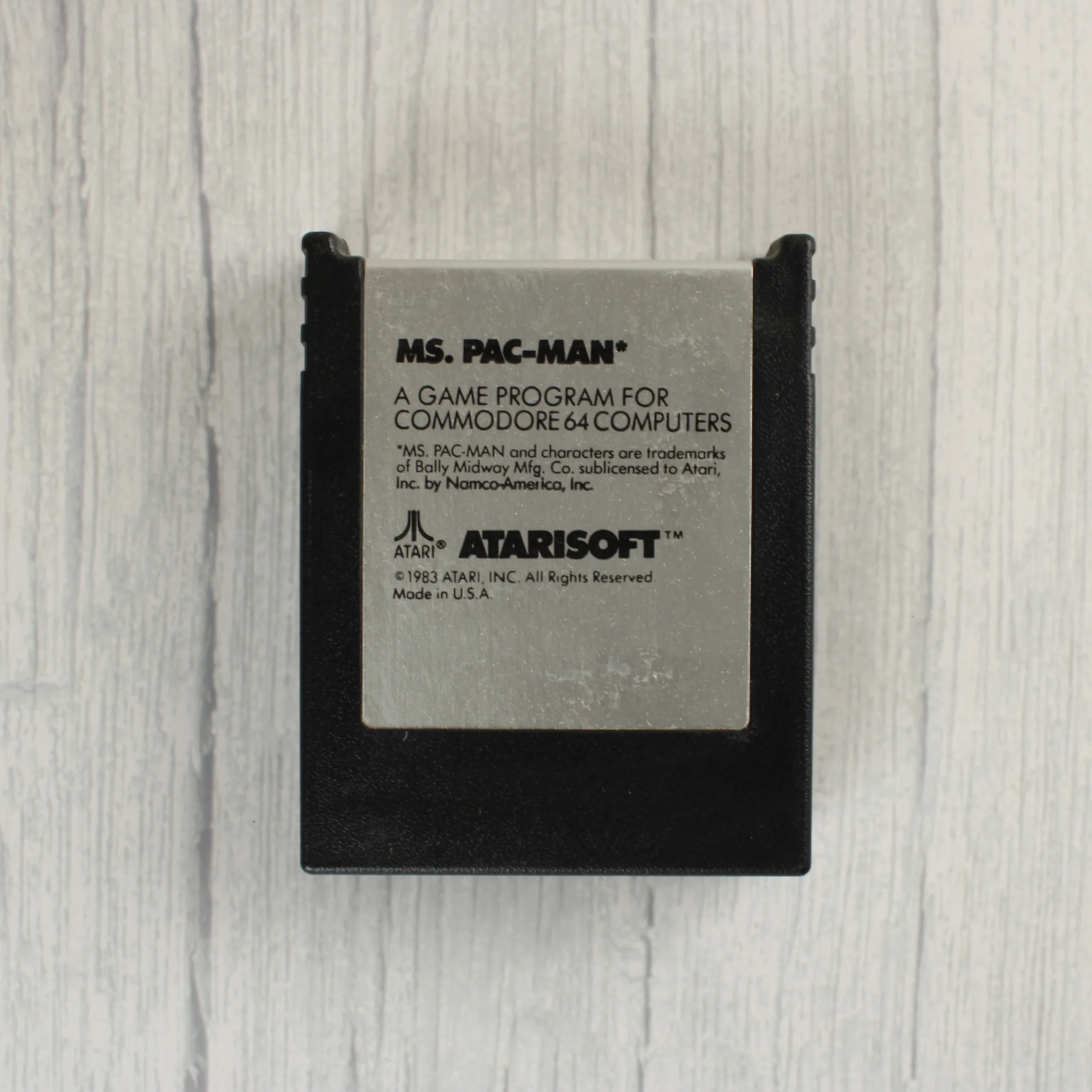 Ez a Commodore 64 számítógépekhez készült Ms. Pac-Man videójáték cartridge fekete műanyag házzal és ezüstszínű fém előlappal rendelkezik. Az előlapon fekete felirat olvasható, amely tartalmazza a játék címét, a gyártó Atarisoft logóját, valamint az 1983-as szerzői jogi adatokat. A cartridge háza téglalap alakú, felső részén kétoldalt bordázott fogófelülettel a könnyebb behelyezés érdekében. A fémlemez felülete enyhén karcos, a fekete műanyag részeken pedig minimális használati nyomok láthatóak. A hátoldalon egy üres, felirat nélküli ezüstszínű fémlemez található. A termék fizikai állapota korának megfelelő, szerkezetileg ép.