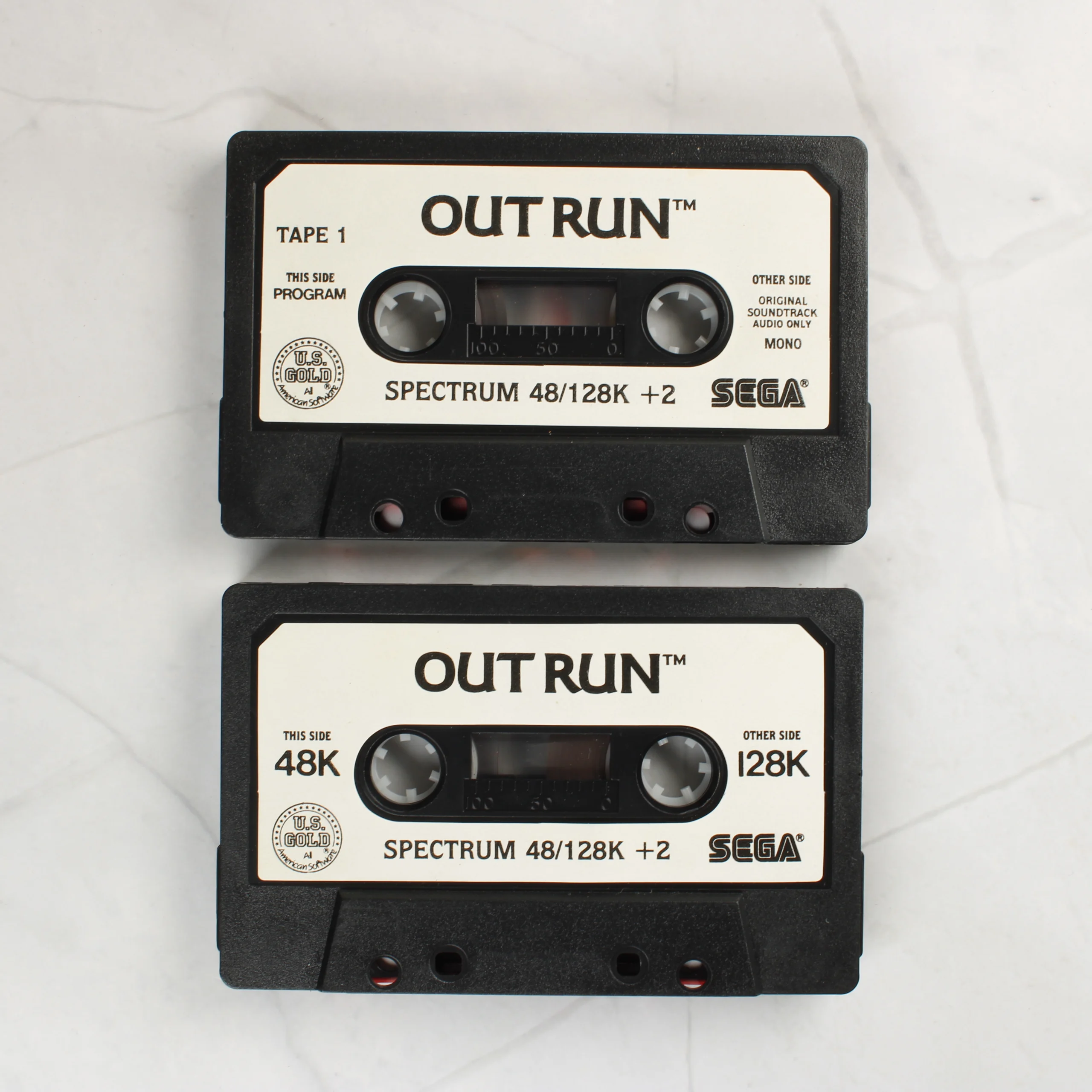 Eredeti Out Run videójáték ZX Spectrum 48/128K +2 számítógépre. Kétkazettás kiadás eredeti játéktermi zenével, U.S. Gold és Sega licenc alapján.