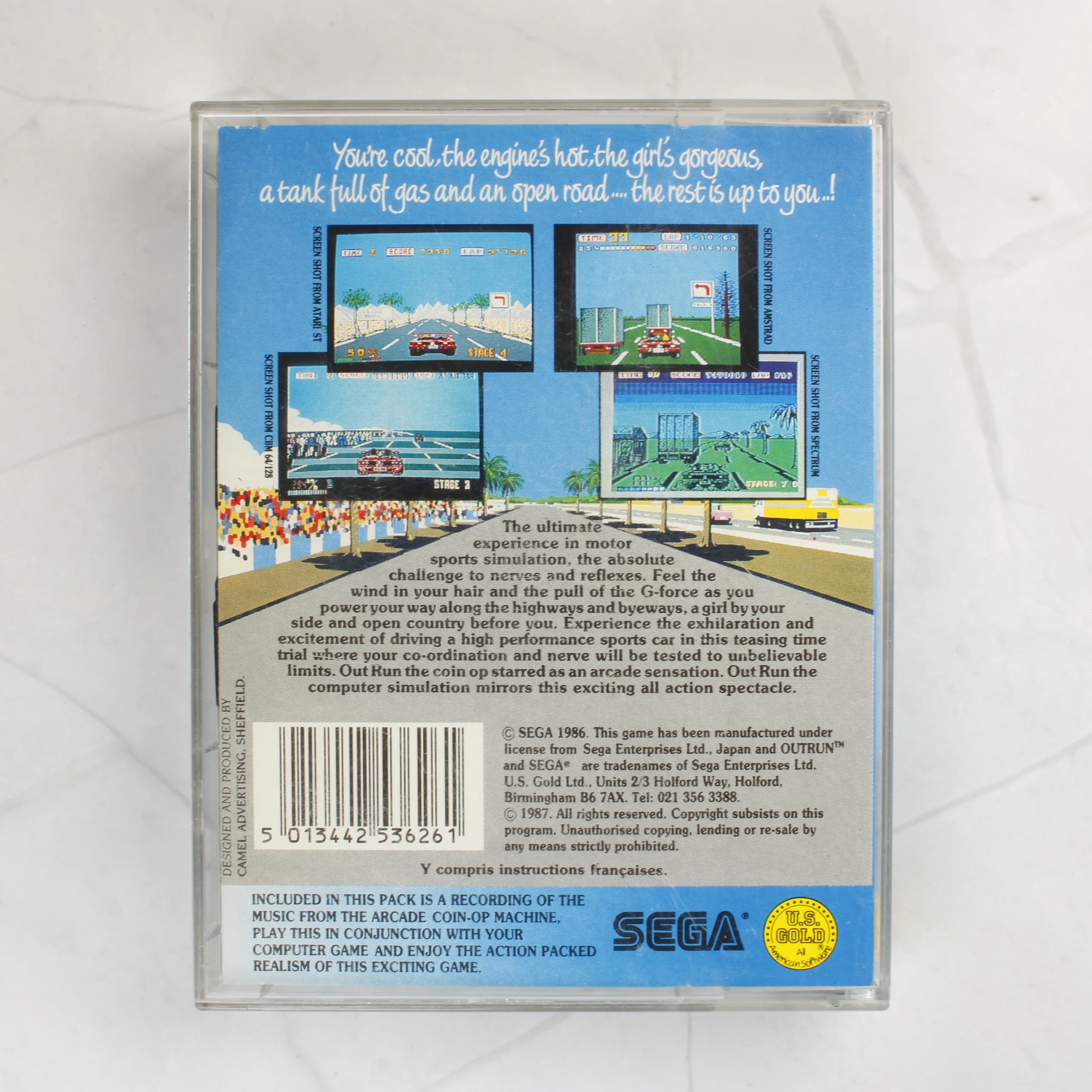 Az Out Run videójáték ZX Spectrum 48/128K +2 platformra készült kiadása. A csomag két darab fekete műanyag kazettát tartalmaz, amelyek fehér papírcímkével vannak ellátva. Az első kazetta egyik oldalán a program, a másikon az eredeti játéktermi zene található mono formátumban. A második kazetta a 48K és 128K verziókat tartalmazza. A játék egy átlátszó műanyag tokban helyezkedik el, amelyben egy színes papírborító látható. A borító elején egy piros sportautó és egy pálmafás tengerparti út illusztrációja szerepel. A hátoldalon angol nyelvű leírás és különböző számítógépes platformokról származó képernyőfotók láthatóak. A kiadványt a U.S. Gold és a Sega logója díszíti.