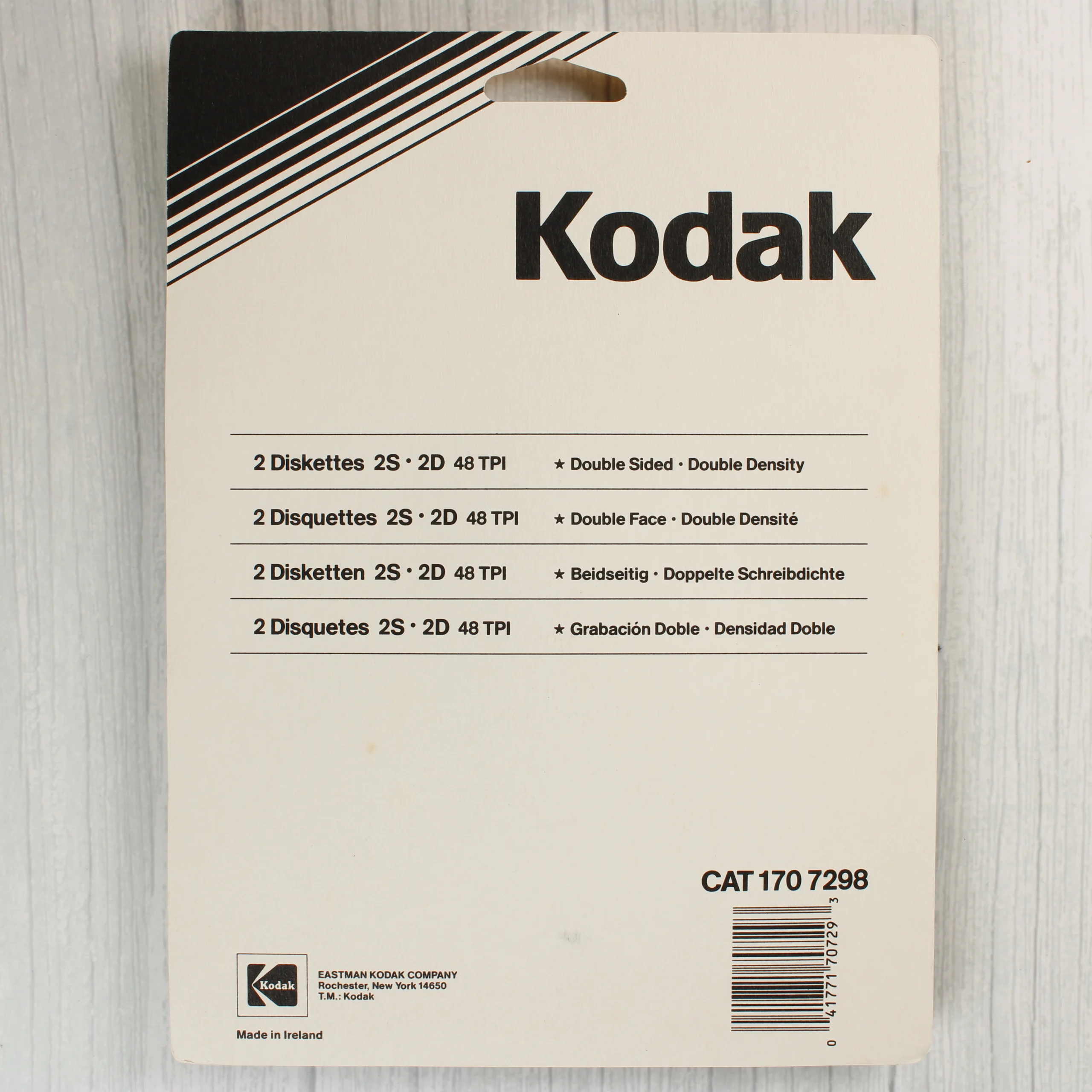 Ez a Kodak márkájú termék két darab 5,25 colos floppy lemezt tartalmaz eredeti, bontatlan bliszteres csomagolásban. A csomagolás előlapja fekete és sárga színeket használ, jól látható piros Kodak logóval és fehér '2' felirattal, amely a darabszámot jelzi. A lemezek technikai paraméterei szerint kétoldalasak és dupla sűrűségűek (2S 2D), 48 TPI felbontással. A hátoldalon több nyelven is szerepelnek a termékjellemzők, valamint látható a CAT 170 7298 katalógusszám és egy vonalkód. A csomagolás felső részén egy akasztólyuk található a bolti kihelyezéshez. A termék Írországban készült az Eastman Kodak Company számára.