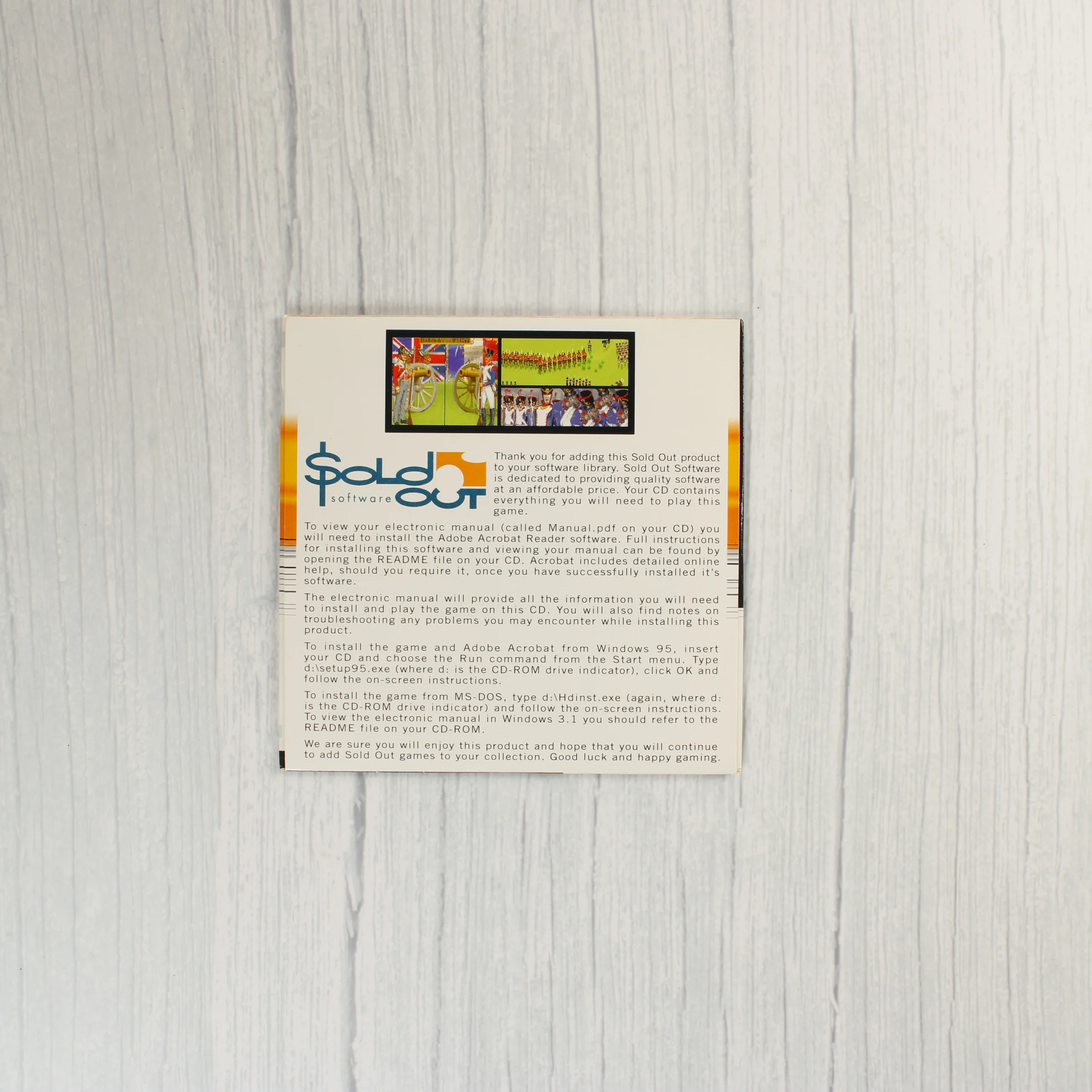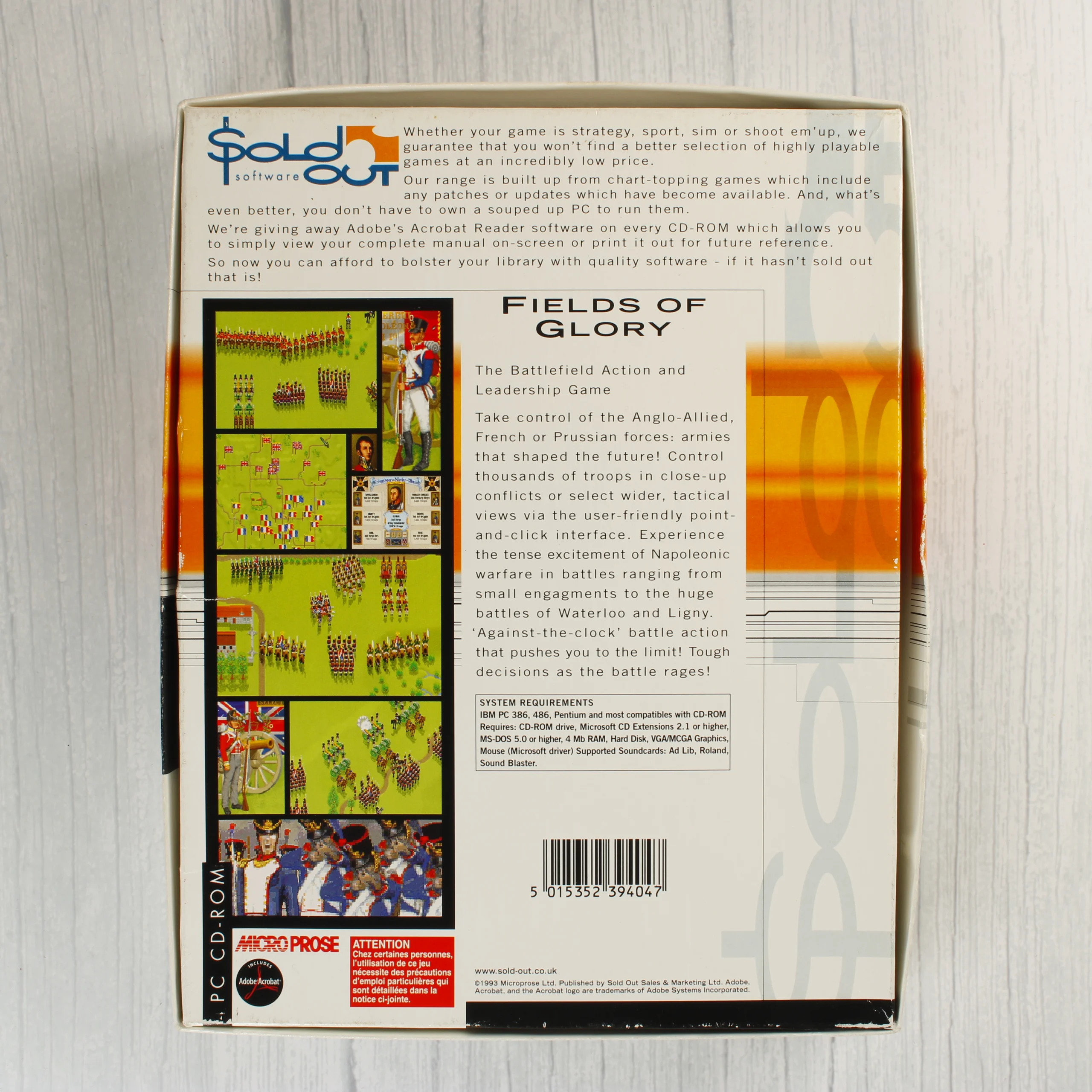 A Fields of Glory egy napóleoni háborúkat feldolgozó stratégiai videójáték PC-re, a Sold Out Software kiadásában. A csomagolás egy nagyméretű kartondobozból és egy belső papírtokból áll. A borítón egy látványos csatajelenet látható lovas és gyalogos katonákkal, a MicroProse logójával kiegészítve. A hátoldalon angol nyelvű leírás olvasható a játékmenetről, valamint képernyőmentések mutatják be a taktikai nézetet és a csatatereket. A rendszerkövetelmények között szerepel az IBM PC 386/486 processzor, 4 MB RAM és MS-DOS 5.0 vagy újabb operációs rendszer. A kiadvány tartalmazza az Adobe Acrobat Reader szoftvert is a digitális kézikönyv megtekintéséhez. A doboz elején egy korábbi árcímke eltávolításának nyoma látható.
