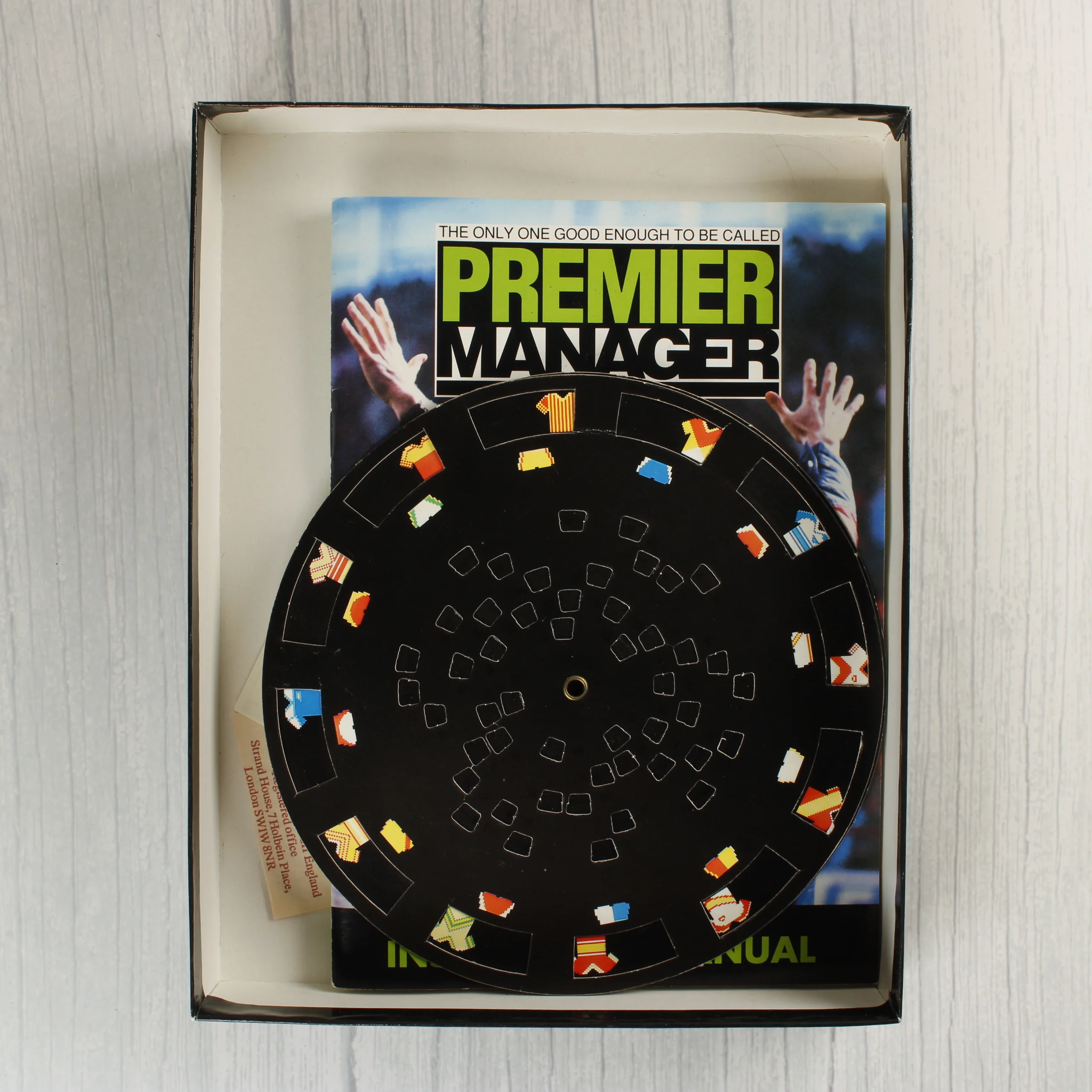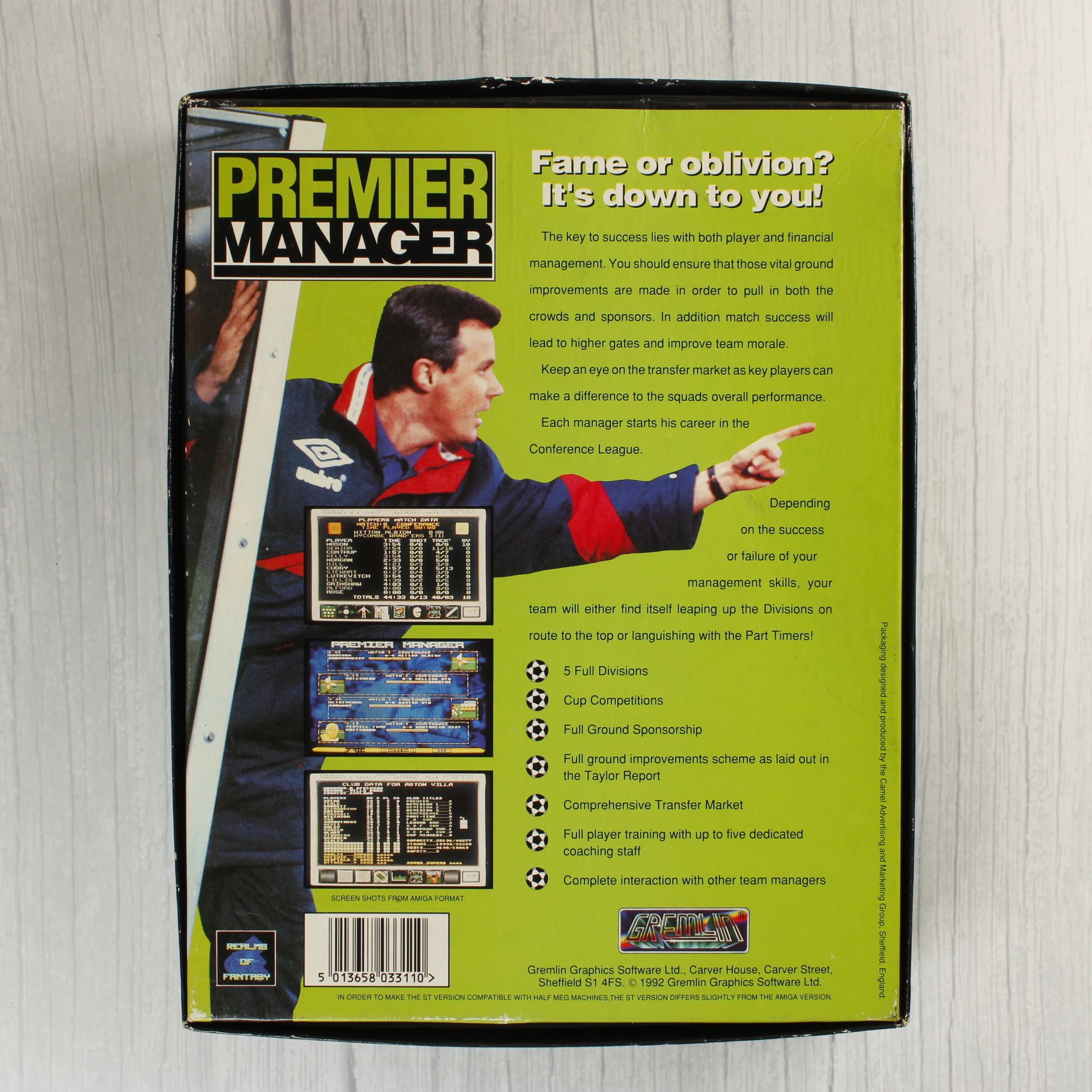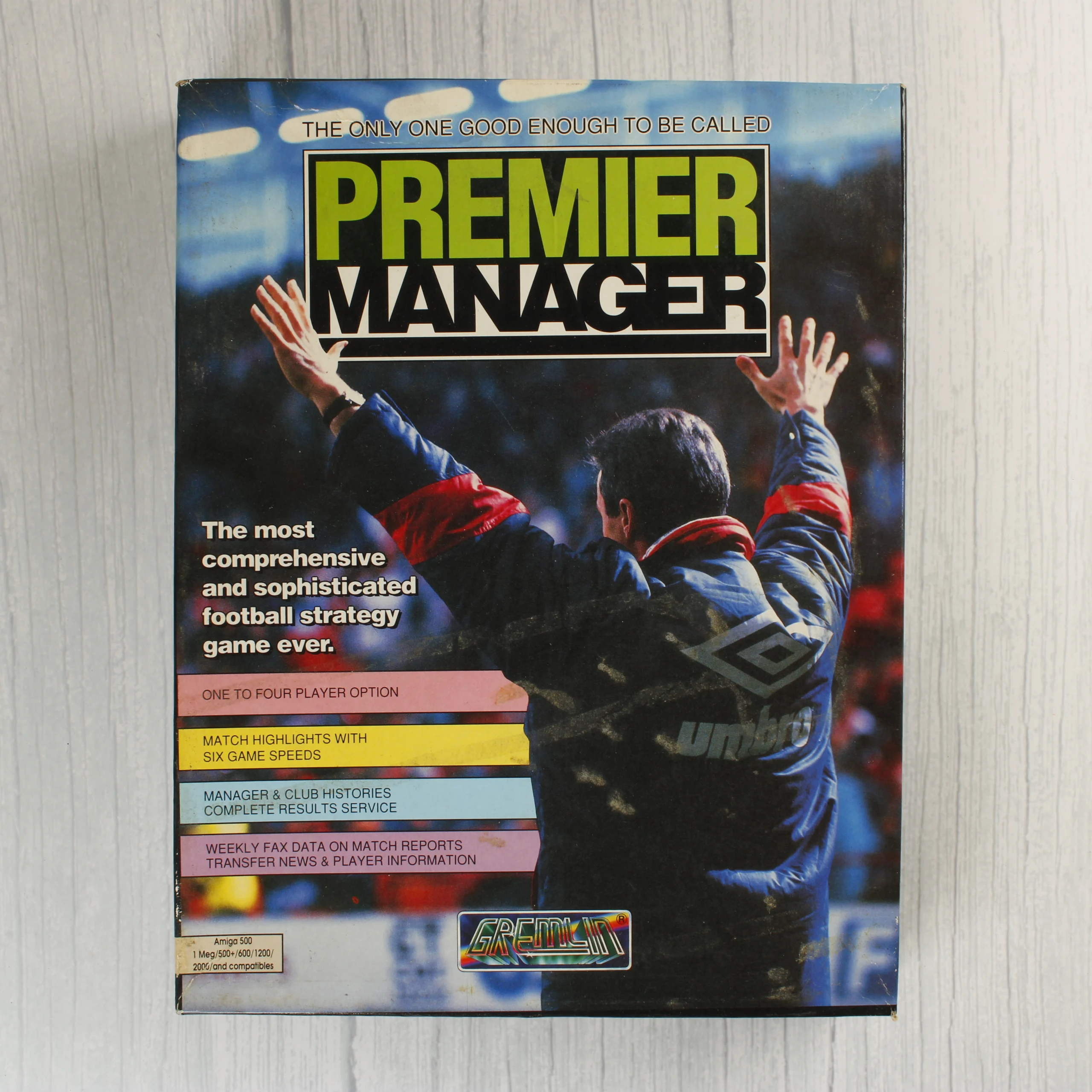 A Premier Manager című videójáték Amiga platformra készült kiadása. A csomag tartalmazza az eredeti kartondobozt, amelyen egy futballmenedzser látható felemelt karokkal, valamint a játékhoz tartozó két darab kék színű, 3,5 colos floppy lemezt. A dobozban megtalálható továbbá a használati útmutató és egy fekete színű, forgatható kartonból készült másolásvédelmi kódkerék is. A doboz grafikája színes, a hátoldalon képernyőmentések és a játék jellemzői láthatóak. A lemezeken fehér címke található a játék címével és a lemez sorszámával. A csomagolás és a tartozékok a koruknak megfelelő állapotban vannak.