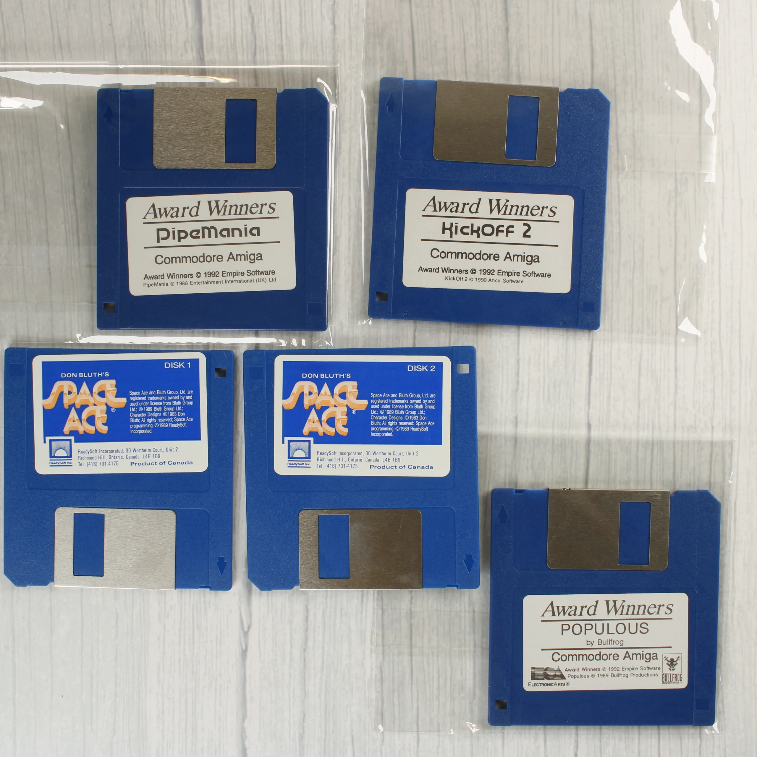 Award Winners: The Definitive Games Collection válogatás Amiga számítógépre. Tartalmazza a Space Ace, Kick Off 2, Pipe Mania és Populous játékokat floppy lemezen.