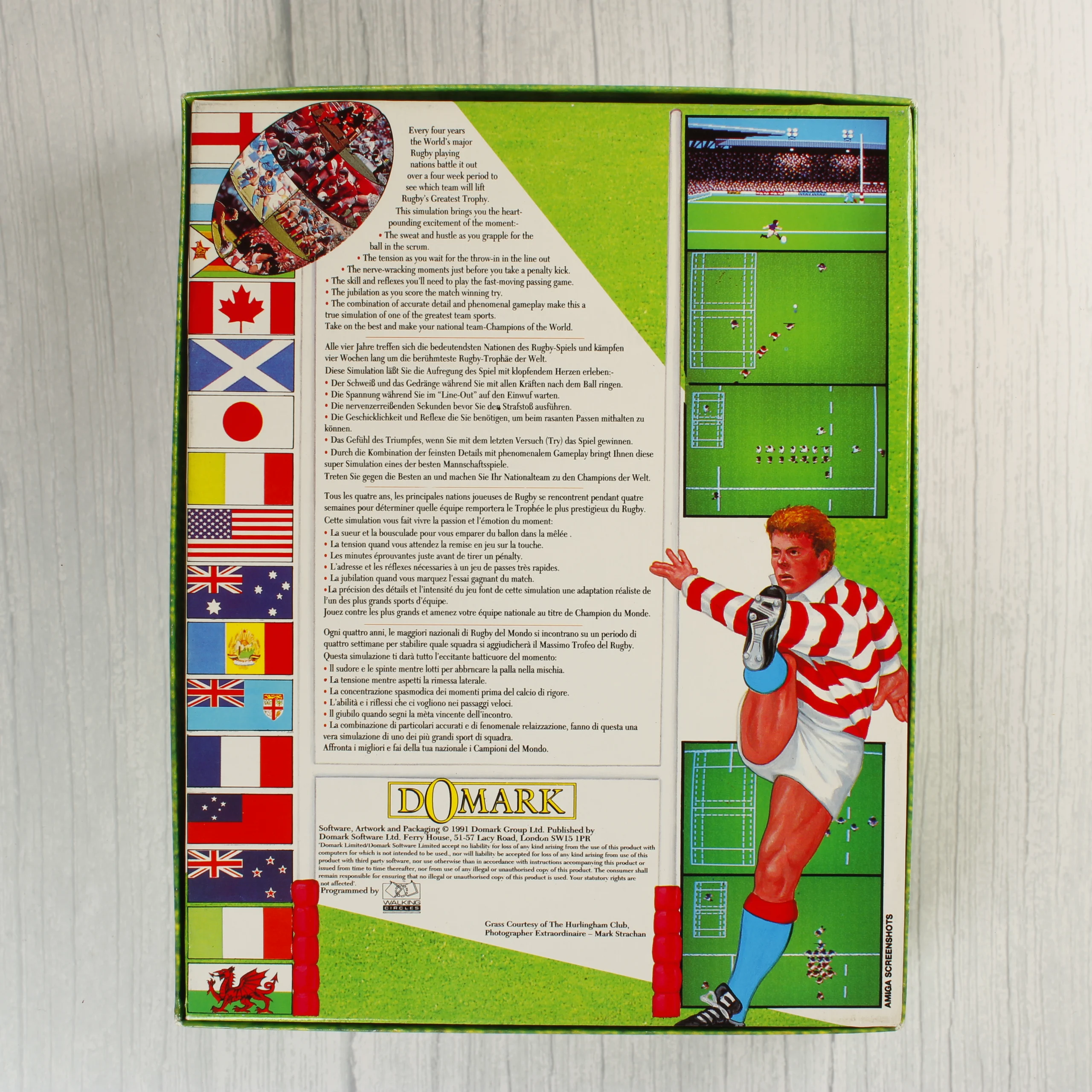 A Rugby: The World Cup egy 1991-es kiadású videójáték Amiga platformra, amelyet a Domark jelentetett meg. A csomag tartalmazza az eredeti színes kartondobozt, amelyen különböző nemzetek zászlói és rögbi mérkőzések jelenetei láthatóak. A doboz belsejében egy színes használati útmutató füzet és egy zöld színű, 3,5 colos floppy lemez található, utóbbi átlátszó védőtasakban. A hátoldalon többnyelvű leírás és játékmenet-képernyőképek olvashatóak. A grafika a korabeli sportjátékok stílusát idézi, hangsúlyos piros és fehér feliratokkal. A doboz élei mentén enyhe kopás látható, de az összetevők hiánytalannak tűnnek.