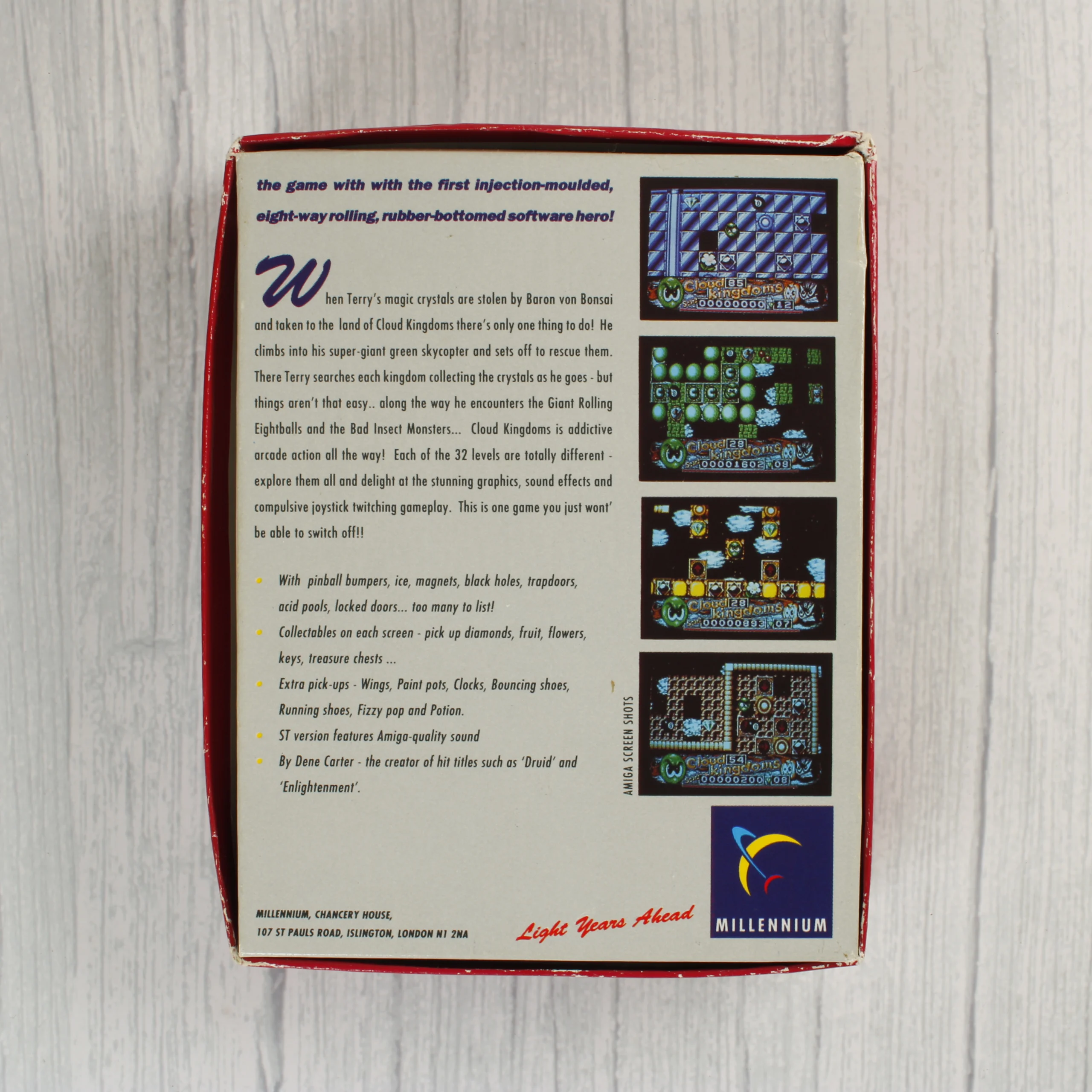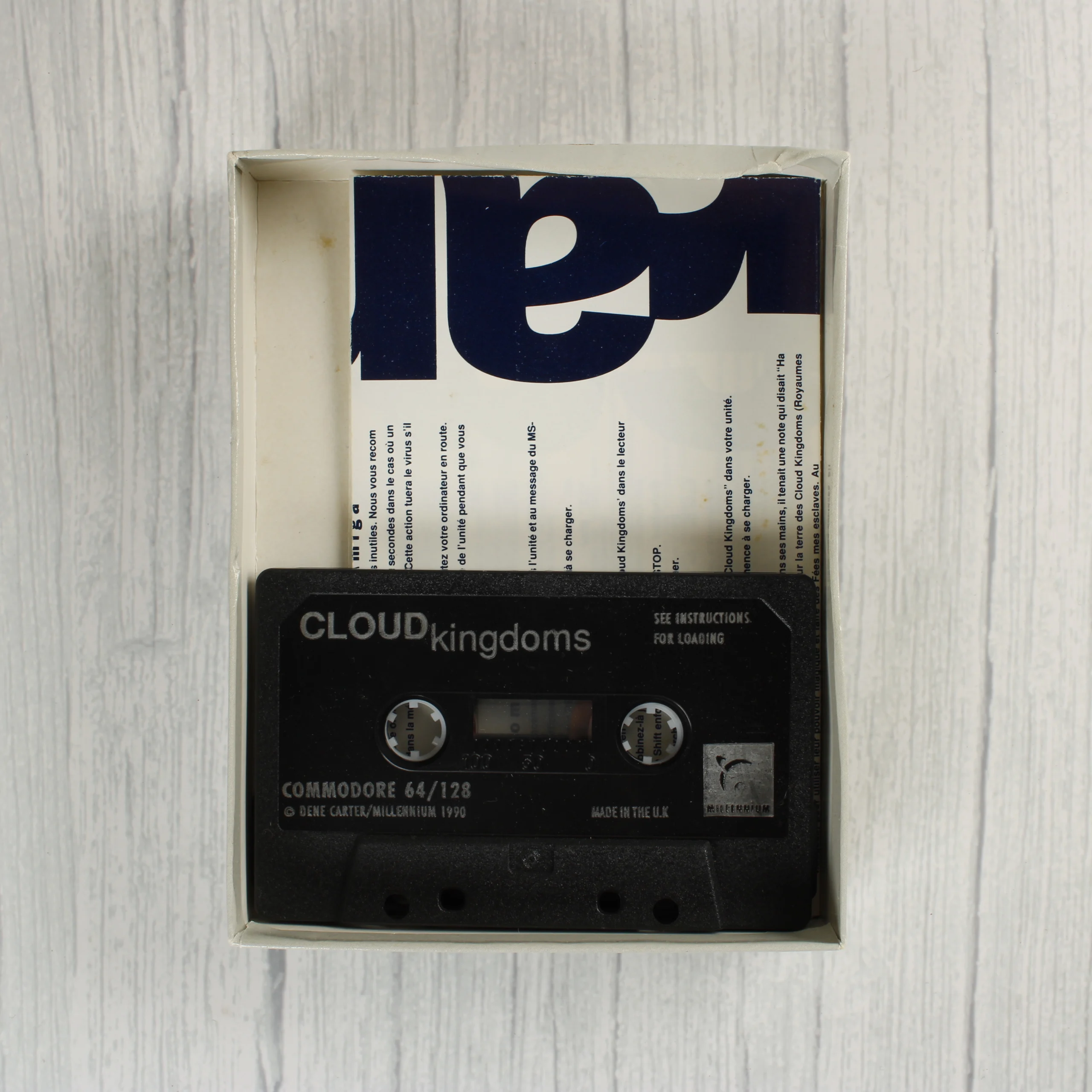 A Cloud Kingdoms című videójáték Commodore 64/128 platformra készült kiadása. A csomag egy piros alapszínű, illusztrált kartondobozt, egy fekete színű mágneskazettát és egy többnyelvű használati útmutatót tartalmaz. A doboz elején színes, rajzfilmszerű karakterek láthatóak, a hátoldalán pedig Amiga verzióból származó képernyőmentések és angol nyelvű leírás olvasható. A Millennium által kiadott szoftver kazettáján jól látható a fehér feliratozás és a kiadó logója. A termék az eredeti papírdobozos kiszerelésben maradt fenn, amely magában foglalja a játék betöltéséhez szükséges adathordozót és a dokumentációt.