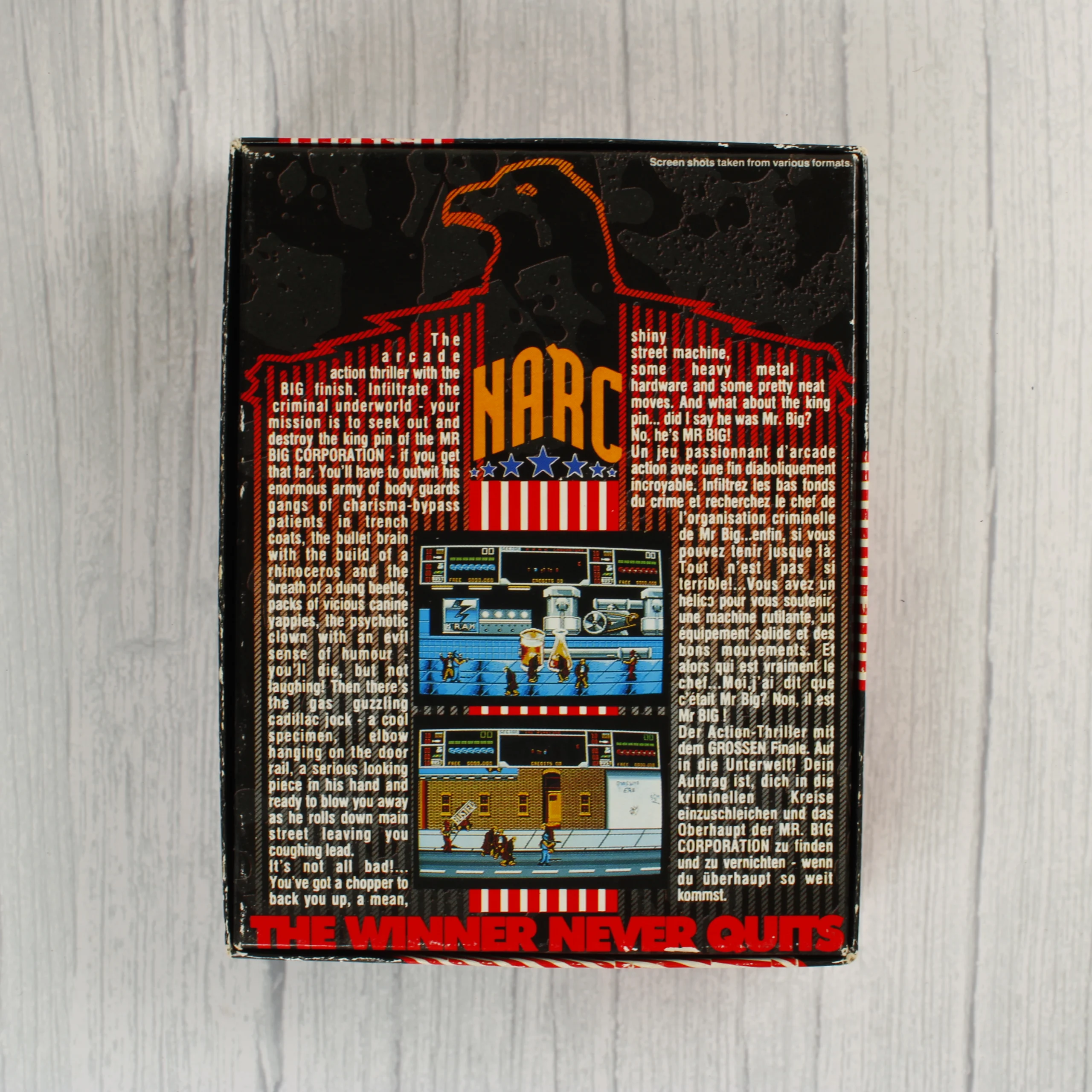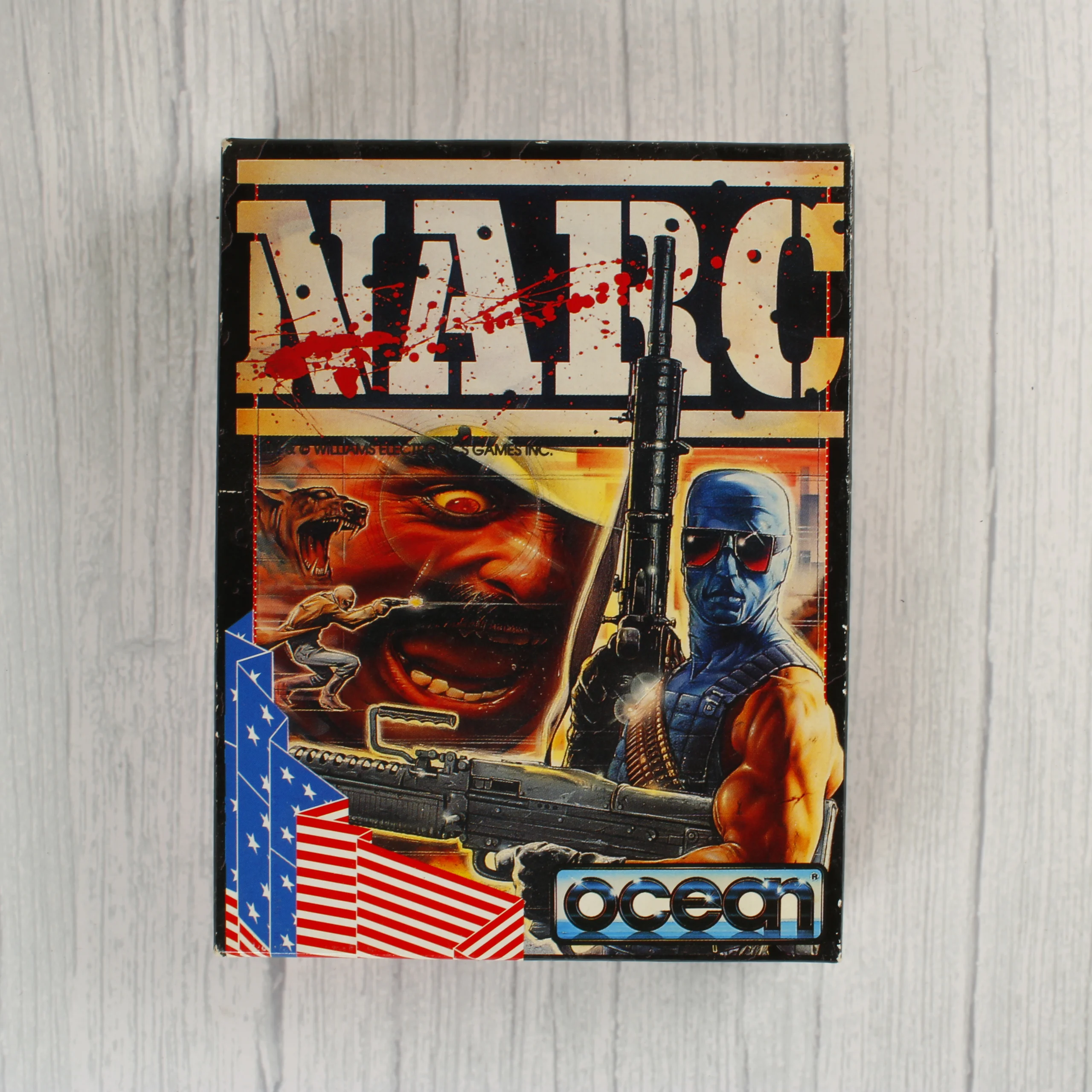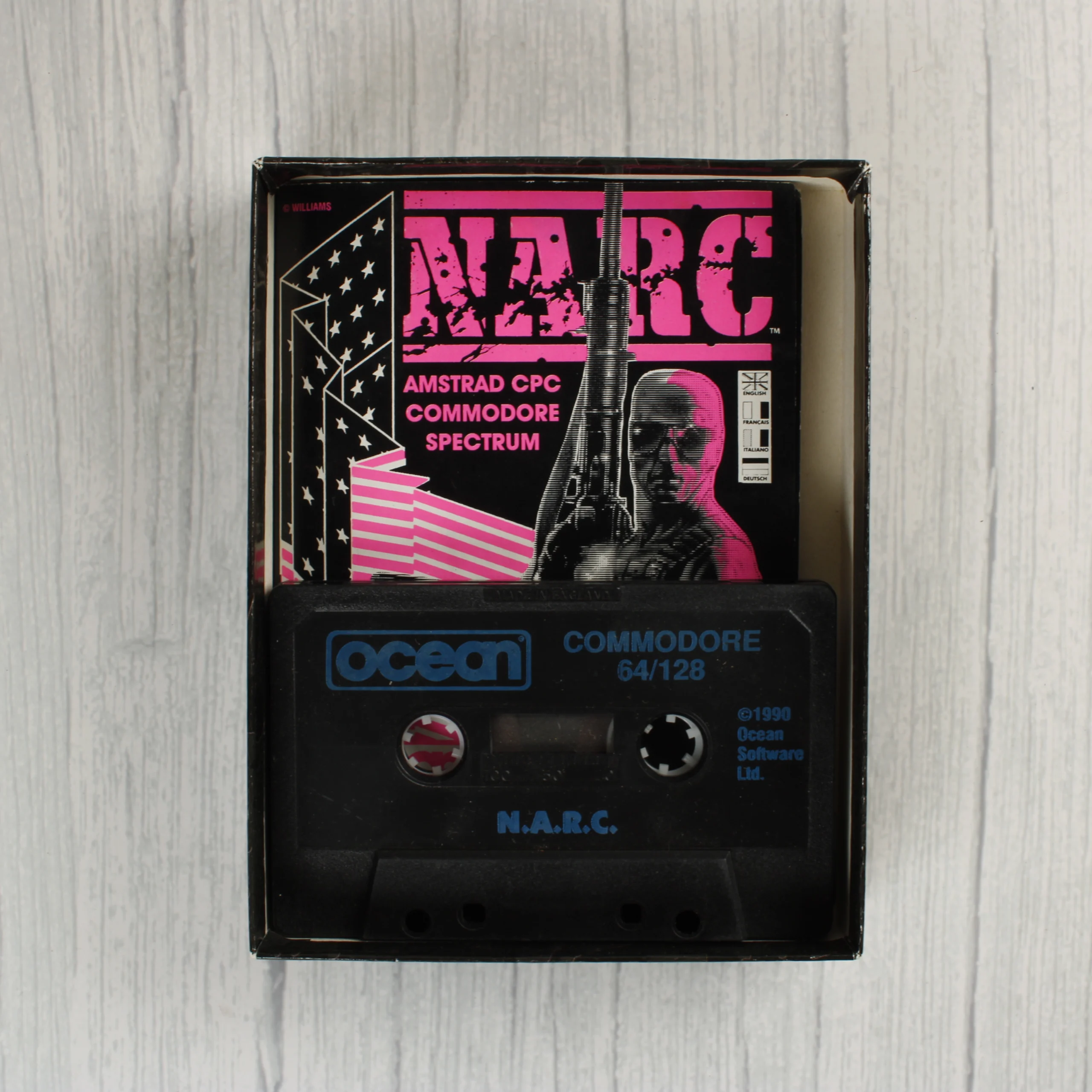 A NARC című videójáték Commodore 64/128 platformra készült kiadása, amelyet az Ocean Software jelentetett meg. A csomag tartalmazza az eredeti kartondobozt, egy fekete színű mágneskazettát és a hozzá tartozó használati útmutatót. A doboz előlapján színes, akciódús illusztráció látható egy kék maszkos, napszemüveges karakterrel és egy nagyméretű gépfegyverrel, valamint az amerikai zászló stilizált ábrázolásával. A hátoldalon többnyelvű leírás és képernyőmentések találhatók a játékmenetből. A kazetta fekete műanyag házzal rendelkezik, rajta kék Ocean logóval és a játék címével. A papíralapú dokumentáció rózsaszín és fekete színekkel nyomtatott, illeszkedik a doboz grafikájához. A termék korának megfelelő esztétikai állapotban van, a doboz élein és sarkain kisebb kopások láthatók.