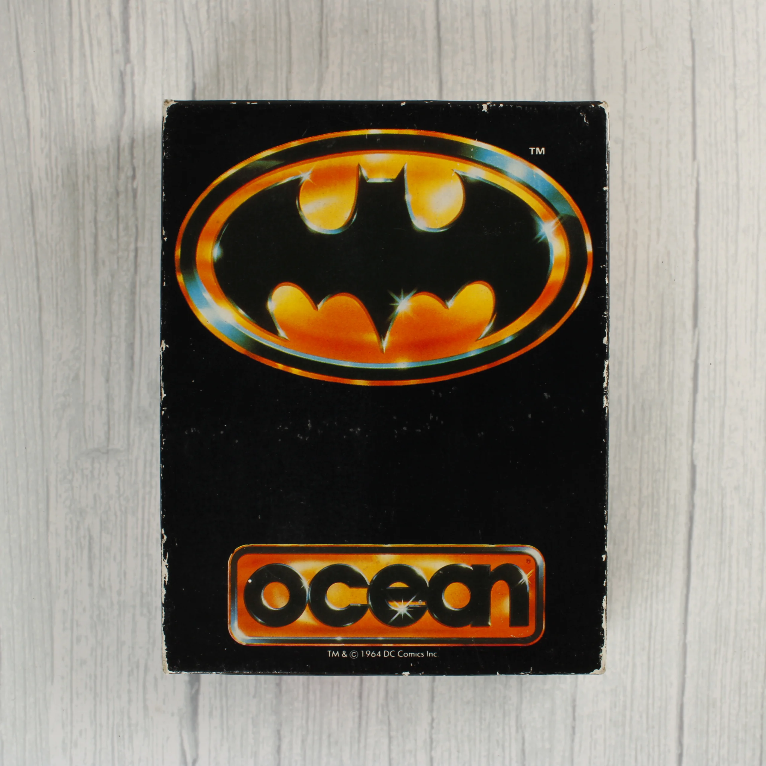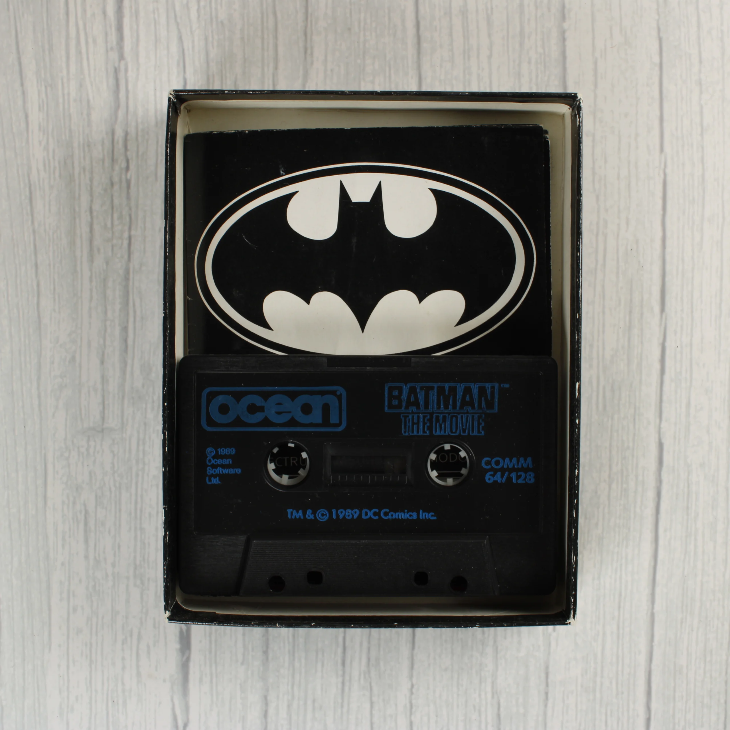 Az Ocean Software által kiadott Batman: The Movie videójáték Commodore 64/128 platformra. A csomag tartalmazza az eredeti kartondobozt, egy fekete színű mágnesszalagos kazettát és egy használati útmutatót. A doboz elején a klasszikus sárga-fekete Batman logó és az Ocean márkajelzés látható. A hátoldalon angol, francia és német nyelvű leírás, valamint játékmenet-pillanatképek szerepelnek. A kazettán kék felirattal olvasható a cím és a platform megjelölése. A papíralapú doboz élei mentén fehér kopásnyomok és kisebb benyomódások láthatóak, de a szerkezete ép. A belső tartalom megkímélt állapotban van.