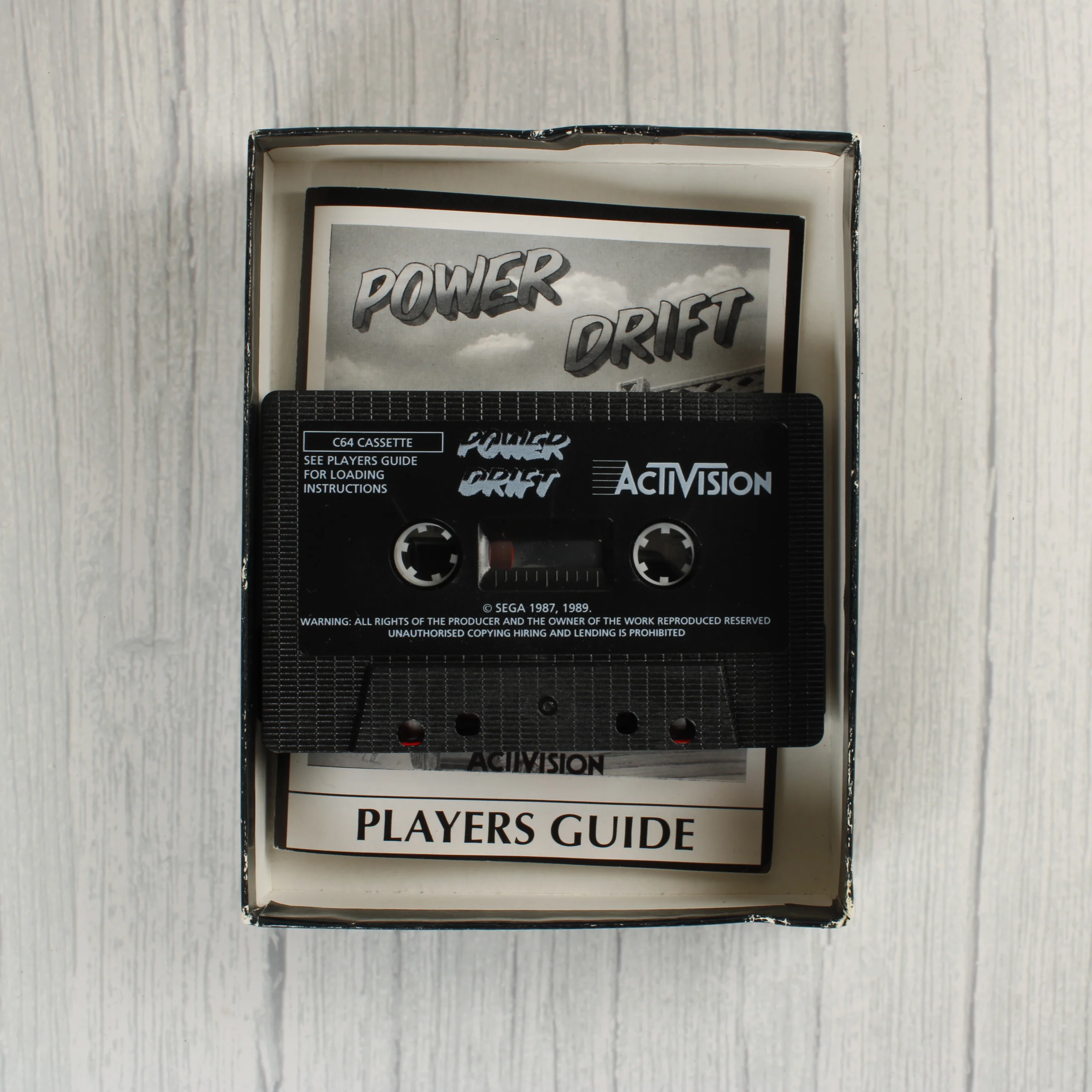 A Power Drift című videójáték Commodore 64-es kiadása, eredeti kartondobozban. A csomag tartalmazza a fekete színű mágnesszalagos kazettát és a nyomtatott használati útmutatót (Players Guide). A doboz elején színes illusztráció látható, amely egy kék versenyautót és annak vezetőjét ábrázolja akció közben, Activision és Sega logókkal ellátva. A hátoldalon angol nyelvű leírás és képernyőmentések találhatók a játékról. A kazetta felirata szerint a szoftvert az Activision adta ki a Sega licence alapján. A termék fizikai hordozója egy szabványos magnókazetta, amelyen fehér feliratok olvashatók.