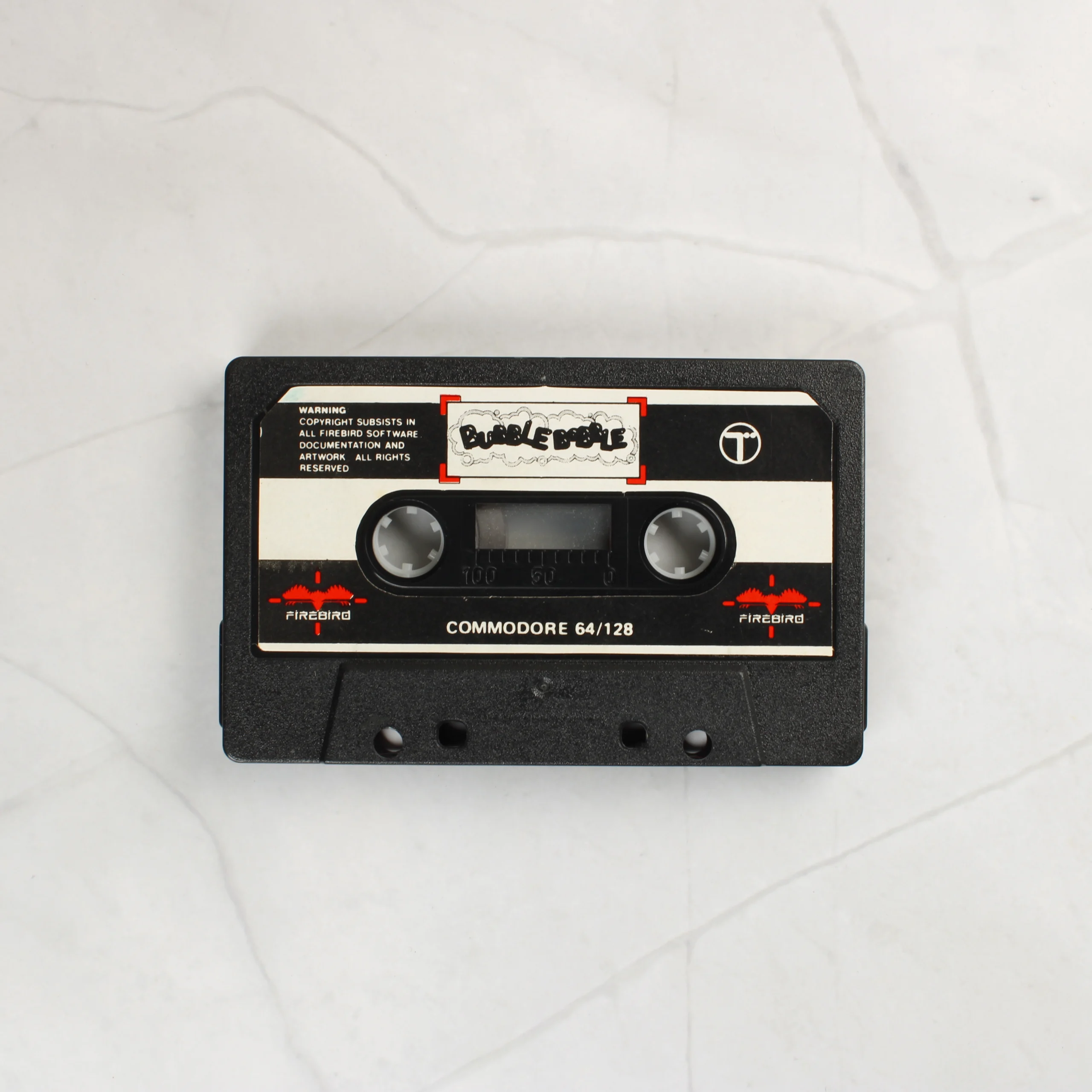A Bubble Bobble videójáték Commodore 64/128 platformra készült kiadása. A csomag egy fekete színű, műanyag házas kazettát tartalmaz, amelyen fehér alapon fekete feliratok és a Firebird logója látható. A kazetta egy átlátszó műanyag tokban helyezkedik el, amelyben egy színes papírborító található. A borító elején a játék két főszereplője, a kék és zöld sárkány látható buborékok között, a Firebird és a Taito logóival kiegészítve. A hátoldalon angol nyelvű leírás, egy képernyőkép a játékból és a vonalkód szerepel. A tok és a borító felületén használatból eredő apró karcok és kopások figyelhetők meg.