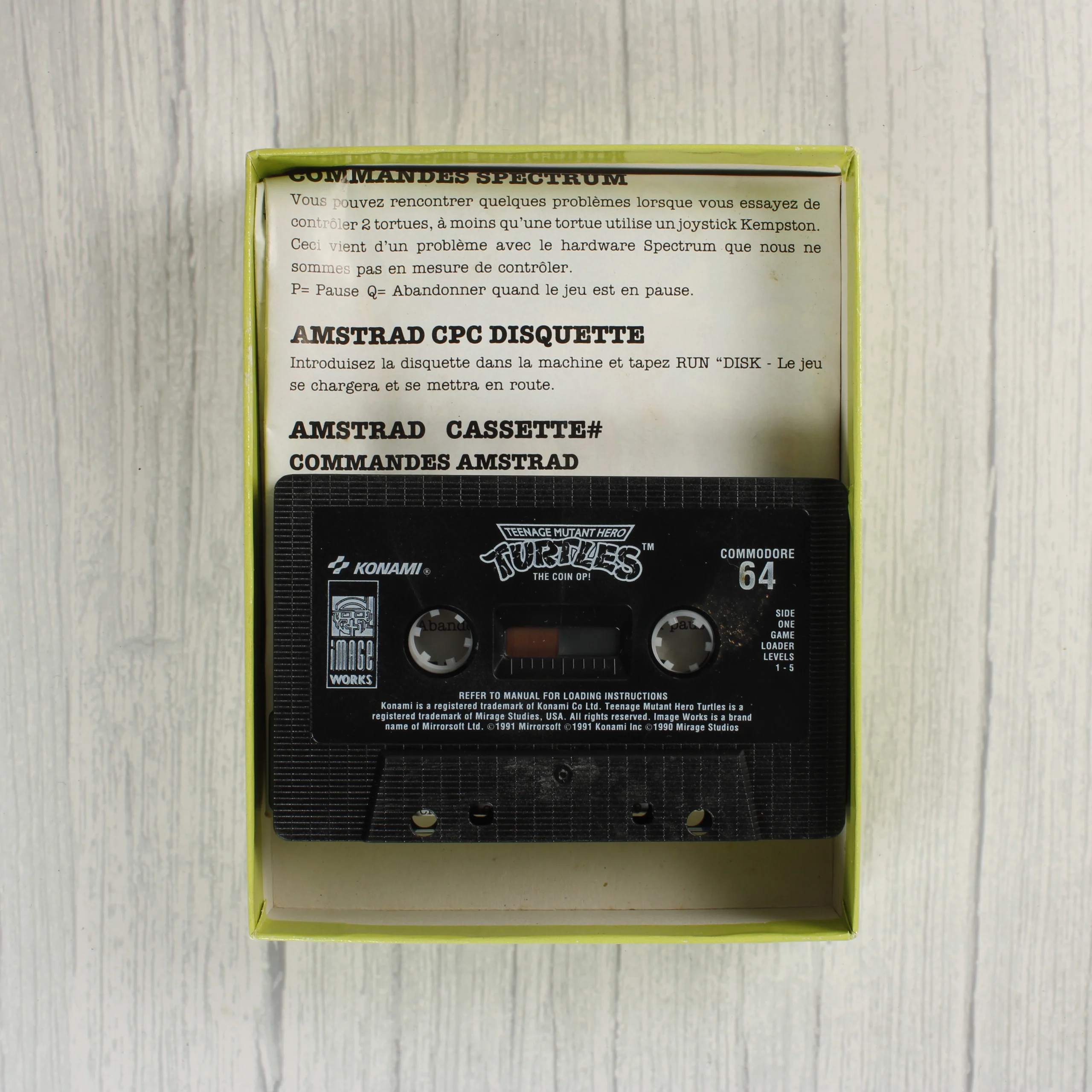 A Teenage Mutant Hero Turtles: The Coin-Op! videójáték Commodore 64 platformra készült kiadása. A csomag tartalmazza az eredeti, sárga alapszínű kartondobozt, amelyen a nindzsa teknőcök láthatóak akció közben, valamint egy narancssárga matricát, amely a Commodore kazetta formátumot és az angol nyelvű verziót jelzi. A doboz hátoldalán többnyelvű leírás és játékmenet-fotók találhatók. A készlet része egy fekete színű műanyag kazetta, amelyen fehér feliratok és a Konami, valamint az Image Works logói láthatóak. A kazetta mellett egy papíralapú használati útmutató is helyet kapott a dobozban. A csomagoláson promóciós ajánlatok is láthatóak, például egy ingyenes fényképezőgépre vonatkozó hirdetés.