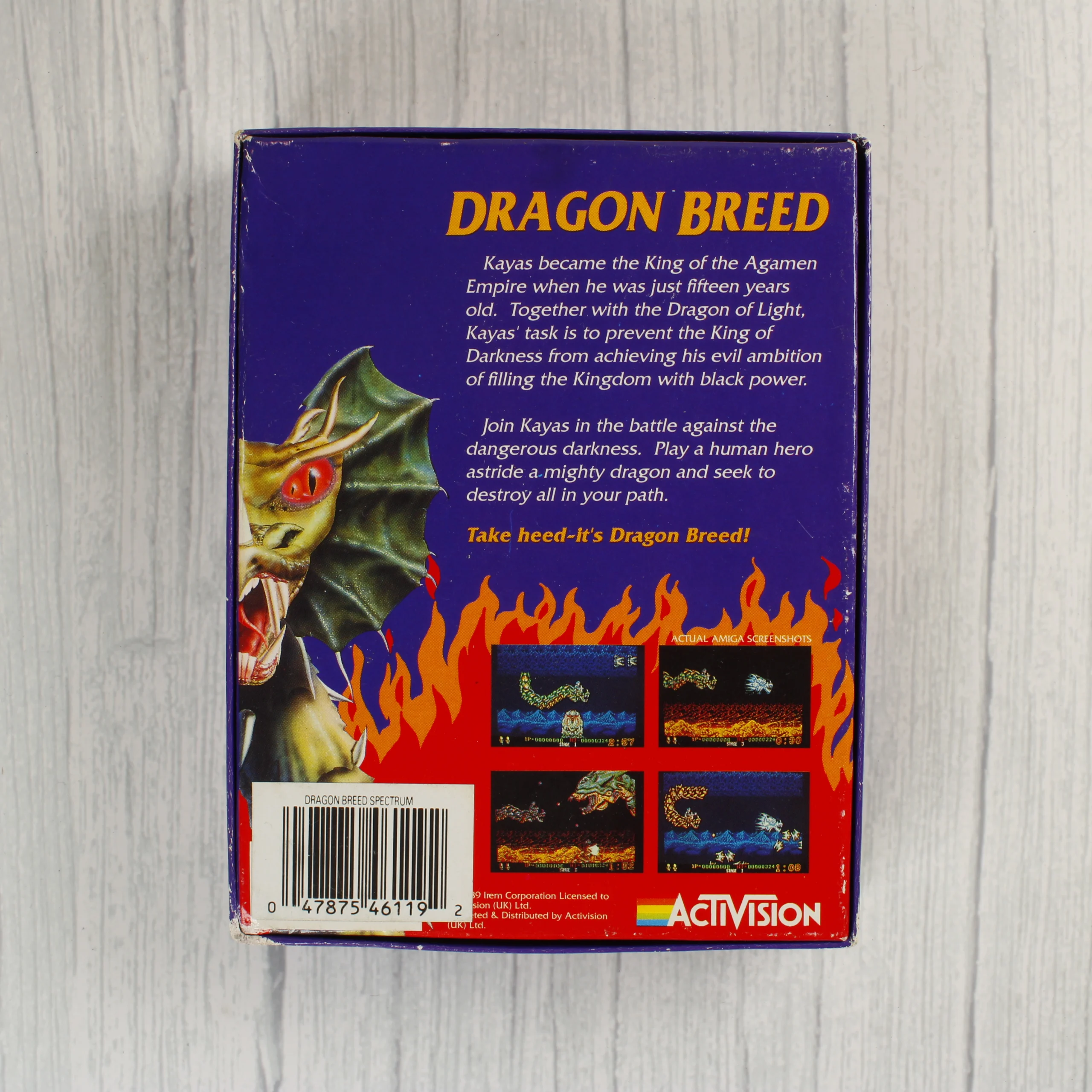A Dragon Breed című videójáték ZX Spectrum számítógépre készült kiadása. A csomag tartalmazza az eredeti kartondobozt, amelyen egy sárkányon lovagló harcos látható. A doboz hátoldalán angol nyelvű leírás és képernyőmentések találhatók. A belső részben egy fekete színű magnókazetta helyezkedik el, amely műanyag védőtasakba van csomagolva. A kazettán fehér feliratok jelzik a címet és a kiadót. A doboz élei mentén kisebb kopások és fehér foltok láthatóak, de a szerkezete ép. A grafika színei élénkek, a szövegek jól olvashatóak. A készlet tartalmazza a használati útmutatót is a kazetta alatt.