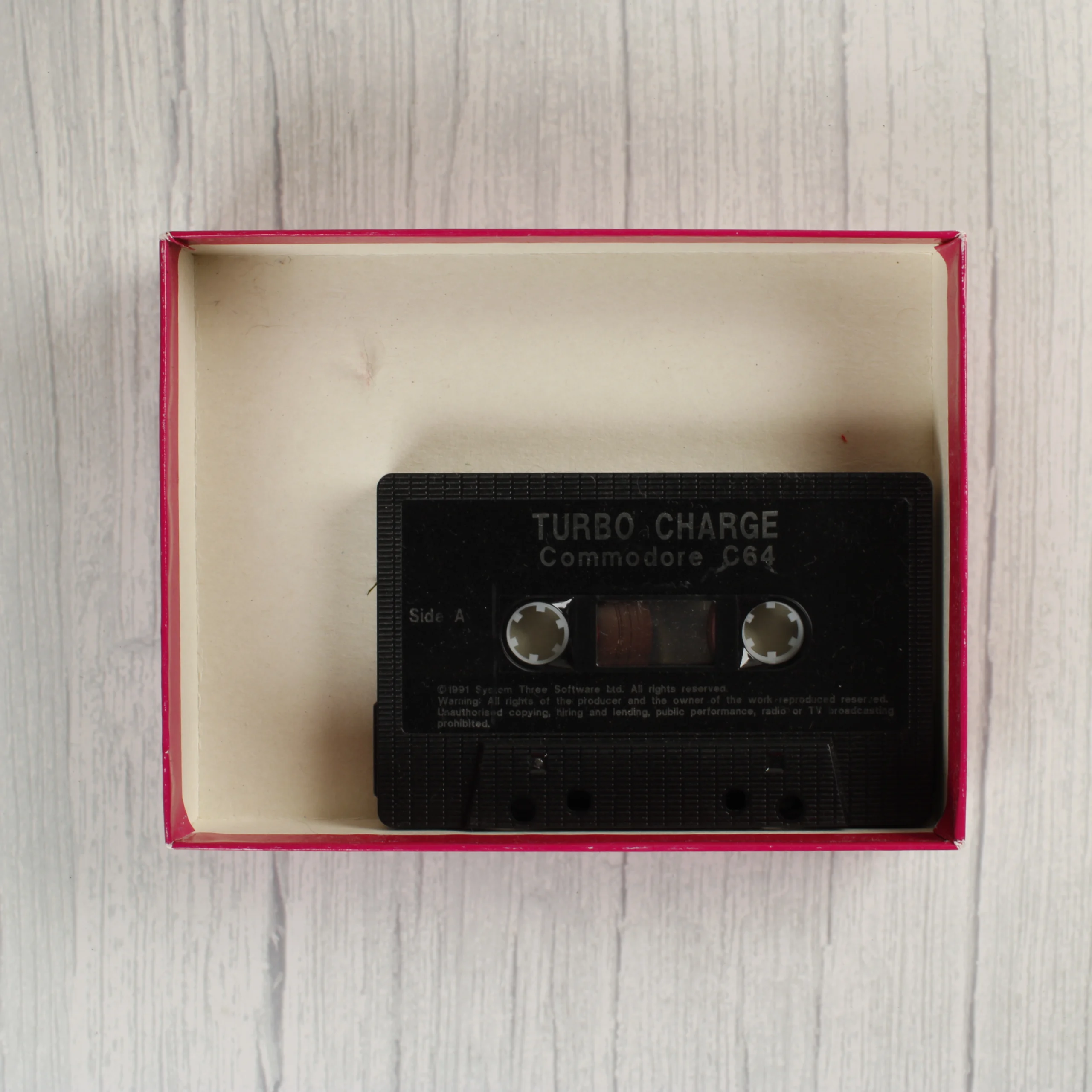 A Turbo Charge című videójáték Commodore 64 platformra készült kiadása. A csomag tartalmazza az eredeti kartondobozt és egy fekete színű mágnesszalagos kazettát. A doboz elején színes illusztráció látható, amely sportautókat és egy helikoptert ábrázol akció közben, Miami stílusú környezetben. A hátoldalon játékmenetből származó képernyőfotók, funkciólista és kritikai idézetek olvashatók. A kazettán fehér felirattal szerepel a játék címe és a gép típusa. A csomagolás szélein és sarkain látható némi kopás és fehéredés, ami a korából adódó használat jele. A belső papírtálca ép, a kazetta felülete tiszta, a feliratok jól olvashatók. A termék az 1991-es System 3 kiadás.
