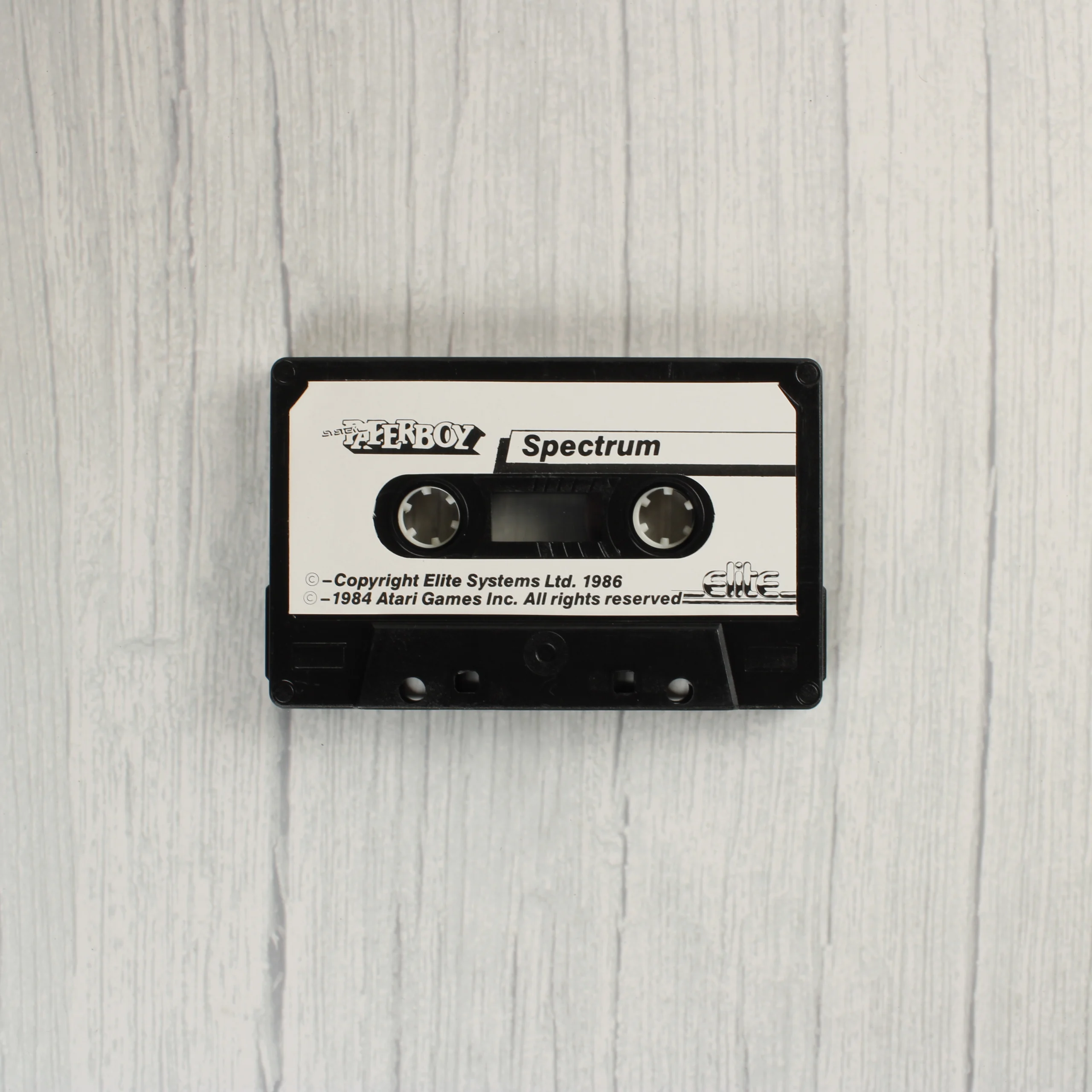 A Paperboy című videójáték ZX Spectrum számítógépre kiadott változata. A csomag tartalmazza az eredeti műanyag tokot, a színes borítót és a fekete színű mágnesszalagos kazettát. A borítón az Atari logója és az Elite Systems márkajelzése látható, a grafika egy újságkihordó fiút ábrázol kerékpáron, mellette egy játéktermi automatával. A kazettán fehér címke található fekete feliratokkal, amelyen szerepel a játék címe, a platform megnevezése és az 1986-os szerzői jogi információk. A hátoldali borítón egy vonalkód és a kiadó angliai címe látható piros háttér előtt.