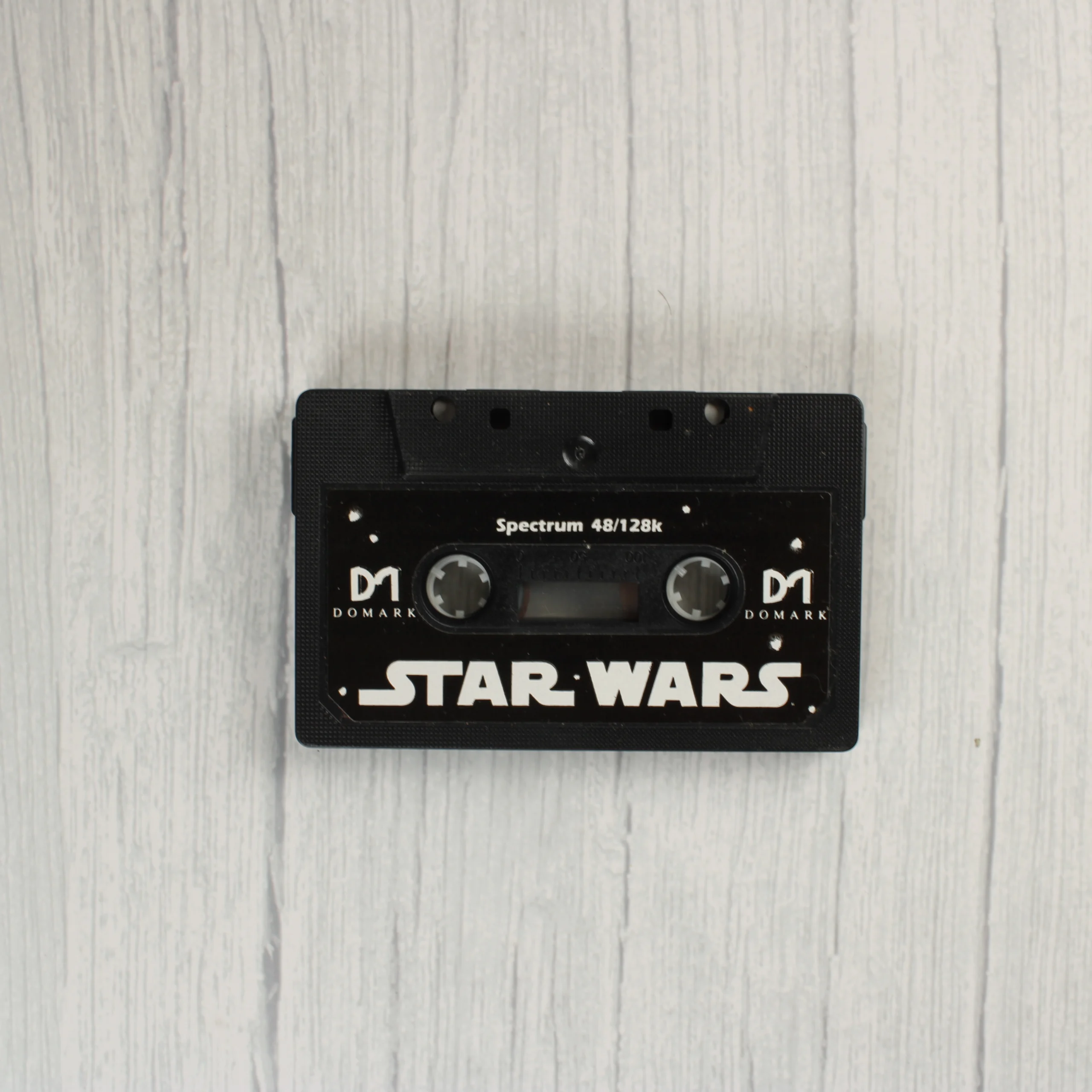 A Star Wars videójáték ZX Spectrum platformra készült kiadása, amely egy átlátszó műanyag tokban elhelyezett kazettán található. A borítón a klasszikus filmplakát grafikája látható Luke Skywalkerrel, Han Solóval, Leia hercegnővel és Darth Vaderrel. A hátoldalon angol nyelvű leírás, játékmenet-képernyőképek a C64, Atari ST és Spectrum verziókból, valamint a Domark kiadó logója szerepel. A fekete színű kazetta címkéjén fehér Star Wars felirat és a Spectrum 48/128k kompatibilitás jelzése látható. A csomagolás és a hordozó korának megfelelő, megkímélt állapotban van.