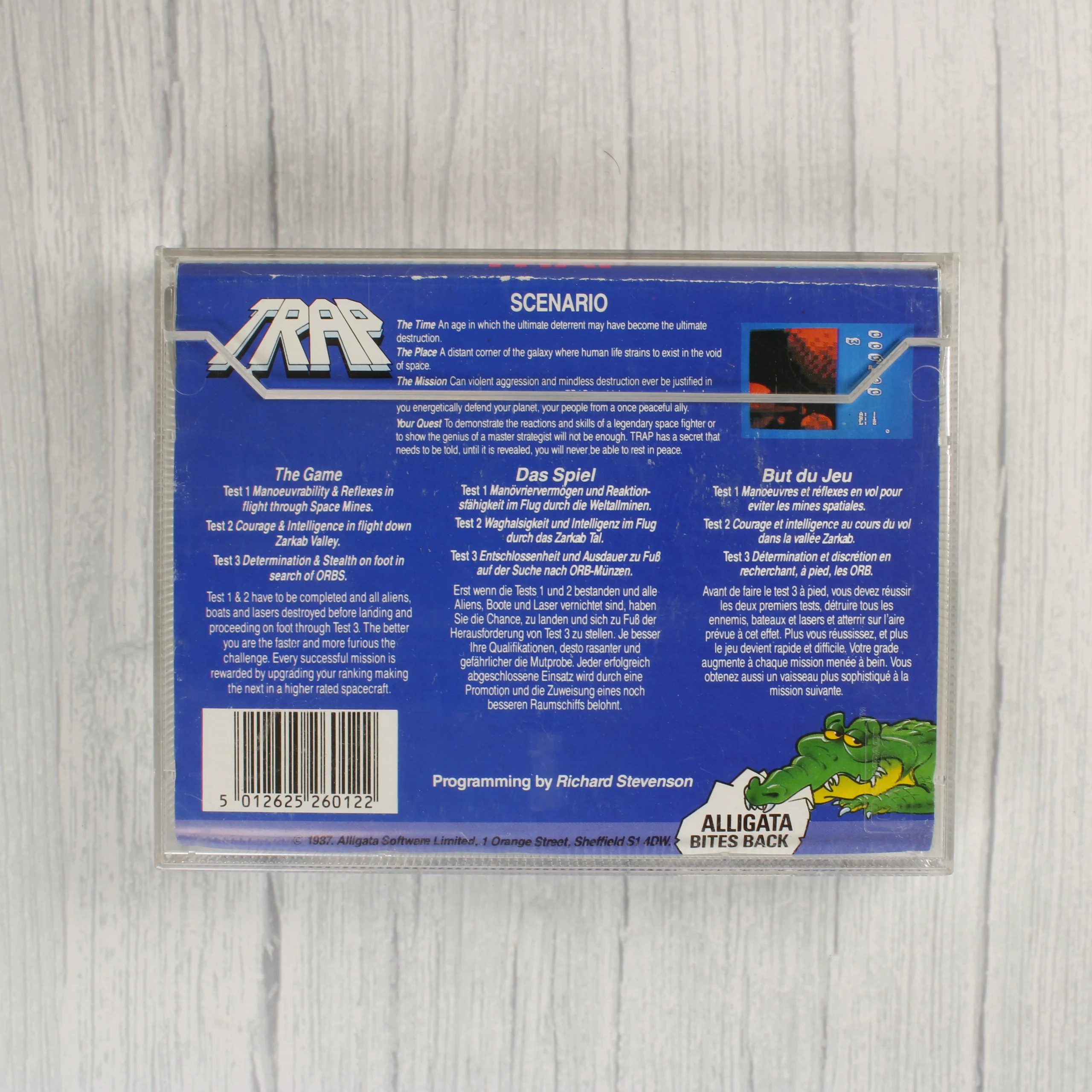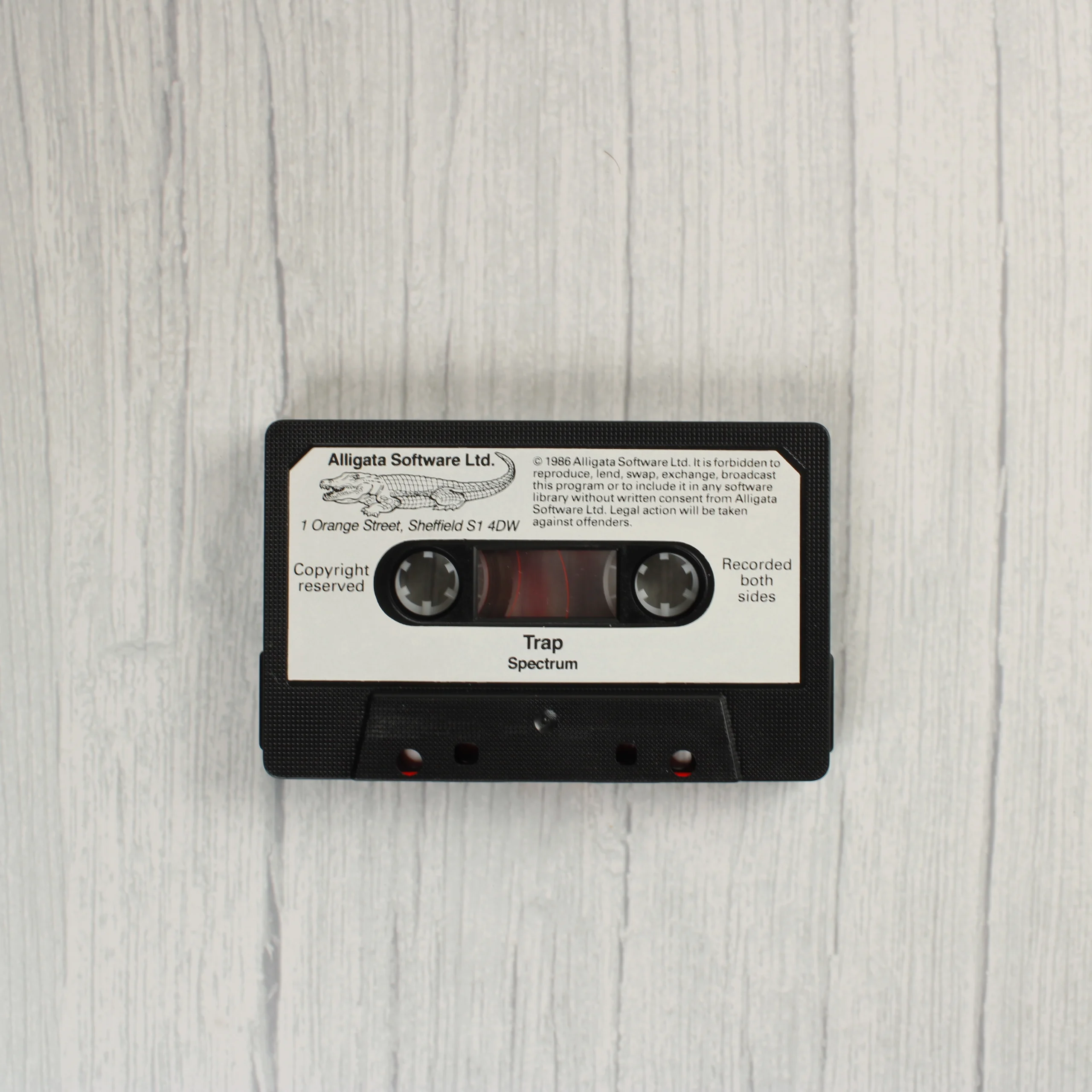 A Trap című videójáték ZX Spectrum platformra készült kiadása, amely egy eredeti műanyag tokban található. A borítón színes, sci-fi stílusú illusztráció látható, amely egy űrhajót ábrázol egy bolygó előtt, valamint az Alligata Software krokodil logóját. A csomag tartalmaz egy fekete színű mágnesszalagos kazettát, amelyen fehér címke található a játék címével és a kiadó adataival. A hátoldali borító kék alapszínű, többnyelvű (angol, német, francia) leírást és egy vonalkódot tartalmaz. A tok átlátszó műanyagból készült, amely védi a papírborítót és a kazettát.