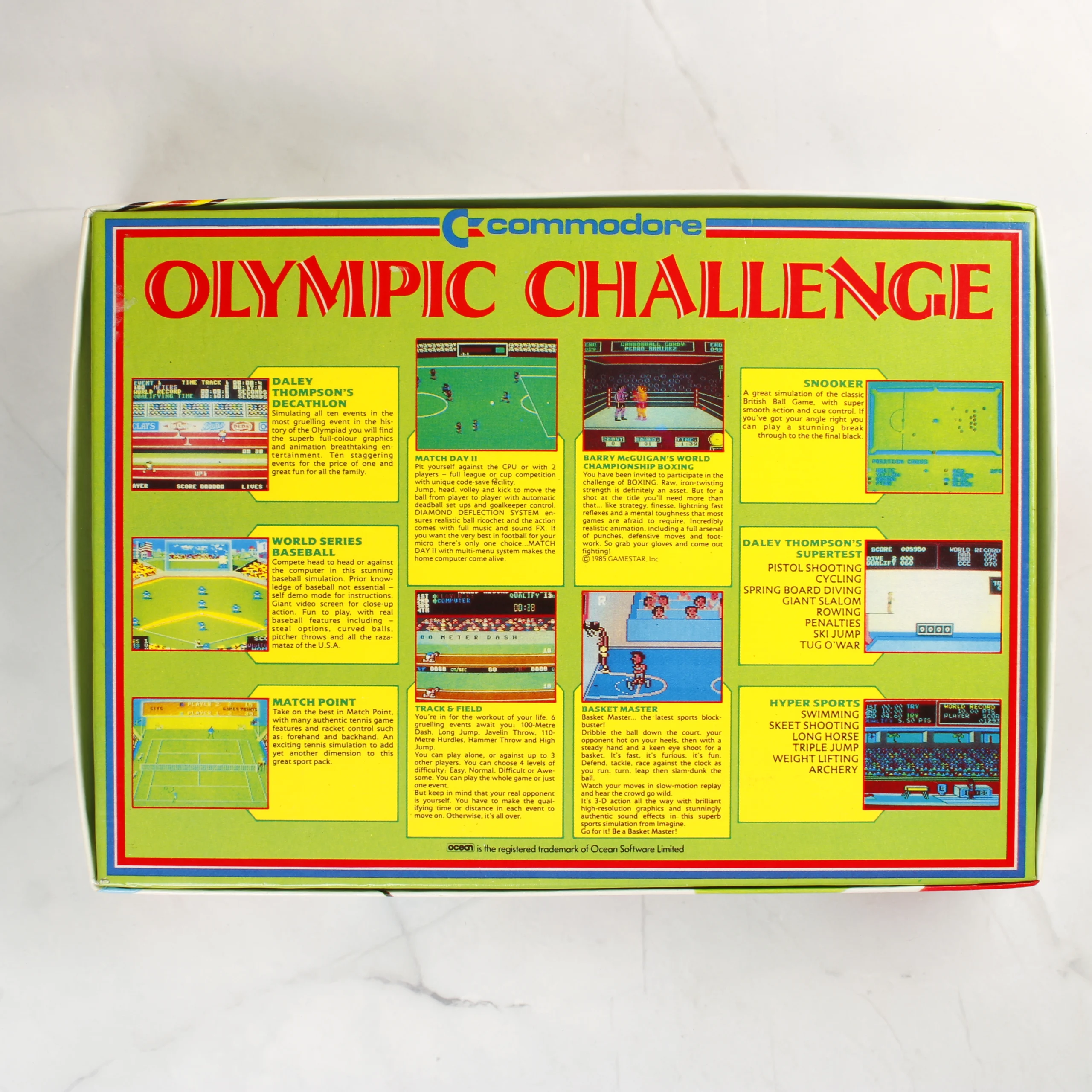 Az Olympic Challenge egy Commodore 64 platformra megjelent sportjáték-gyűjtemény az Ocean Software gondozásában. A csomag négy darab fekete műanyag kazettát tartalmaz, amelyek egy zöld belső tálcás, színes kartondobozban helyezkednek el. A doboz elején dinamikus, kézzel rajzolt illusztrációk láthatók különféle sportágakról, mint például a kosárlabda, tenisz, ökölvívás és kerékpározás. A hátoldalon részletes leírások és képernyőfotók mutatják be a válogatásban szereplő játékokat, köztük a Daley Thompson's Decathlon, Match Day II és Hyper Sports címeket. A kazetták fehér címkével rendelkeznek, amelyeken kék felirat jelzi a játékok listáját és az oldalszámokat. A csomagolás és a hordozók koruknak megfelelő, megkímélt állapotban vannak.