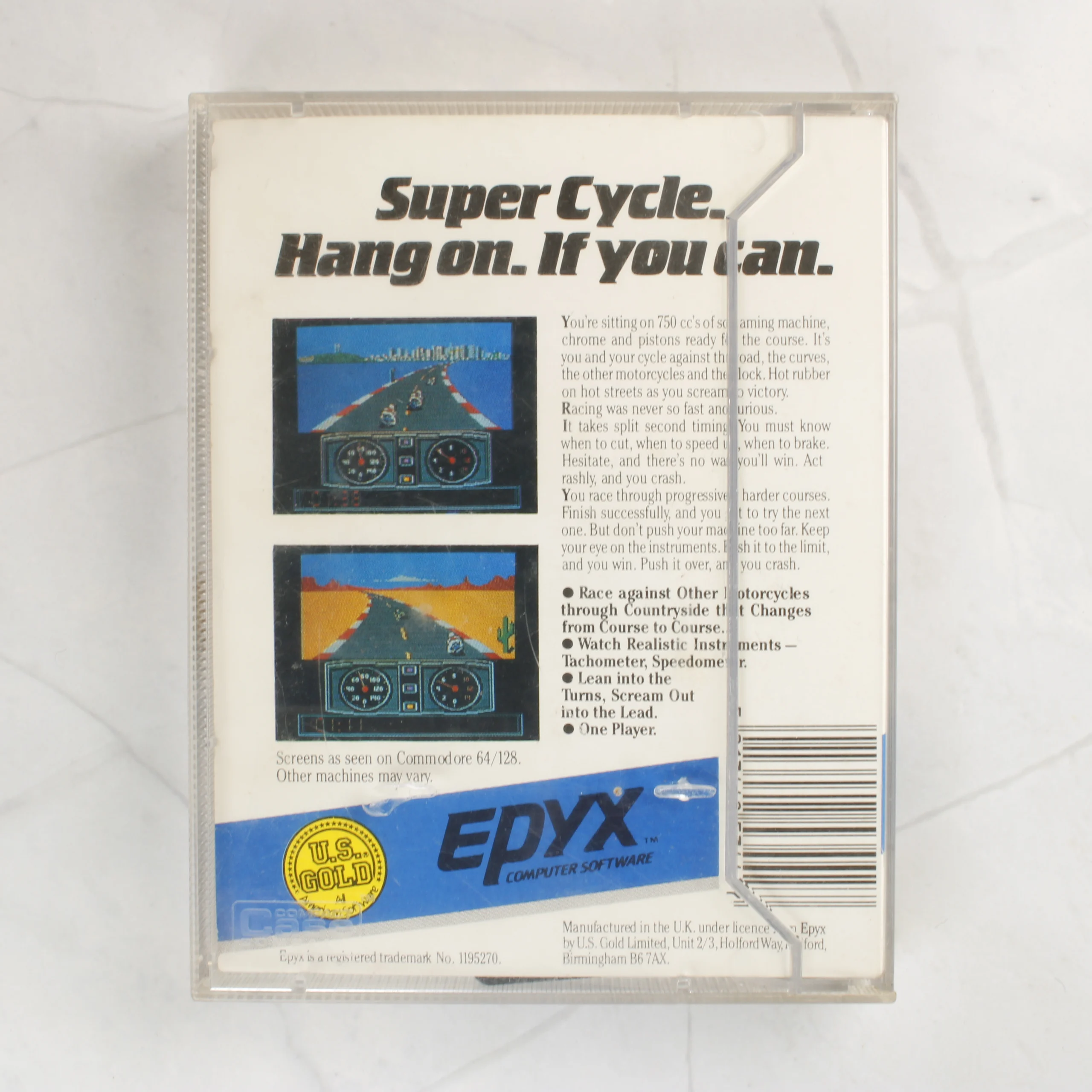 A Super Cycle című videójáték Commodore 64 platformra készült kiadása, amely egy átlátszó műanyag tokban található. A csomag tartalmazza az eredeti papírborítót és a fekete színű mágnesszalagos kazettát. A borító elején színes illusztráció látható, amely motorversenyzőket ábrázol akció közben, valamint a játék címe és a 64-es logó is szerepel rajta. A hátoldalon angol nyelvű leírás, játékmenet-fotók, valamint az Epyx és az U.S. Gold logói láthatóak. A kazetta fehér címkével rendelkezik, amelyen fekete feliratok jelzik a címet és a kiadókat. A termék fizikai állapota korának megfelelő, a műanyag tokon és a papírborítón enyhe használati nyomok és sárgulás tapasztalható.