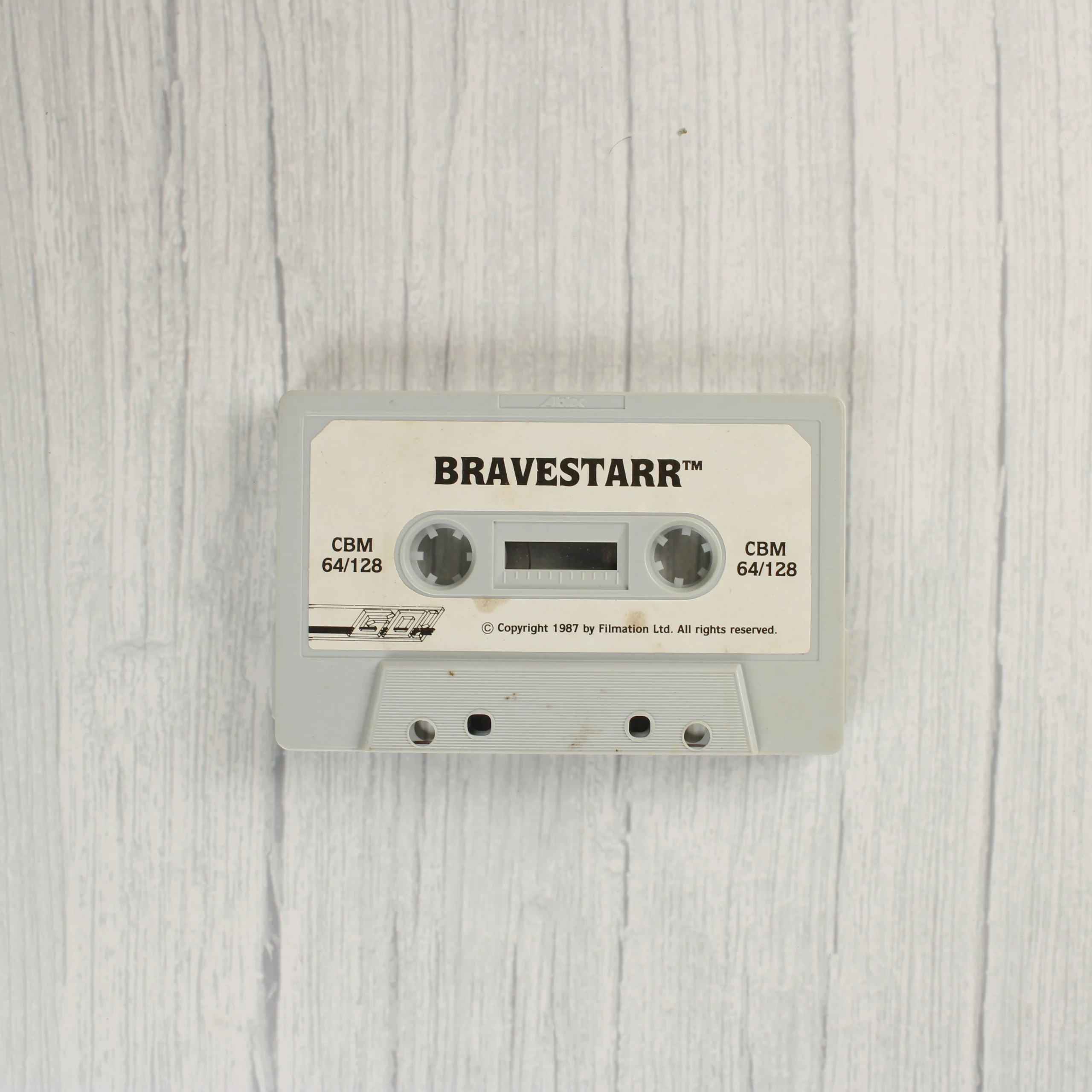 A BraveStarr című videójáték Commodore 64 és 128 platformokra készült kiadása. A csomag egy átlátszó műanyag tokot tartalmaz, amelyben a színes borító és az adathordozó kazetta található. A borító előlapján Marshall Bravestarr látható lovon, a háttérben pedig ellenséges karakterek és egy futurisztikus városkép jelenik meg. A hátoldalon angol nyelvű leírás, játékmenet-képek és a vonalkód látható. A szürke műanyag házas kazetta fehér címkével rendelkezik, amelyen fekete felirat jelzi a címet és a kompatibilitást. A terméken az 1987-es szerzői jogi évszám szerepel. A műanyag tok felületén használatból eredő karcok és kopások láthatóak, a kazetta címkéjén pedig kisebb elszíneződések és foltok fedezhetők fel.