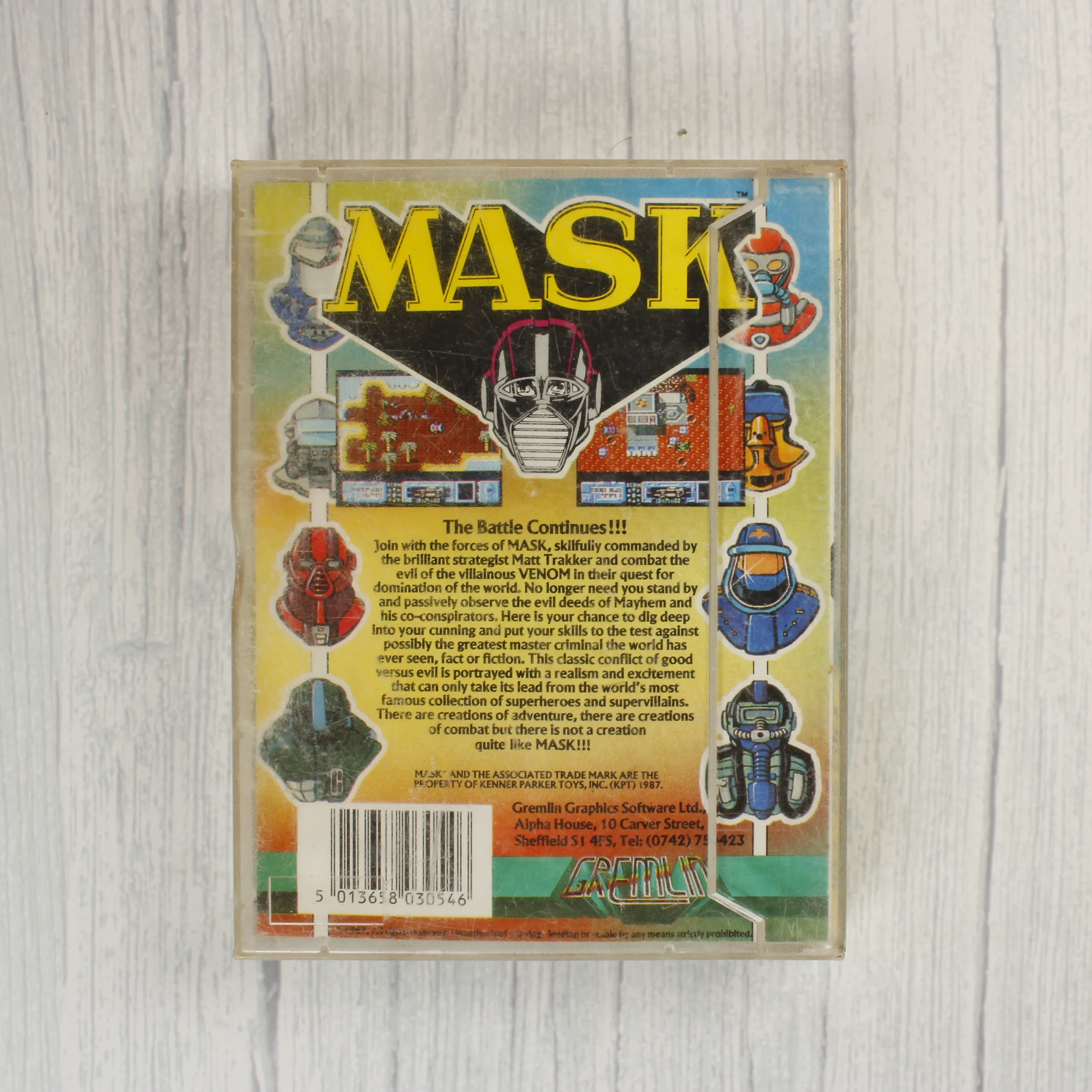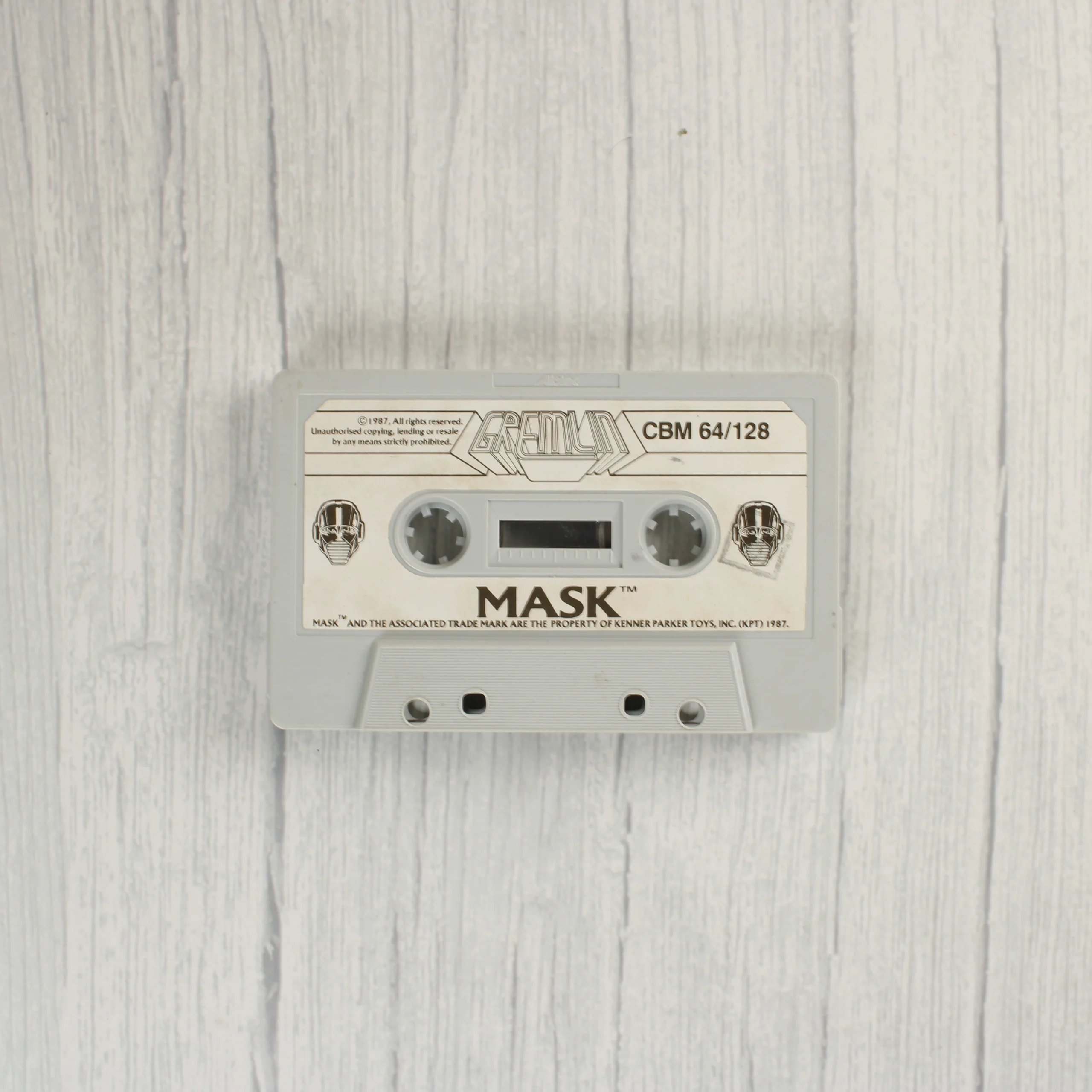 A M.A.S.K. című videójáték Commodore 64 és 128 platformokra kiadott változata. A csomag tartalmazza az eredeti műanyag tokot a színes borítóval, valamint a szürke színű mágnesszalagos kazettát. A borítón a sorozat jellegzetes karakterei, maszkjai és járművei láthatóak, köztük a Thunderhawk és a Condor. A hátoldalon angol nyelvű leírás és képernyőmentések találhatók a játékról. A kazetta címkéje fehér, fekete feliratokkal és a Gremlin Graphics logójával. A termék az 1980-as évek végéről származik, a Kenner Parker Toys licence alapján készült.