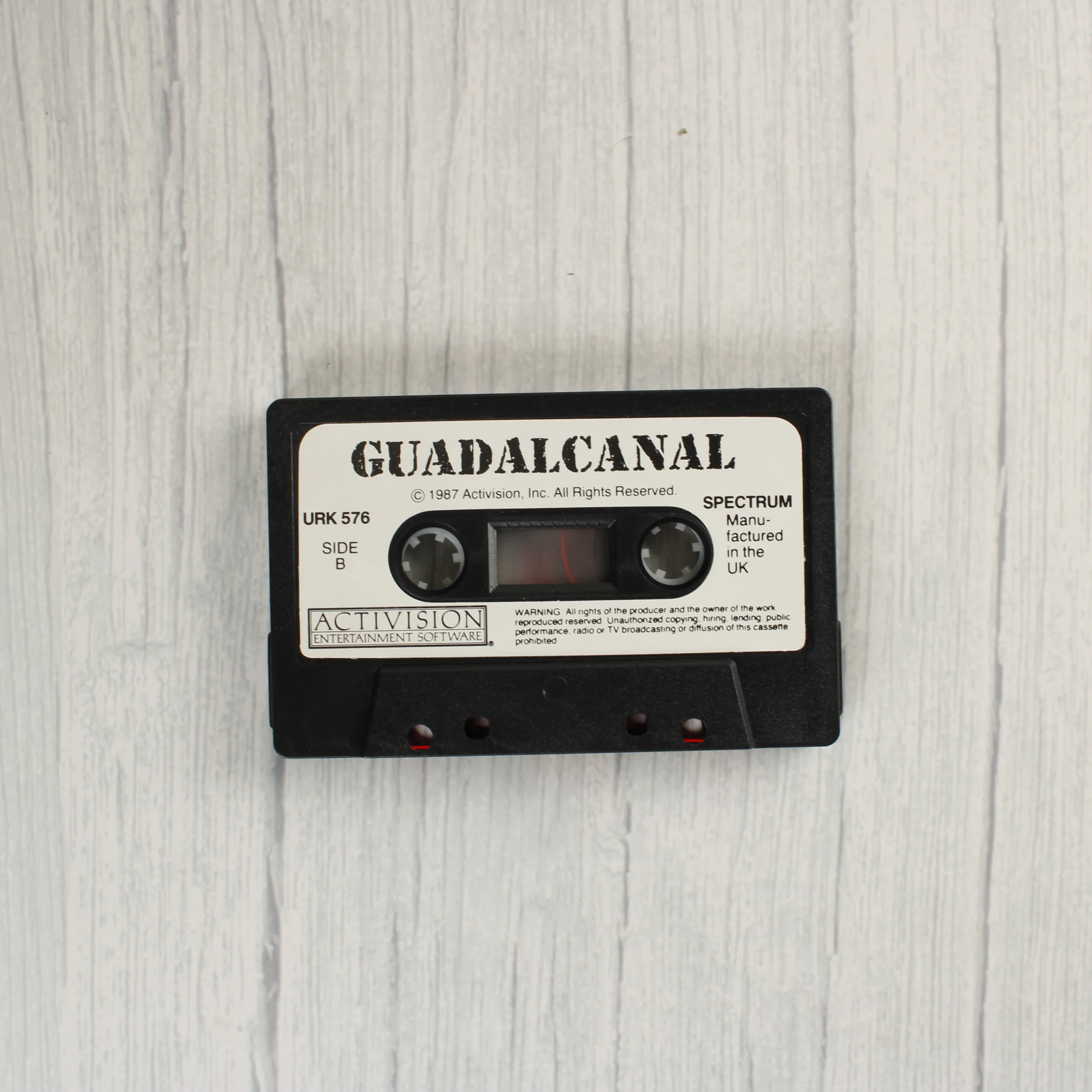 A Guadalcanal egy stratégiai videójáték ZX Spectrum 48K és 128K számítógépekhez. A termék egy normál műanyag tokban található, amely tartalmazza a színes borítót és egy fekete színű mágnesszalagos kazettát. A borító elején egy háborús jelenetet ábrázoló fekete-fehér fotó látható, piros betűs címmel és az Activision logójával. A hátoldalon angol nyelvű leírás és képernyőmentések találhatók a játékról. A kazetta fehér címkéjén jól olvasható a játék címe, a kiadó neve és a gyártási adatok. A tokon és a papírborítón az idő múlására utaló enyhe kopások és karcolások láthatók, de a szalag és a címke épnek tűnik.
