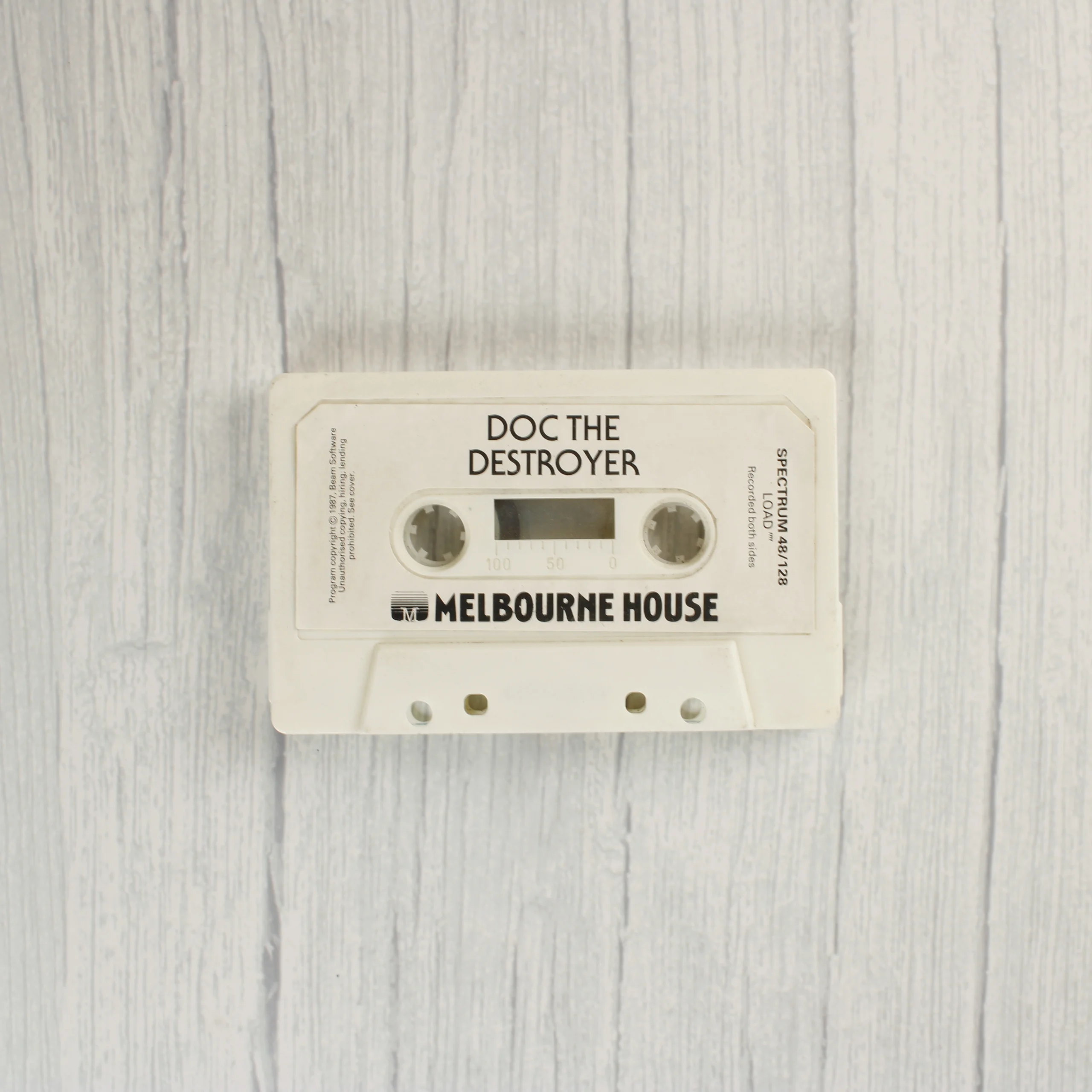 A Doc the Destroyer című videójáték ZX Spectrum 48/128 platformra kiadott változata. A csomag tartalmazza az eredeti műanyag tokot, a színes borítót és a fehér színű mágnesszalagos kazettát. A borító elején egy kigyúrt, vörös köpenyes harcos látható, aki egy buzogányt tart a kezében. A hátoldalon angol nyelvű leírás és játékmenetből származó képernyőfotók találhatók. A kazettán fekete felirat jelzi a címet és a Melbourne House kiadót. A tok átlátszó műanyagból készült, a borító papírja enyhén sárgult az élek mentén. A termék fizikai adathordozón tárolt szoftver, amely a nyolcvanas évek otthoni számítógépes korszakát idézi.