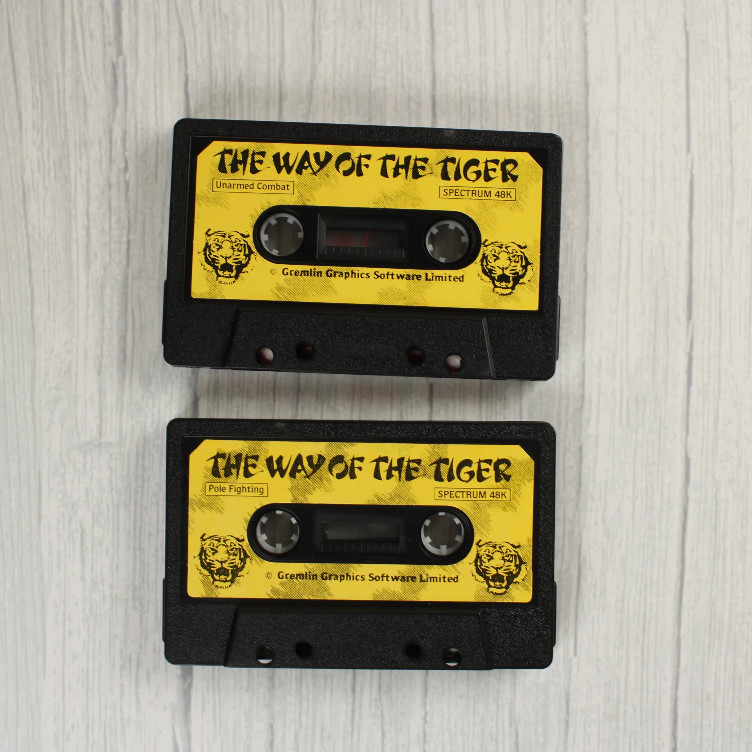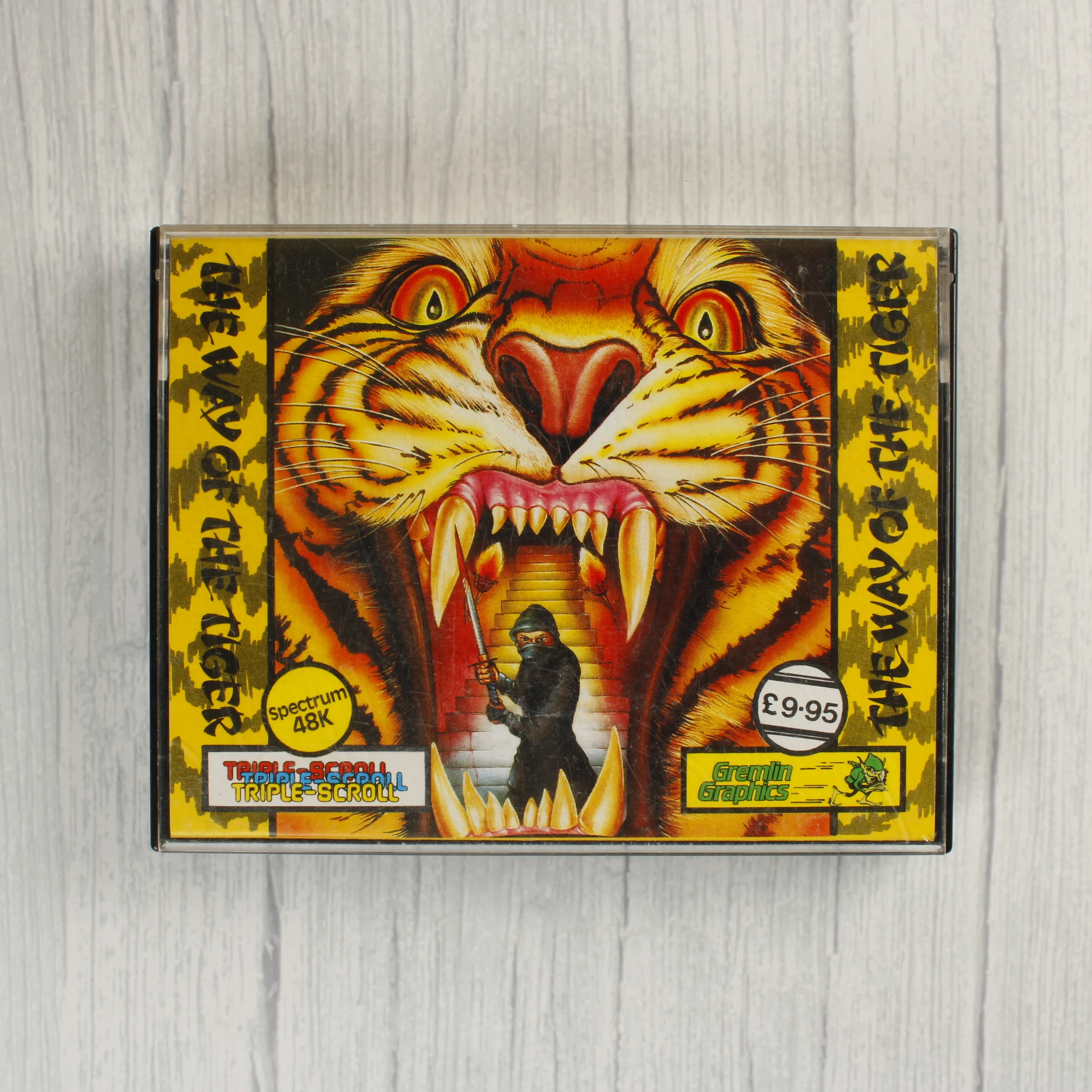 A Gremlin Graphics által kiadott The Way of the Tiger videójáték ZX Spectrum 48K platformra. A csomag két darab fekete műanyag kazettát tartalmaz, sárga alapú címkékkel, amelyeken a játék címe és tigrisfej illusztrációk láthatók. Az egyik kazetta az Unarmed Combat, a másik a Pole Fighting játékmódot tartalmazza. A szoftver egy normál méretű, átlátszó előlappal és fekete hátlappal rendelkező műanyag tokban található. A borítókép egy vicsorgó tigrist és egy karddal felfelé haladó nindzsát ábrázol sárga és narancssárga színekben. A tok hátoldalán vonalkód és az 1986-os szerzői jogi információk láthatók. A termék korának megfelelő, megkímélt állapotban van.