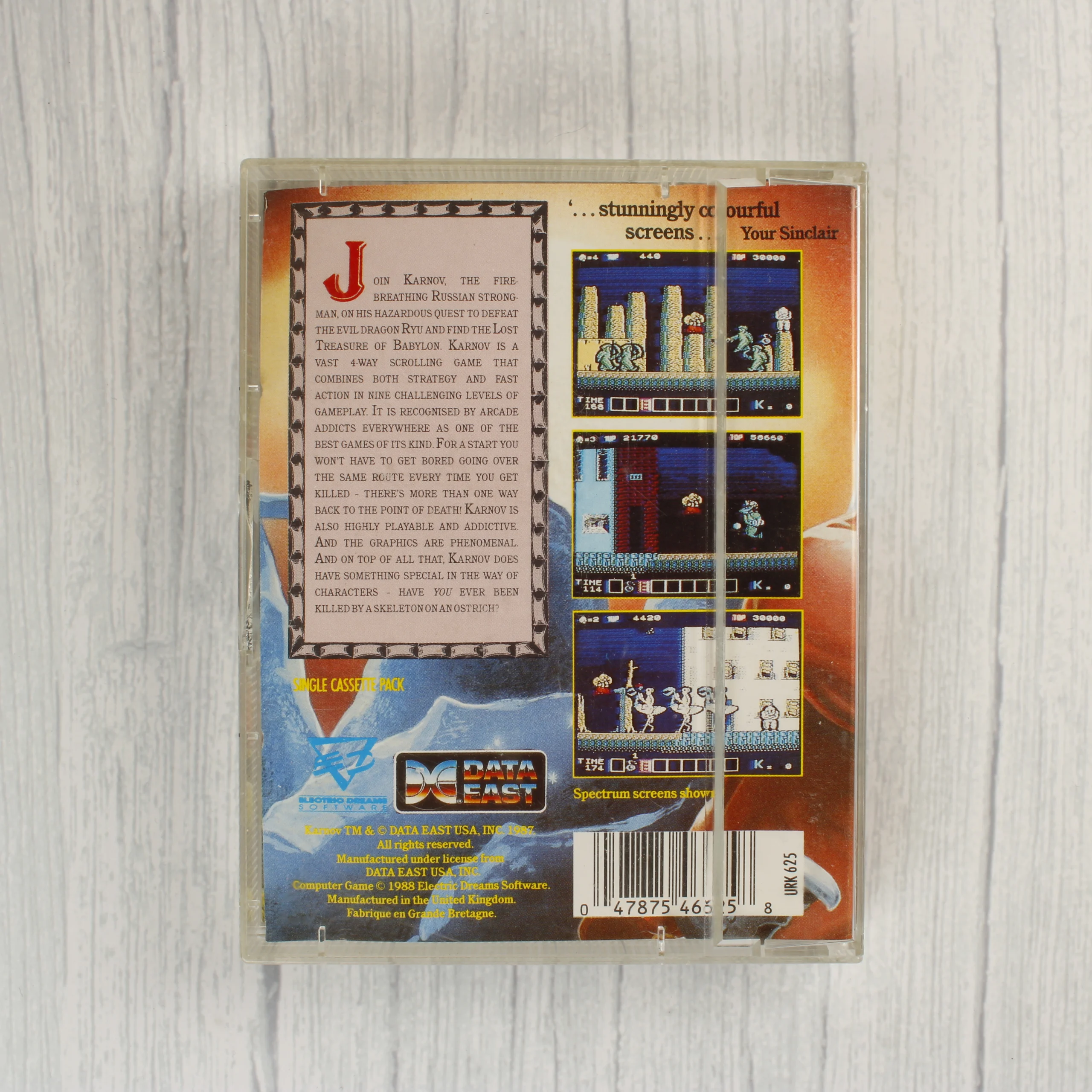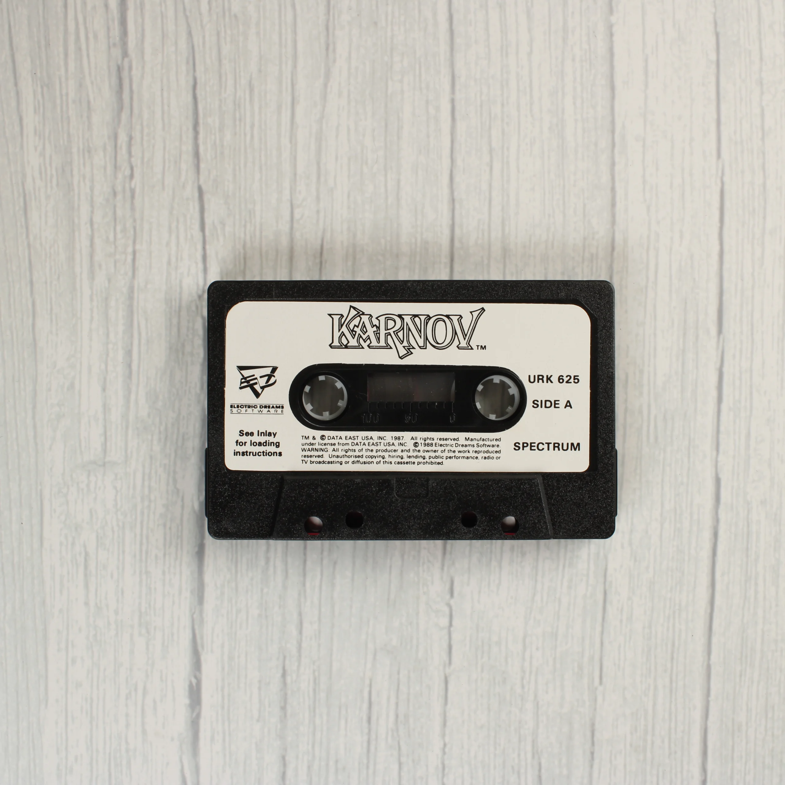 A Karnov című videójáték ZX Spectrum platformra készült kiadása. A csomag tartalmazza az eredeti műanyag tokot, a színes borítót és egy fekete színű mágnesszalagos kazettát. A borító előlapján egy izmos, félmeztelen harcos látható, amint egy sárkányszerű lénnyel küzd. A hátoldalon angol nyelvű leírás és három színes játékmenet-fotó szerepel. A kazetta fehér címkével rendelkezik, amelyen a játék címe, a kiadó logója és a technikai adatok olvashatók. A termék a Data East és az Electric Dreams Software gondozásában jelent meg. A tok és a borító állapota megkímélt, a kazetta címkéje tiszta és ép.