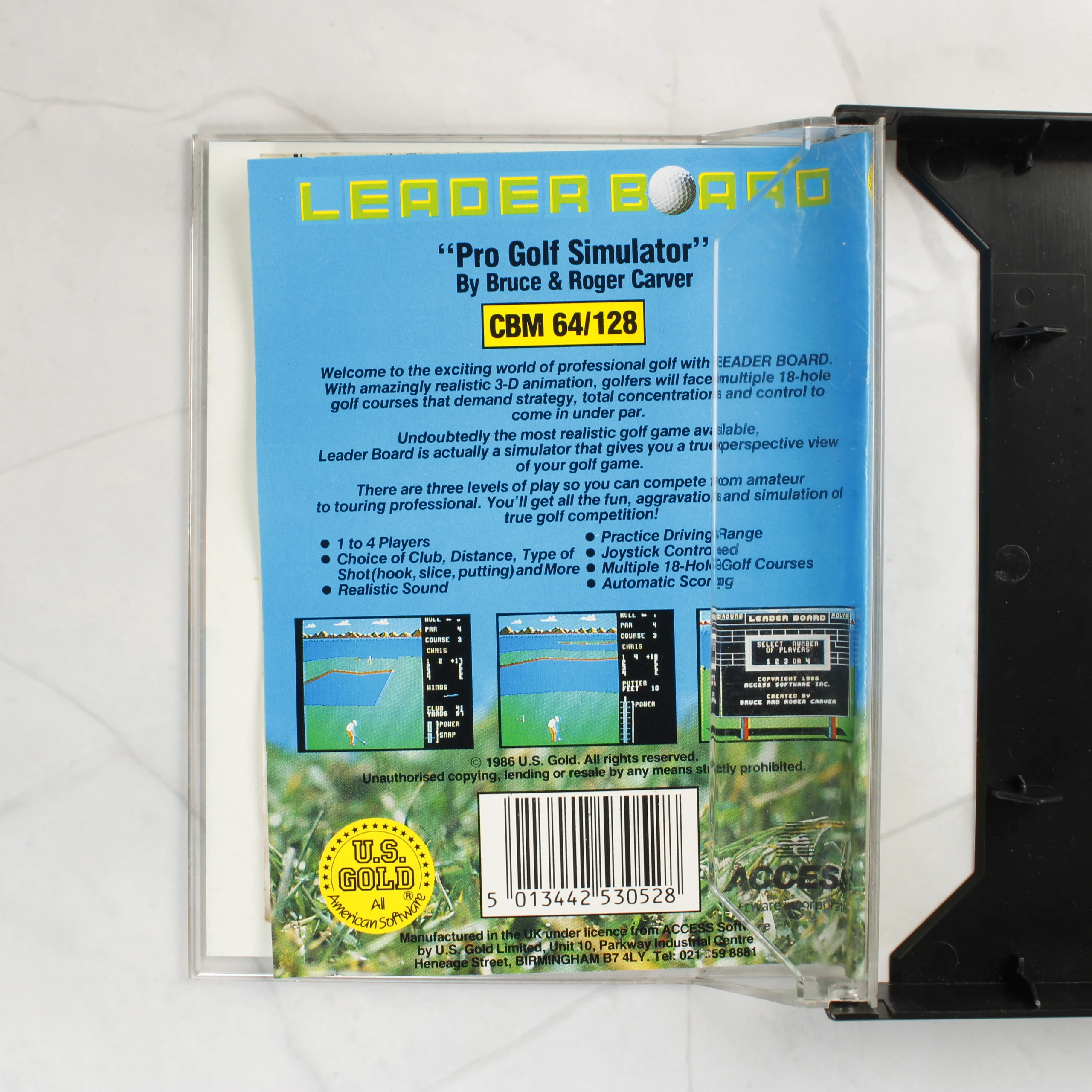 A Leader Board című videójáték Commodore 64 és 128 rendszerekhez készült kiadása. A csomag egy fekete műanyag tokot, egy színes papírborítót és egy mágnesszalagos kazettát tartalmaz. A borítón egy golflabda és egy ütő látható kék háttér előtt, rajta a U.S. Gold logója és a ZZAP!64 aranyérmes elismerése. A kazetta fekete színű, fehér címkével, amelyen a játék címe és a gép típusmegjelölése szerepel. A hátoldali borítón angol nyelvű leírás és képernyőmentések láthatóak a játékmenetről. A termék használt, a papírborítón és a kazetta címkéjén enyhe sárgulás és kopás nyomai fedezhetőek fel.