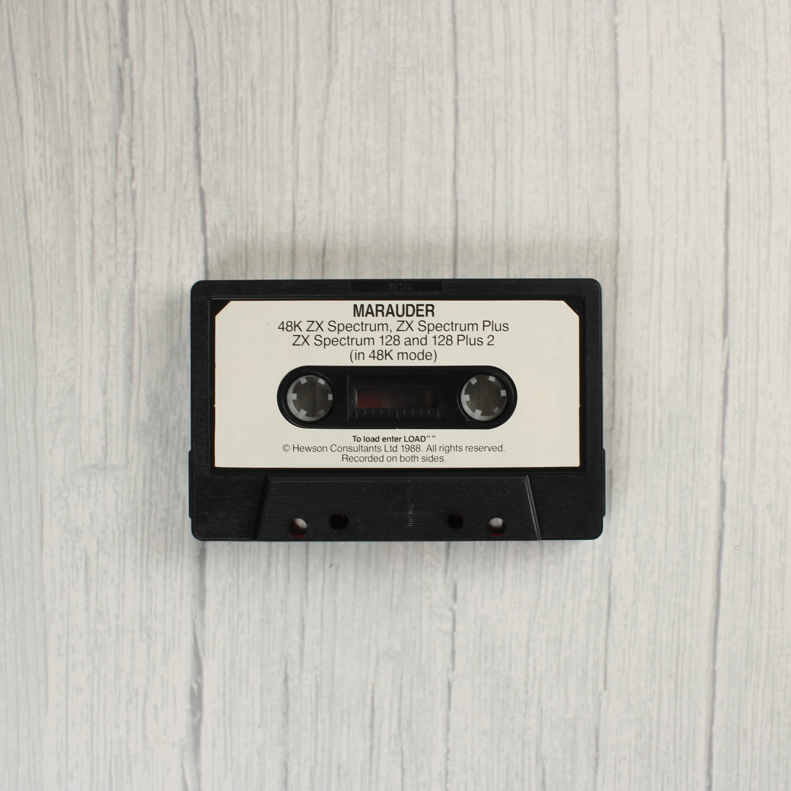 A Marauder című videójáték ZX Spectrum platformra kiadott változata. A csomag tartalmazza az eredeti műanyag tokot, a színes borítót és a fekete színű mágnesszalagos kazettát. A borító előlapján egy sárga, felfegyverzett terepjáró látható akció közben, vörös és narancssárga háttér előtt. A hátoldalon három képernyőkép mutatja be a játékmenetet, valamint a technikai információk és a Hewson kiadó logója is szerepel. A kazettán fehér címke található, amelyen a játék címe, a kompatibilis géptípusok (48K/128K) és a betöltési utasítás olvasható. A tok átlátszó műanyagból készült, amely védi a papírborítót és az adathordozót.