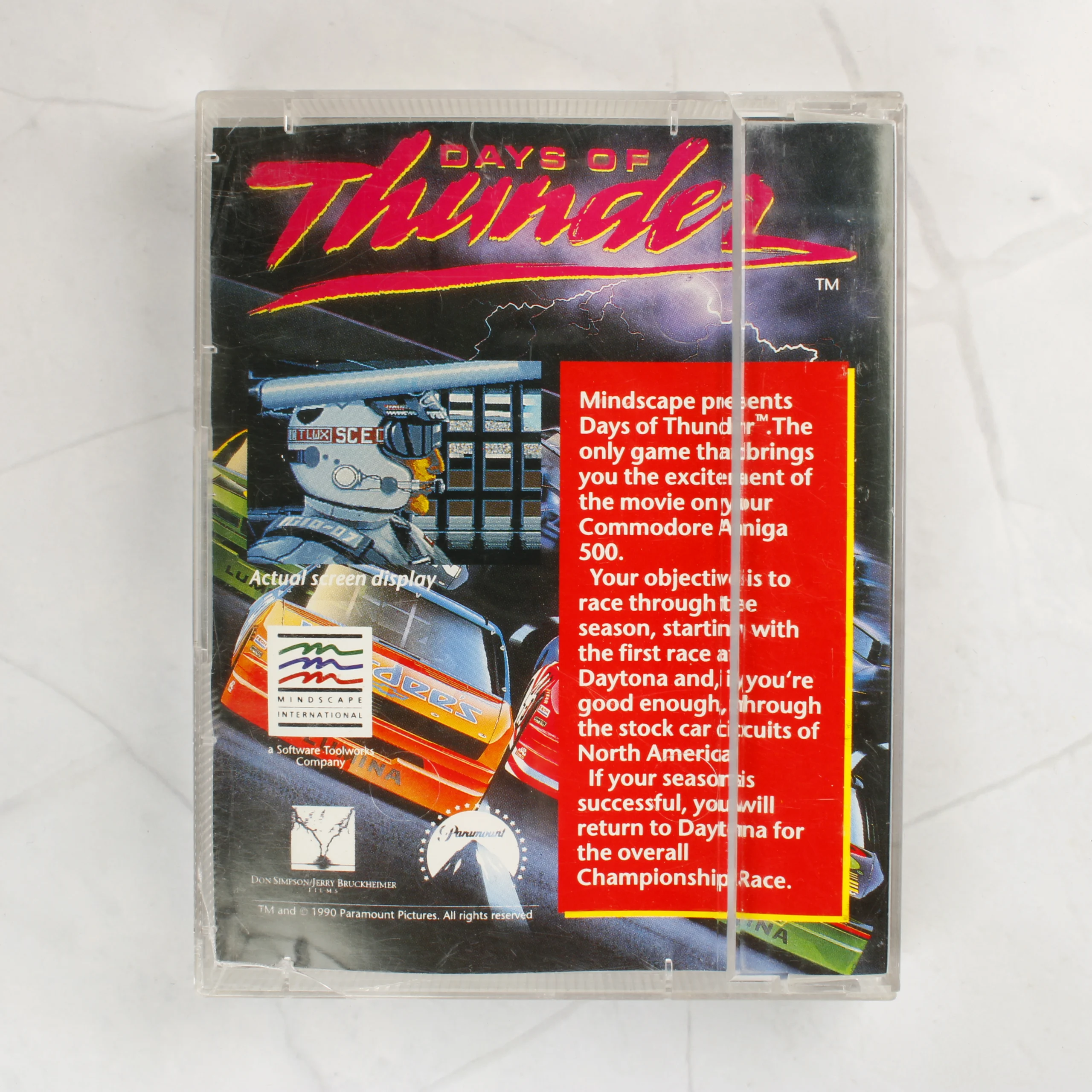 A Days of Thunder című videójáték Amiga platformra készült kiadása. A csomag tartalmaz egy 3,5 colos kék színű floppy lemezt és egy átlátszó műanyag tokot a hozzá tartozó színes borítóval. A borító előlapján versenyautók láthatók, a hátoldalon pedig angol nyelvű leírás és egy képernyőkép olvasható. A Mindscape International által kiadott szoftver az 1990-es Paramount Pictures film alapján készült. A floppy lemez címkéje fehér alapon fekete és piros feliratokat, valamint a Paramount és a Mindscape logóit tartalmazza. A fizikai hordozó és a papírborító állapota megkímélt, a műanyag tokon apróbb felületi karcok láthatók.