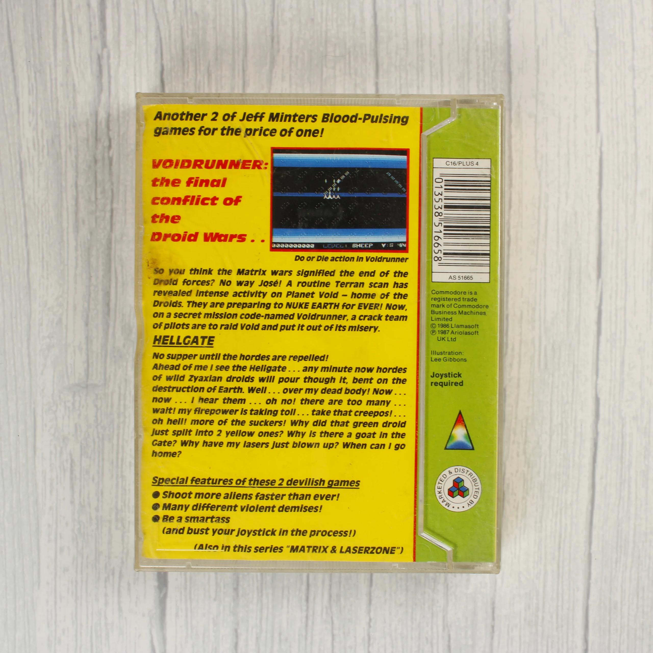 A Commodore 16 és Plus 4 platformokra készült Voidrunner + Hellgate videójáték gyűjtemény, amely egy átlátszó műanyag tokban elhelyezett magnókazettát tartalmaz. A borítón Jeff Minter neve és a Llamasoft logója látható, központi eleme egy vörös űrhajó illusztrációja sárga-fekete sávos keretben. A hátoldalon sárga alapon olvasható a két játék leírása, egy képernyőkép a Voidrunnerből, valamint a vonalkód és a technikai adatok. A kazetta átlátszó házas, rajta fekete feliratokkal, amelyek jelzik a játékok címét és a betöltési utasításokat. A csomagolás és a hordozófelület a korának megfelelő, használt állapotban van.