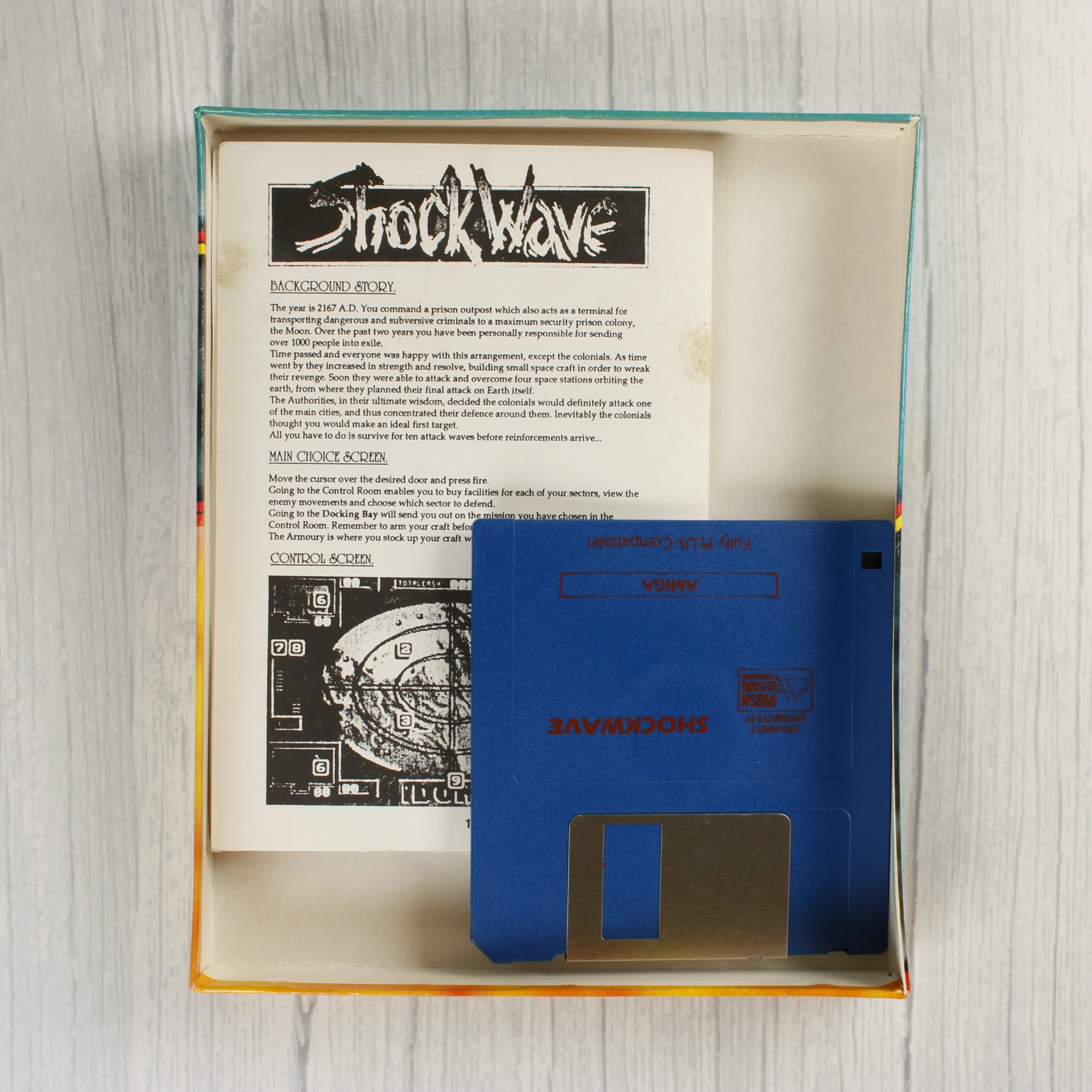 A Shockwave című videójáték Amiga platformra készült kiadása, eredeti kartondobozos csomagolásban. A doboz előlapján a játék címe, a Prism Leisure Corporation logója és egy sivatagi tájat ábrázoló grafika látható teliholddal. A csomag tartalmaz egy 3,5 colos kék színű floppy lemezt, amelyen piros felirat jelzi a játék nevét és a platformot. Mellékelve van egy fekete-fehér nyomtatású használati útmutató is, amely a háttértörténetet és az irányítást ismerteti. A doboz hátoldalán színes képernyőmentések láthatók a játékból, valamint angol és német nyelvű leírások olvashatók. A kiadvány 1993-as dátumozású, és a Prism Leisure Corporation gondozásában jelent meg.
