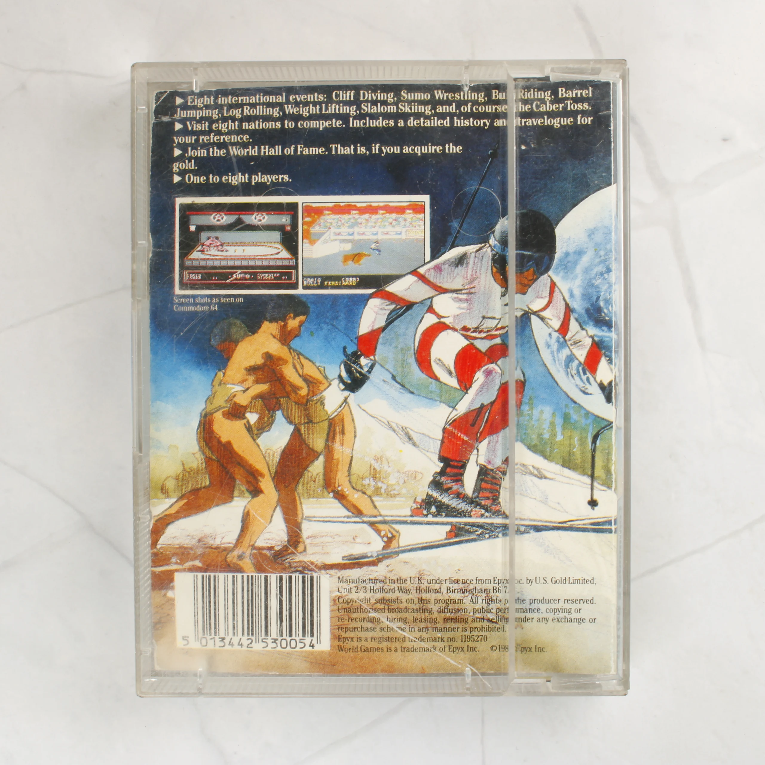 A World Games című videójáték Commodore 64 és 128 rendszerekre készült kiadása. A csomag egy átlátszó műanyag tokot, egy színes borítót és egy fekete színű mágnesszalagos kazettát tartalmaz. A borítón különféle sportágakat ábrázoló illusztrációk láthatók, mint például a bikagolás, síelés és rönkhajítás. A kazetta címkéje krémszínű, rajta fekete feliratokkal és az Epyx, valamint az U.S. Gold logójával. A tok hátoldalán angol nyelvű leírás és képernyőmentések találhatók a játékból. A termék fizikai állapota korának megfelelő, a papírborítón és a kazetta címkéjén enyhe elszíneződés és kopás nyomai fedezhetők fel.