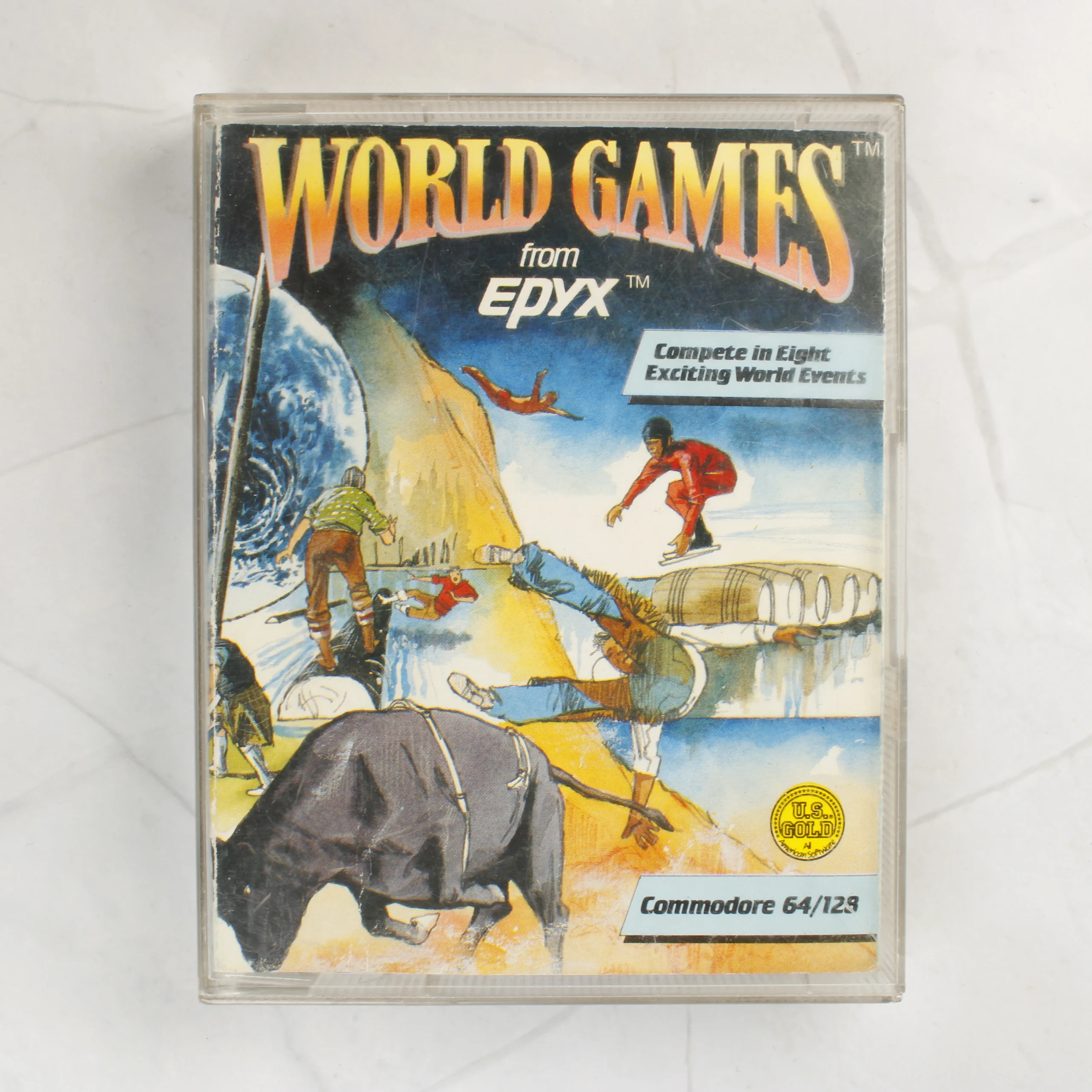 World Games videójáték Commodore 64 és 128 számítógépekhez, eredeti kazettás formátumban, Epyx és U.S. Gold kiadásban.