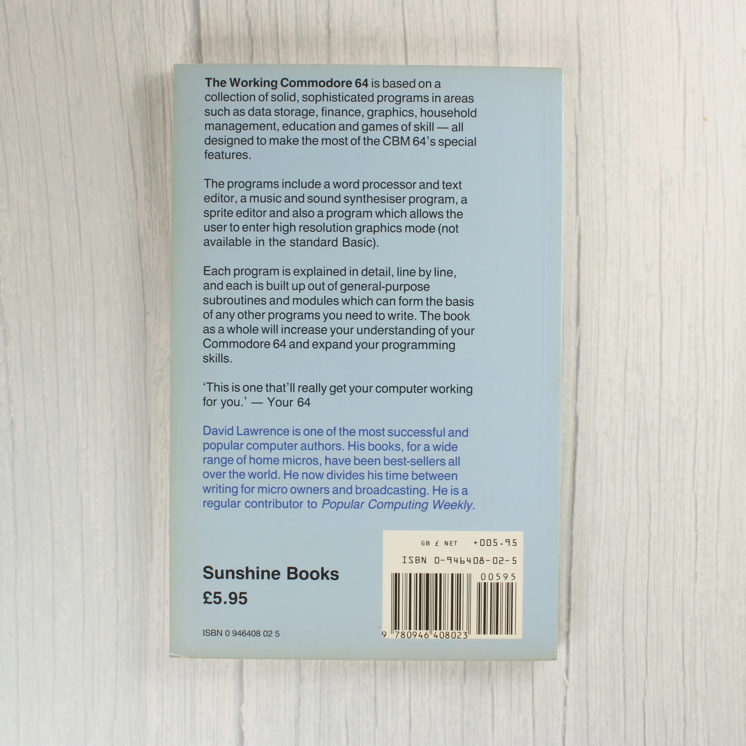 A The Working Commodore 64 egy David Lawrence által írt szakkönyv, amely a Commodore 64 számítógéphez kínál programokat és szubrutinokat. A puhafedeles könyv borítója világoskék alapszínű, rajta a gép fotójával és sárga grafikai elemekkel. A hátoldalon részletes leírás olvasható a tartalomról, valamint látható a Sunshine Books kiadó logója, az árazás és az ISBN azonosító. A borító élei és sarkai enyhén kopottak, de a papír nem szakadt, és nincsenek rajta jelentős gyűrődések. A gerinc ép, a kötés stabilnak tűnik. A nyomtatás tiszta, a színek nem fakultak el jelentősen.