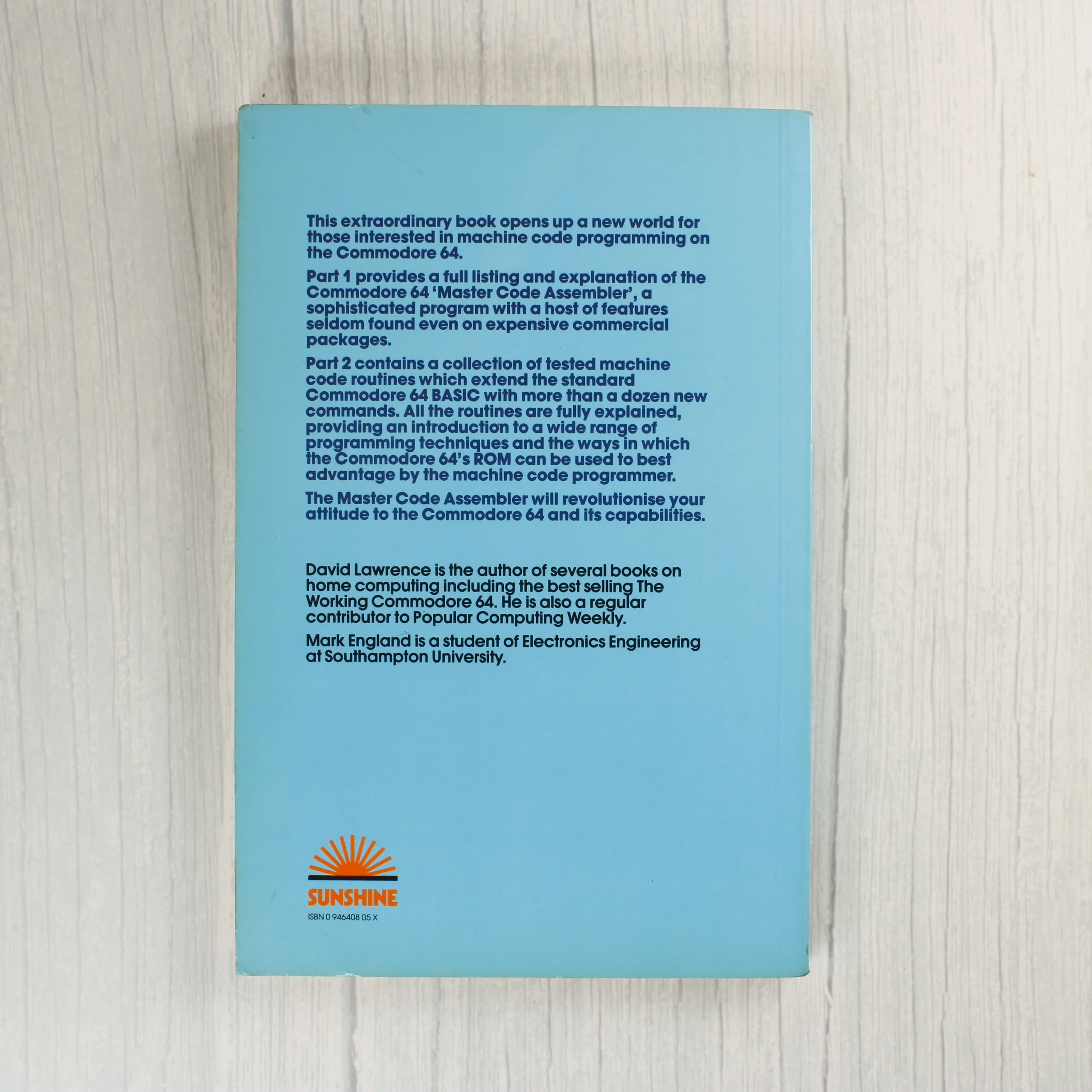 A Commodore 64 machine code master egy puhafedeles szakkönyv, amely a Commodore 64 gépi kódú programozásába vezeti be az olvasót. A borító világoskék alapszínű, rajta egy sci-fi stílusú illusztráció látható, amely egy űrhajót és lebegő számokat ábrázol a naplemente felett. A szerzők David Lawrence és Mark England. A hátoldalon angol nyelvű ismertető szöveg olvasható a könyv tartalmáról, valamint a Sunshine kiadó logója és az ISBN azonosító is itt található. A könyv gerince és sarkai enyhén kopottak, de a kötés épnek tűnik. A papírborítón apróbb felületi karcok és használati nyomok láthatók, a széleken minimális elszíneződéssel.