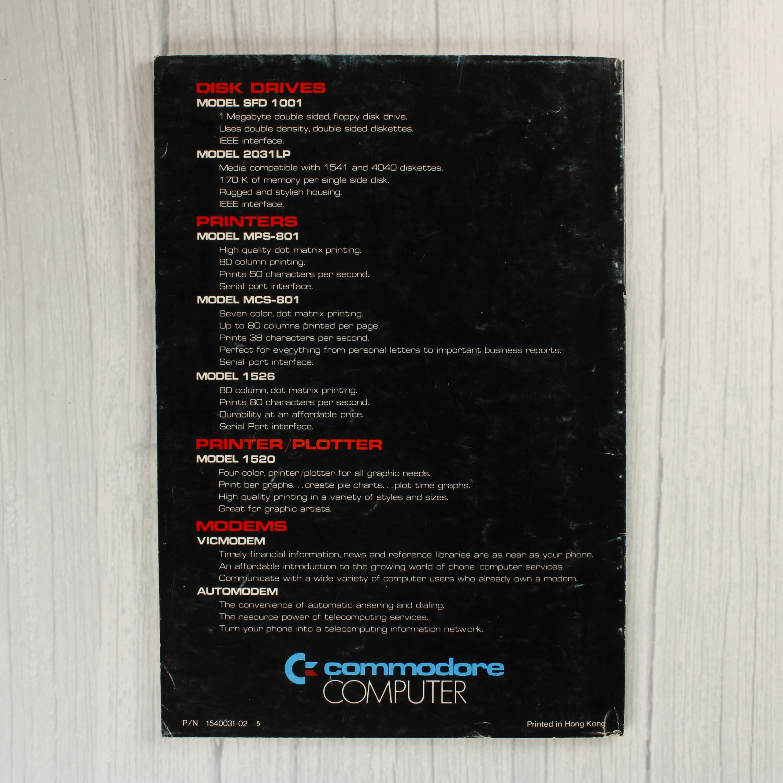 A Commodore 1541 Disk Drive eredeti felhasználói kézikönyve. A fekete borítón narancssárga és fehér feliratok láthatók, a központi képen pedig maga a floppy lemez meghajtó szerepel. A füzet puhafedeles, tűzött kötésű. A hátoldalon további Commodore perifériák, például nyomtatók és modemek rövid leírása olvasható. A borító élei mentén enyhe kopás és fehéredés látható, különösen a gerincnél és a sarkoknál. A papír felülete helyenként apró karcokat és használati nyomokat mutat, de a szöveg és az ábrák tisztán kivehetőek. A hátoldalon a bal alsó sarokban a cikkszám is feltüntetésre került.