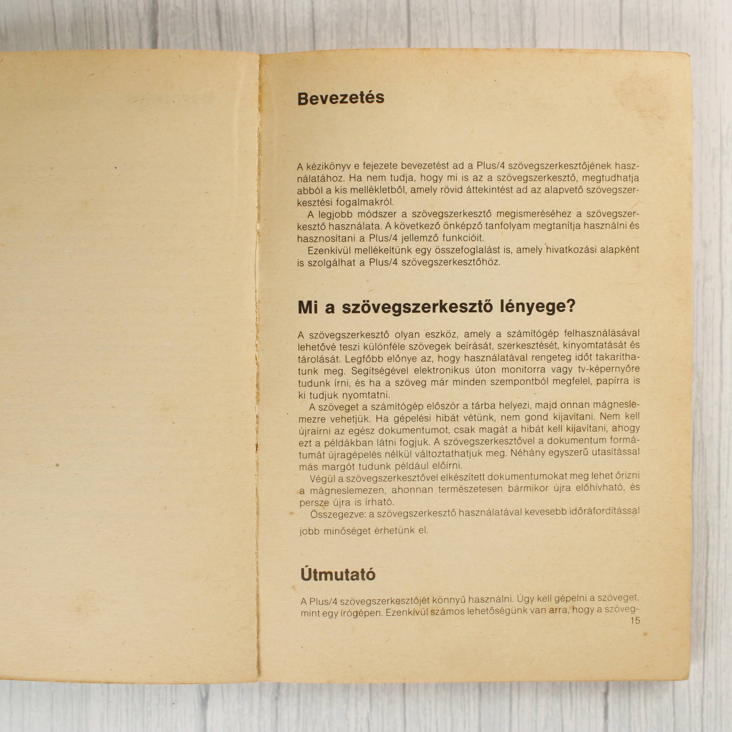 Ez a magyar nyelvű használati útmutató a Commodore Plus/4 számítógép beépített programjainak kezelését ismerteti. A puhafedeles kiadvány borítóján a számítógép fotója látható, alatta a grafika, számviteli tömb, szövegszerkesztő és adatbázis-kezelő funkciók felsorolásával. A borítón a Commodore és a Novotrade logója is szerepel. A belső oldalak fekete-fehér szövegezéssel készültek, a papír az idő múlásával enyhén megsárgult. A füzet a szövegszerkesztő használatára és alapvető funkcióira fókuszál, részletes útmutatást nyújtva a korabeli felhasználók számára. A borító élei mentén apróbb kopások és használati nyomok figyelhetők meg.