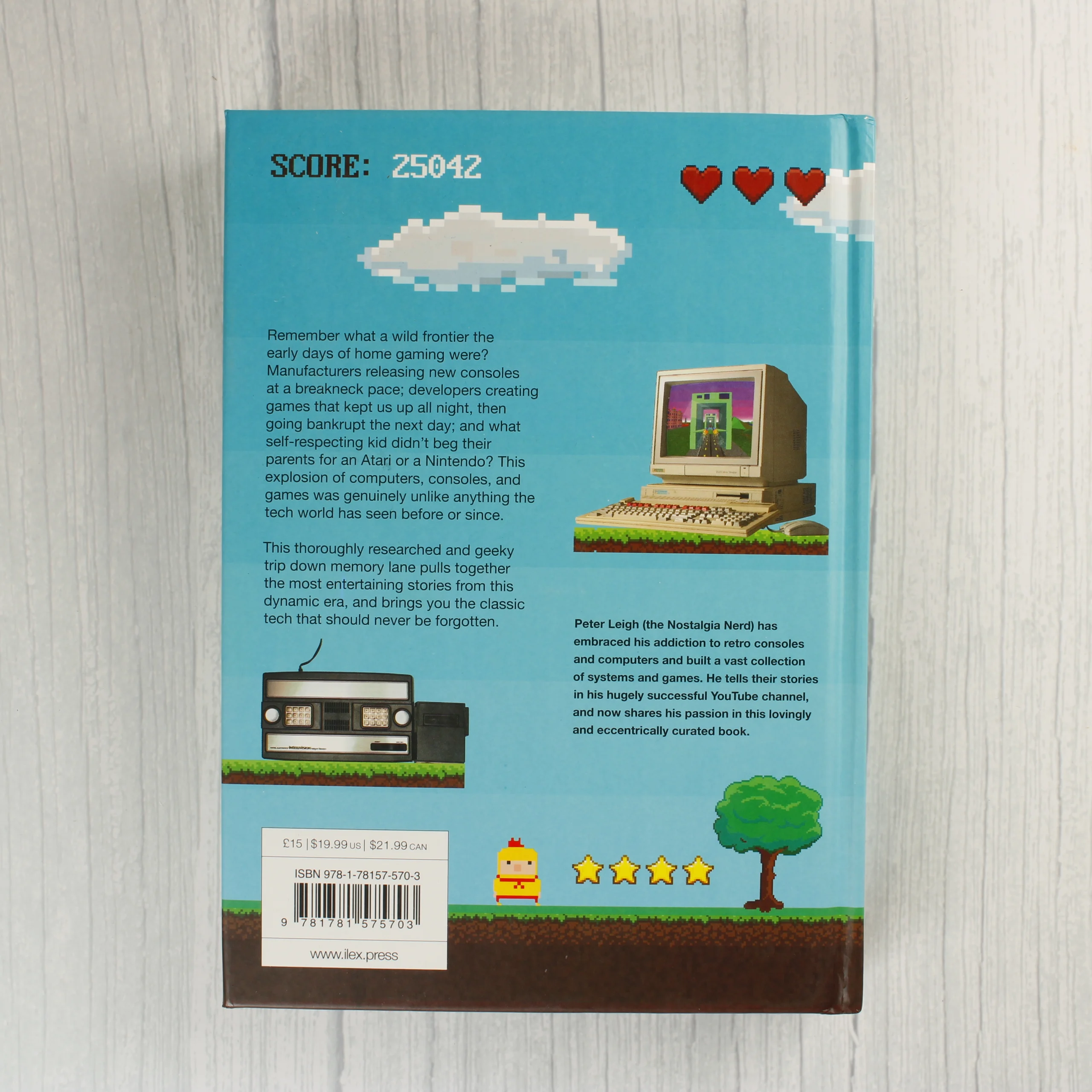 A termék Peter Leigh, ismertebb nevén The Nostalgia Nerd által írt keménytáblás könyv, amely a retro számítástechnika világát mutatja be. A borító világoskék alapszínű, pixelgrafikus stílusú illusztrációkkal, amelyek klasszikus játékkonzolokat, számítógépeket és videójáték-karaktereket ábrázolnak. A címlapon látható többek között egy Commodore 64, egy NES konzol és egy ZX Spectrum is. A hátoldalon angol nyelvű ismertető szöveg, egy pontszámot imitáló felirat, szívecskék és egy vonalkód található. A könyv fizikai állapota megkímélt, a sarkok épek, a borító felülete tiszta és fényes. A kötés szoros, nincsenek rajta látható szakadások vagy jelentős kopásnyomok.