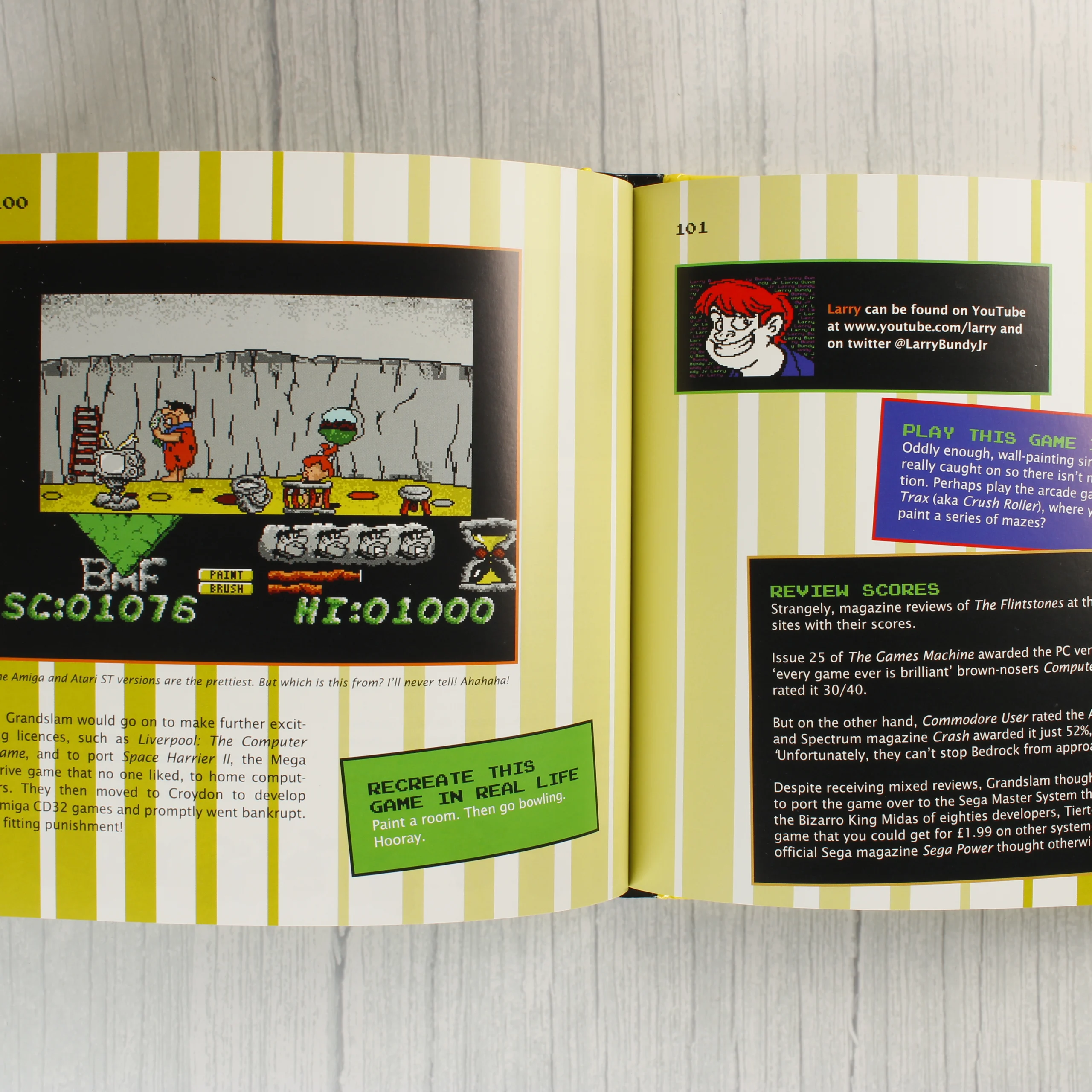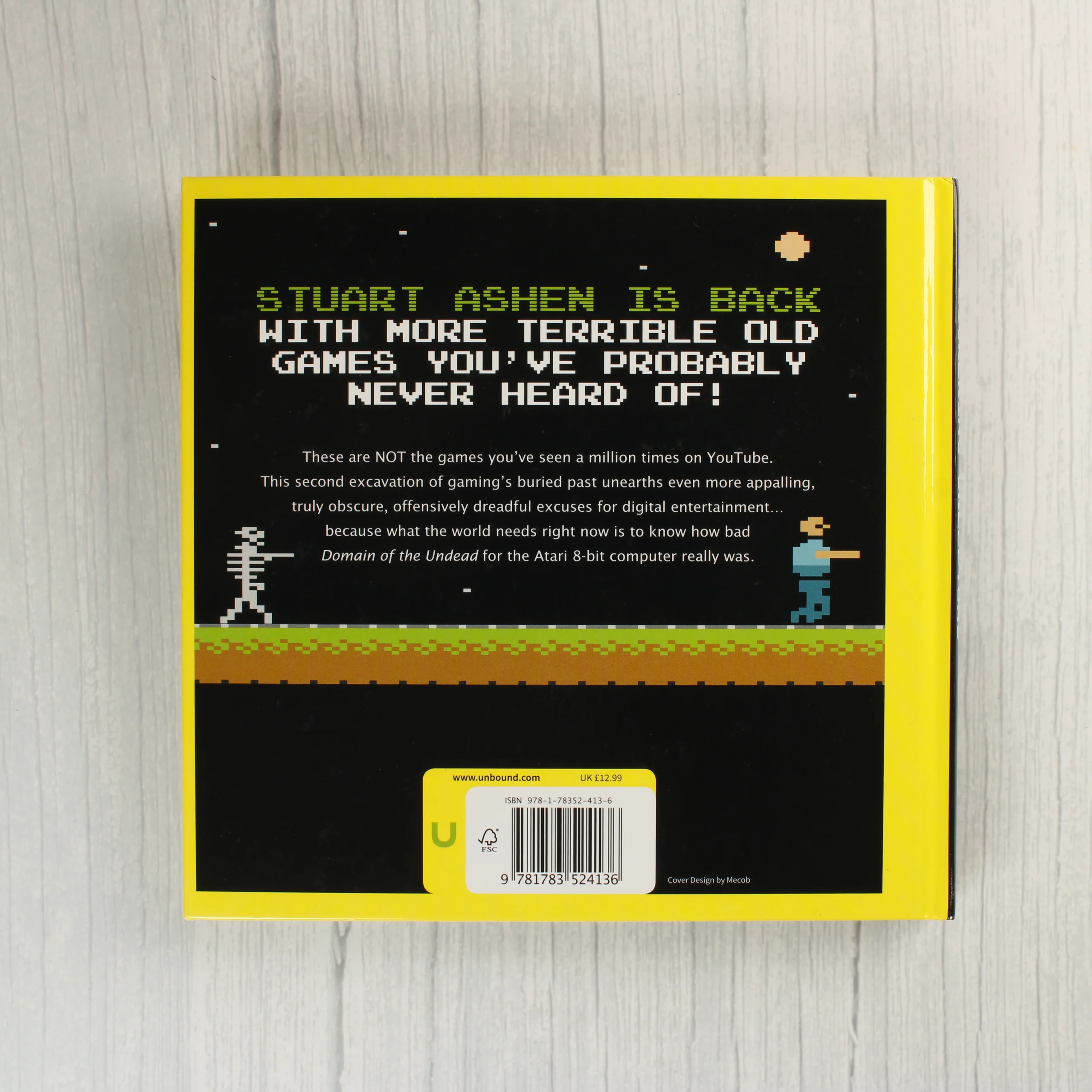 Stuart Ashen Attack of the Flickering Skeletons című könyve, amely elfeledett és rossz minőségű régi videójátékokat mutat be. A keménytáblás kötet borítója élénksárga kerettel rendelkezik, közepén egy fekete mezőben pixelgrafikus illusztráció látható, amely csontvázakat és egy menekülő karaktert ábrázol egy 8-bites játékstílusú tájon. A cím és a szerző neve szintén stilizált, pixeles betűtípussal olvasható. A hátoldalon rövid ismertető szöveg, egy vonalkód és az ISBN azonosító található. A belső oldalak színesek, sárga-fehér csíkos háttérrel, képernyőmentésekkel és angol nyelvű leírásokkal illusztráltak. A könyv megkímélt állapotban van, a sarkok épek, a borító felülete tiszta, jelentős kopás vagy sérülés nem látható rajta.