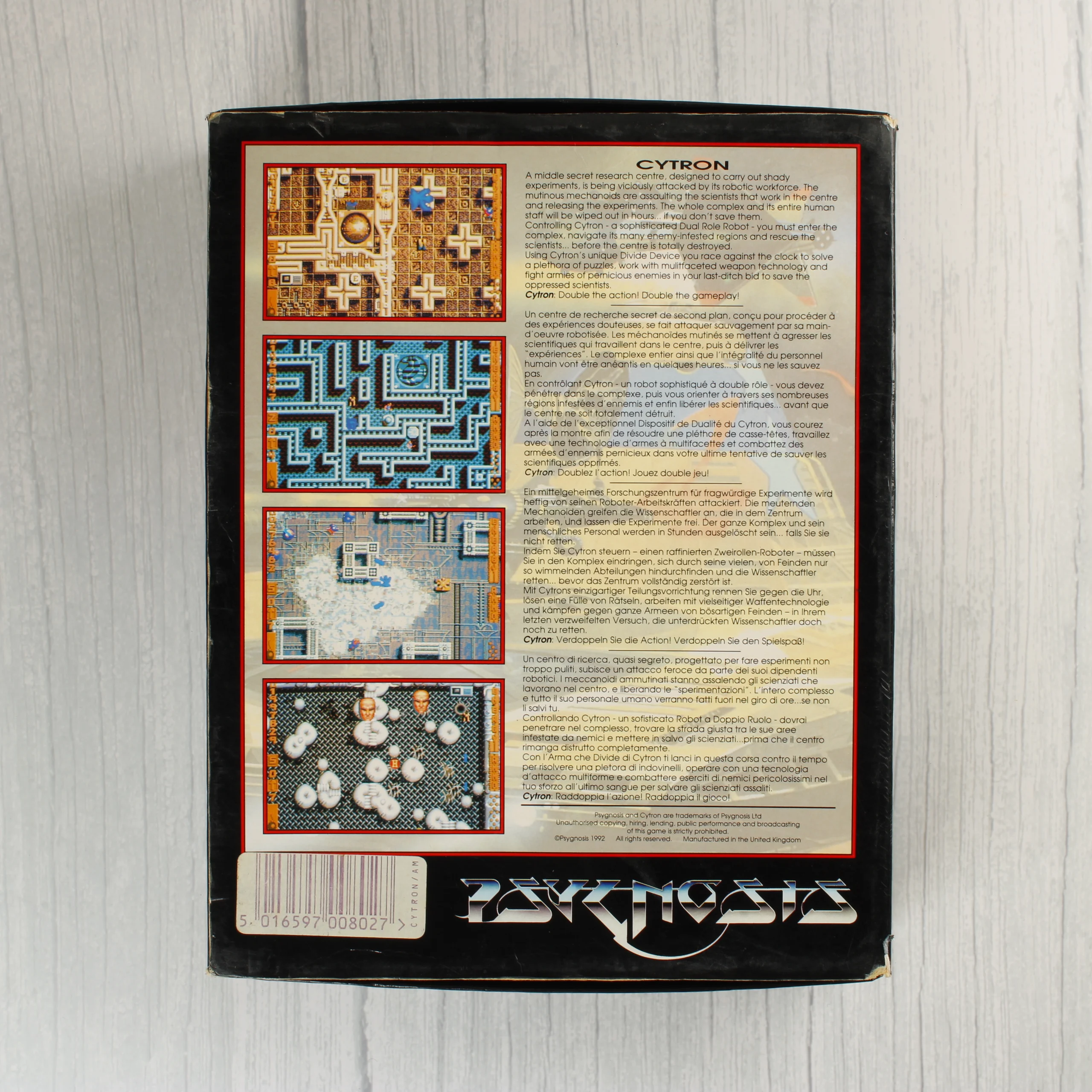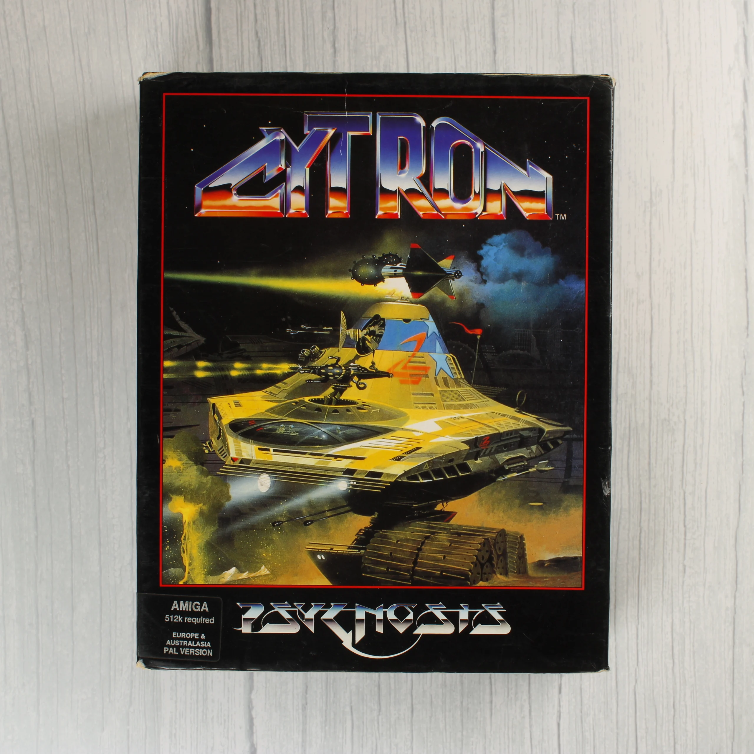 A Cytron című videójáték Amiga platformra kiadott változata, eredeti kartondobozos csomagolásban. A készlet tartalmazza a két darab kék színű, 3,5 colos floppy lemezt, valamint egy élénk narancssárga borítójú használati útmutatót. A doboz elején színes illusztráció látható egy futurisztikus lánctalpas járművel, a hátoldalon pedig négy darab játékmenet-pillanatkép és többnyelvű leírás szerepel. A kiadó a Psygnosis, a termék 1992-es gyártású. A csomagolás fekete alapszínű, a sarkokon és az éleken látható némi kopás, de a doboz szerkezetileg ép.